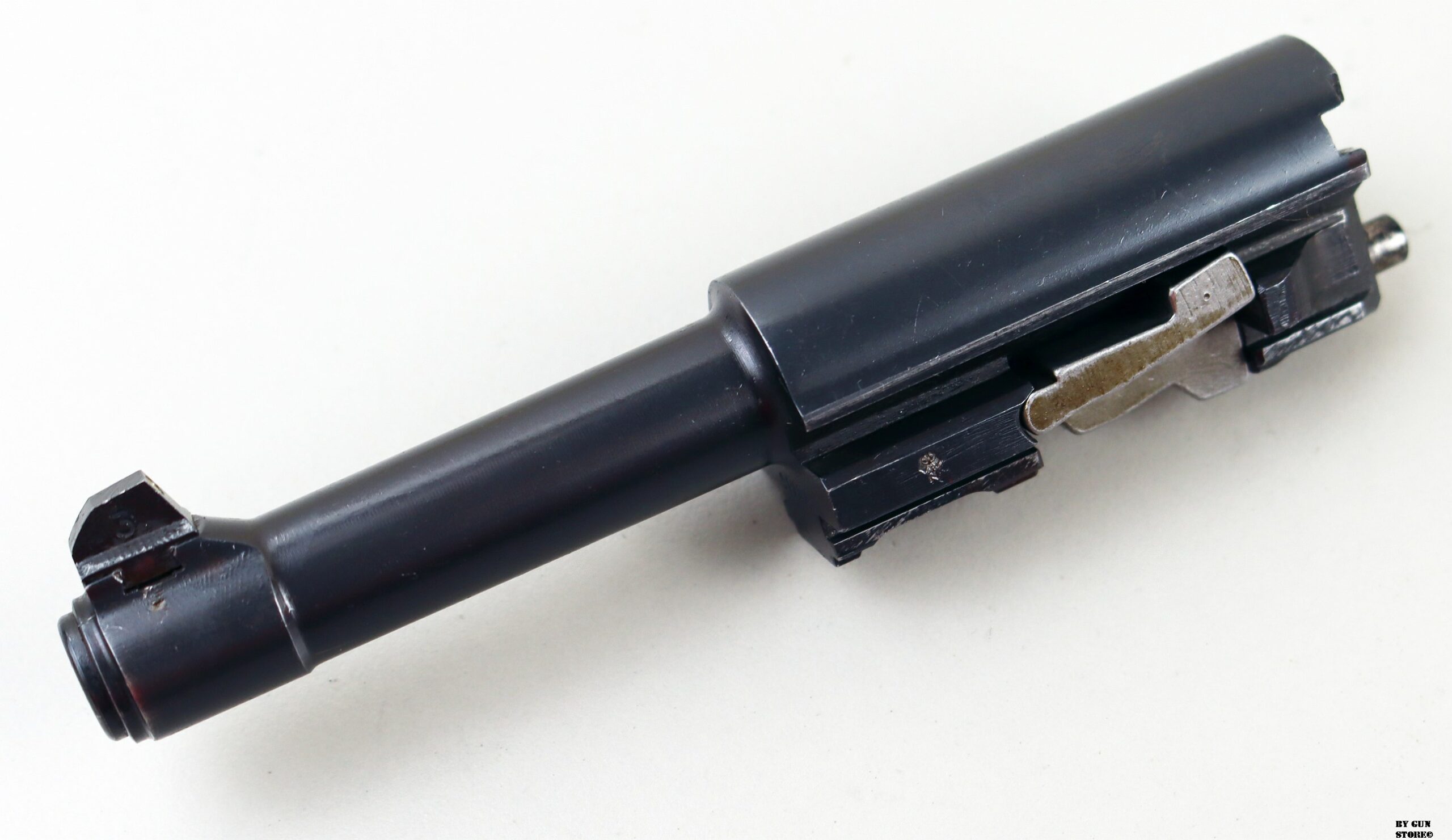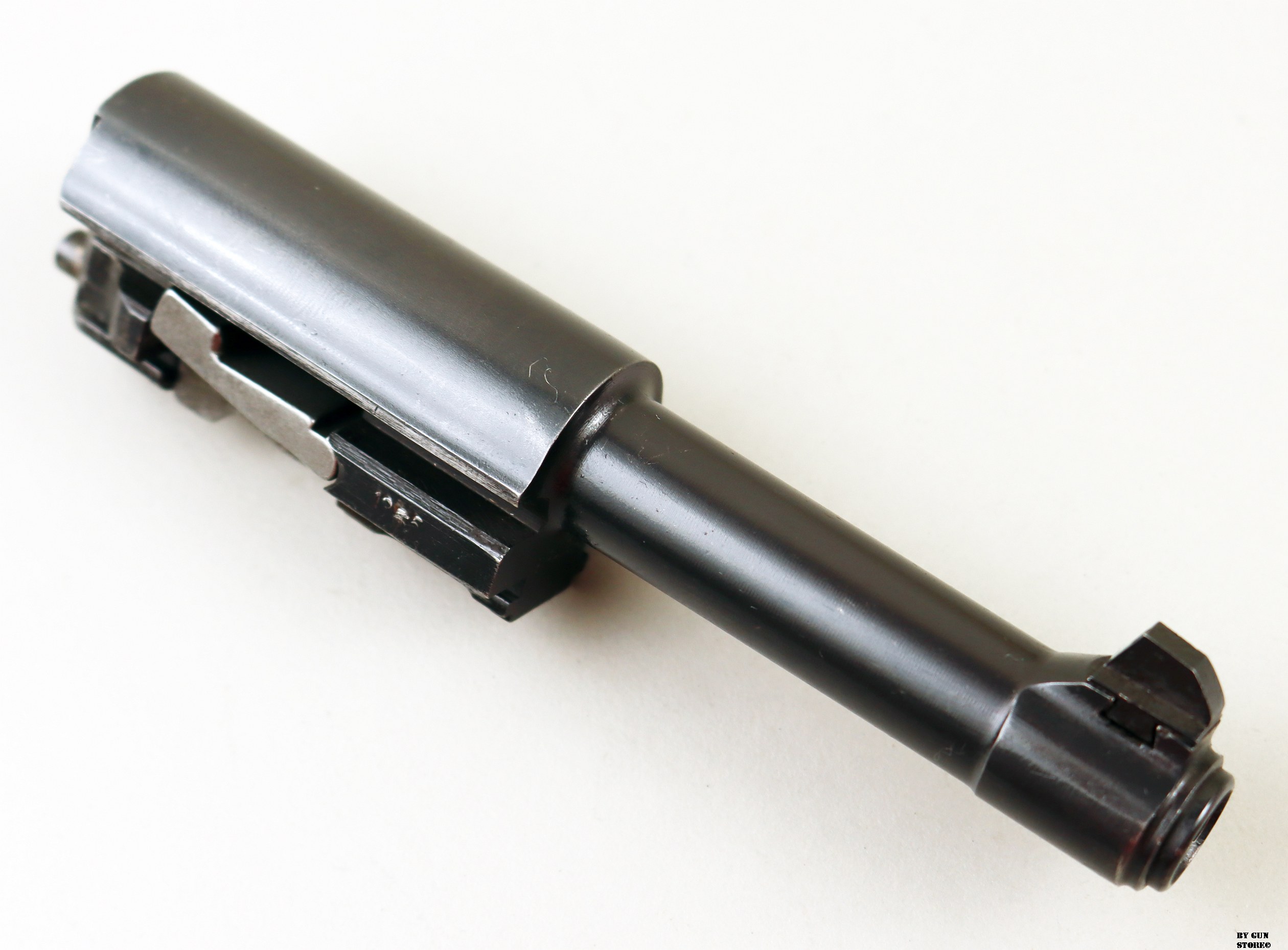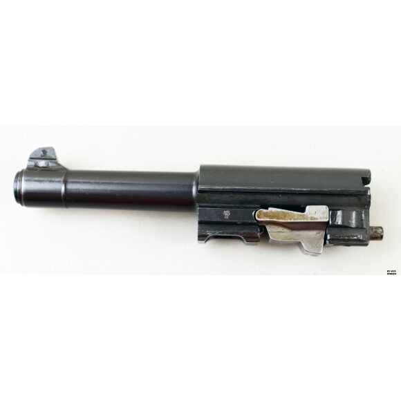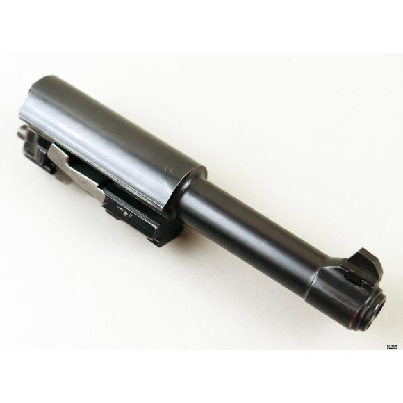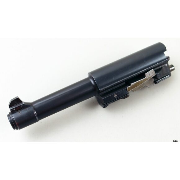 Canna originale Walther prodotta a Ulm per la pistola P38 o P1. Ultima variante con mirino più largo con dot bianco, adottato dopo la matricola 370.000 circa. Canna a specchio con rigature ben definite. Calibro 9×19.