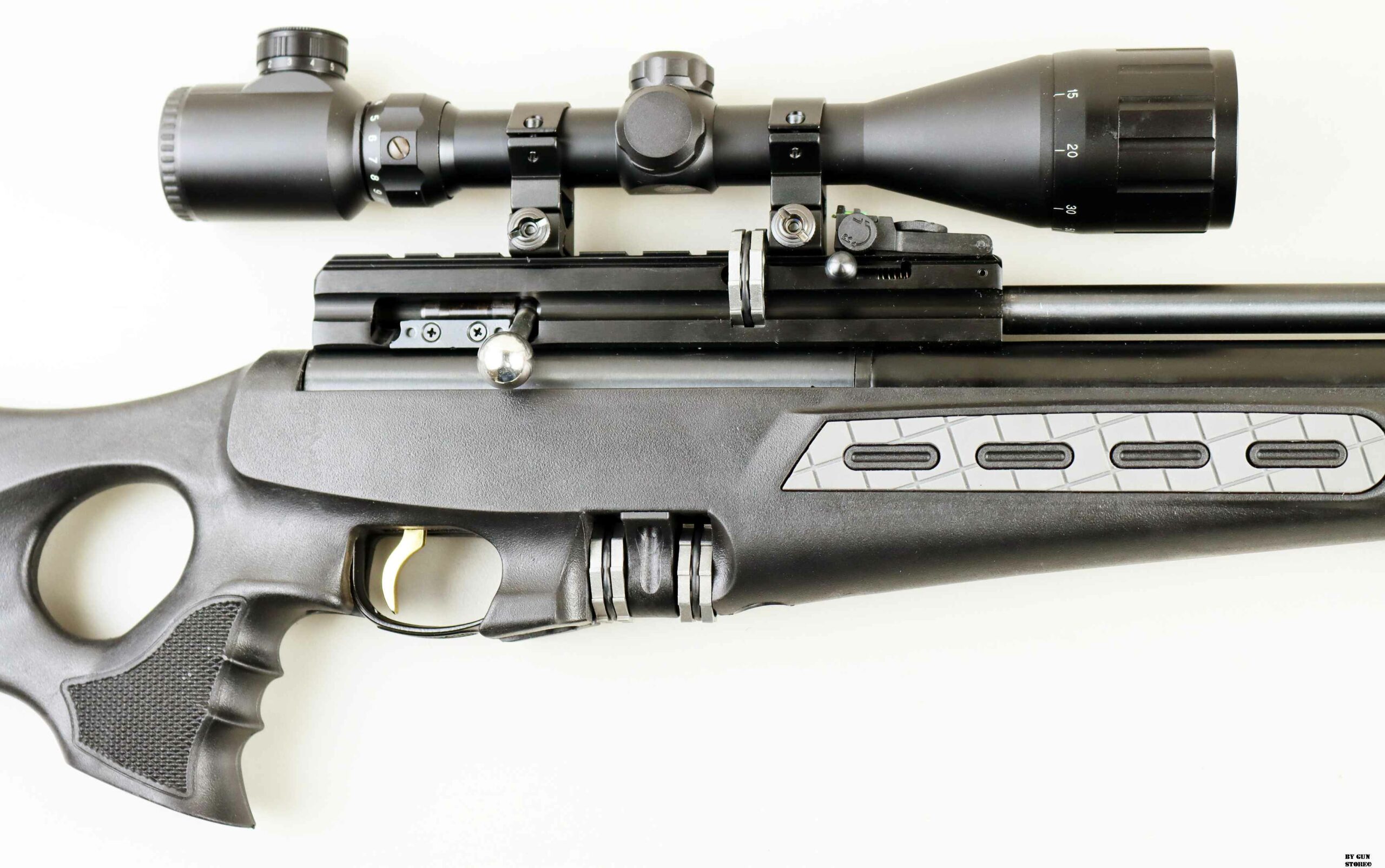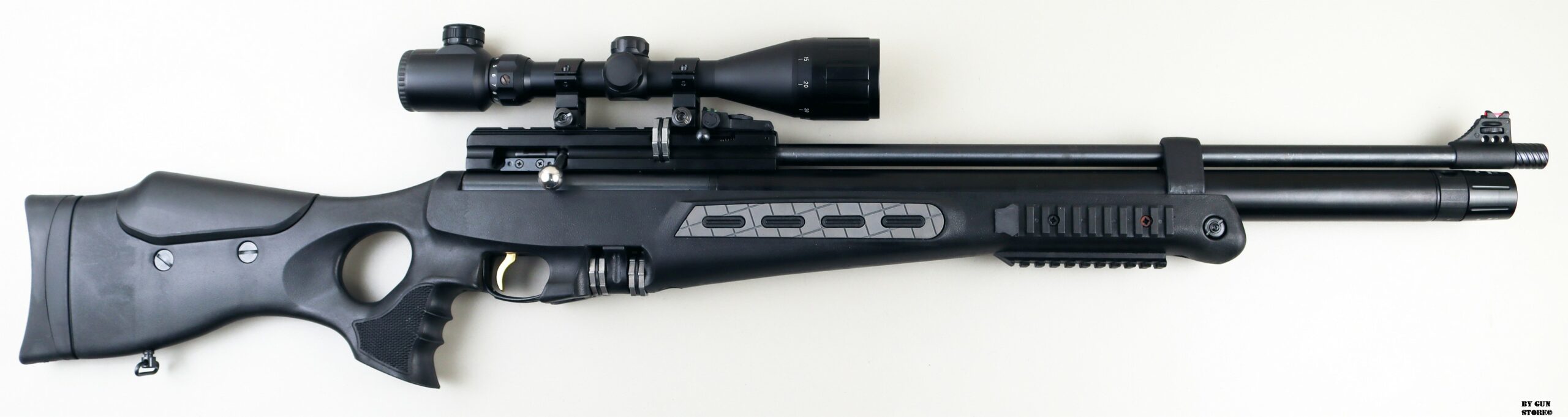 Carabina PCP con caricamento manuale e azione otturatore laterale (SB). Canna rigata di precisione, filettata in volata con passo UNF da ½” e dotato di copri filetto. Calcio sintetico dal design ambidestro ed ergonomico con foro per il pollice. Fessura porta caricatore di ricambio nel calcio per 2 caricatori di riserva. 3 guide picatinny sotto e ai lati della calciatura. Intarsi in morbida gomma sulla calciatura per un miglior controllo e sensibilità. Zigrinatura sull’impugnatura. Calciatura regolabile in altezza. Calciolo in gomma regolabile per lunghezza di tiro, elevazione e angolo di adattamento. Caricatore rotativo staccabile da 10 colpi. Serbatoio dell’aria in alluminio rimovibile (255 cc). Sono disponibili bombole di ricambio. Manometro incorporato sulla bombola dell’aria per monitorare la pressione della bombola. Include ugello a riempimento rapido e tappo di scarico del cilindro pneumatico. Reciver con scanalatura a coda di rondine per supporti per cannocchiale da 11 mm e 22 mm. Finitura generale brunita, ricevitore anodizzato nero. Sicura manuale. Meccanismo “anti-doppio caricamento pellet” che impedisce il caricamento di più di un pellet. Sistema antidetonante brevettato per prevenire lo spreco di gas quando il fucile viene urtato o rimbalzato. Organi di mira regolabili con fibra ottica Truglo. Gruppo scatto match completamente regolabile a 2 stadi per la corsa del grilletto e il carico del grilletto. Grilletto in metallo placcato oro e protezione del grilletto in metallo. Fornito con custodia rigida con tracolla, bipiede, torcia e cannocchiale Optima 3-12x44AOE.