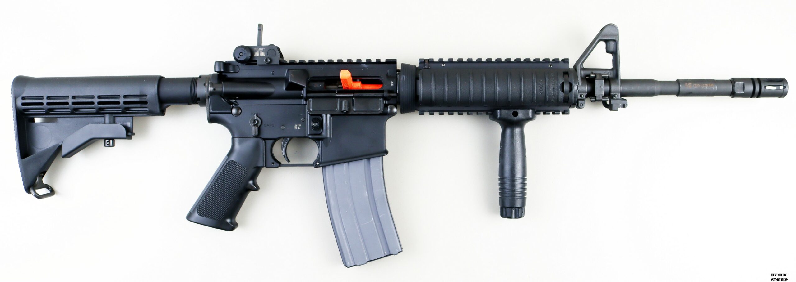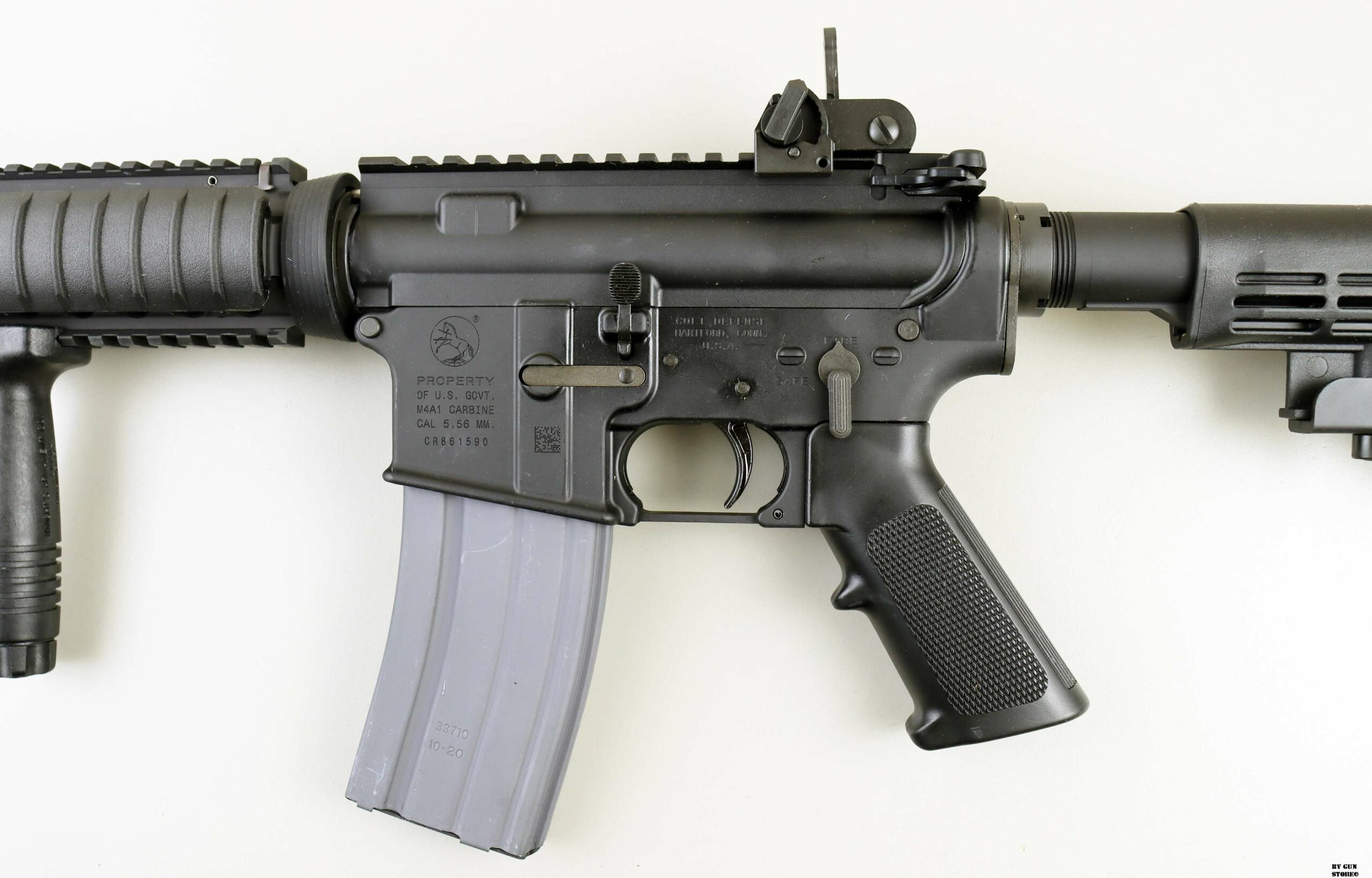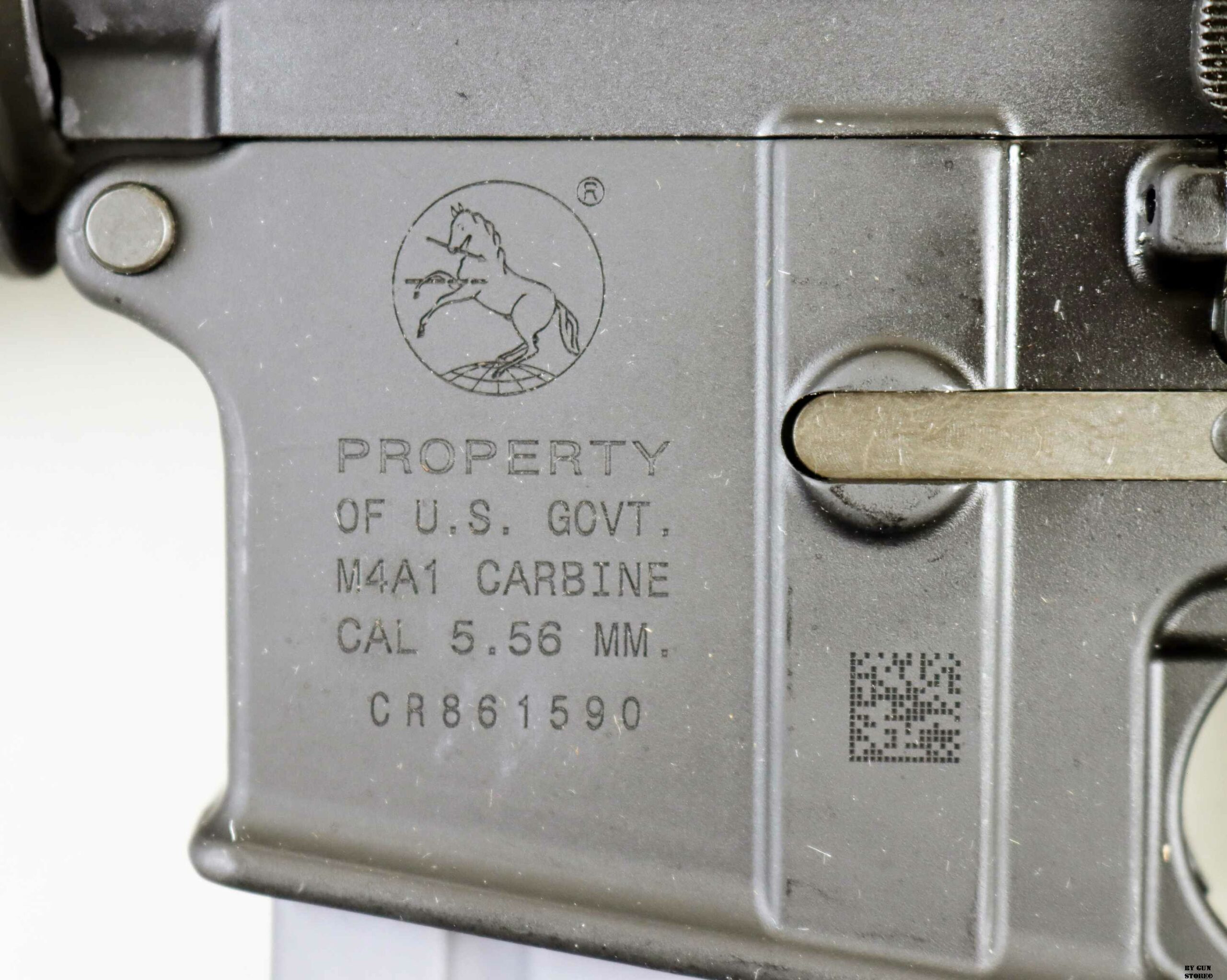 Il Colt carbine in configurazione M4A1 SOCOM. Il low receiver presenta, oltre il noto cavallino rampante, la rullatura PROPERTY OF THE US GOVT, M4A1 CARBINE e CAL. 5,56 MM. La canna è una vera canna pesante SOCOM 14.5. Include l’attacco della cinghia laterale sul blocco del gas e il selettore della sicura ambidestro. Rail e vertical grip della Knight’s Armament e mira Picatinny. ALL PROUDLY MADE IN THE USA. Classificazione Sportiva 12_02252s3c