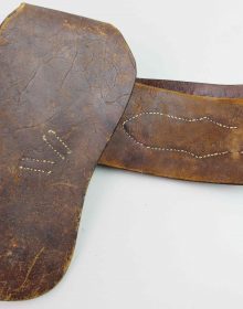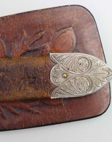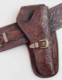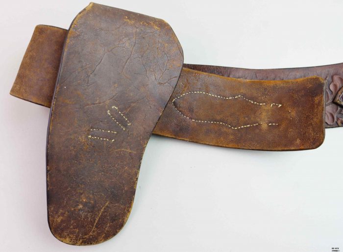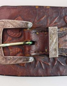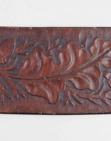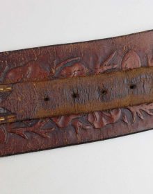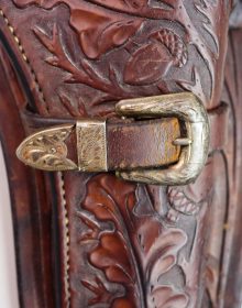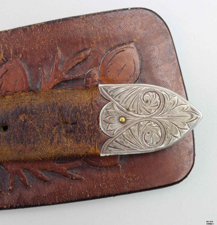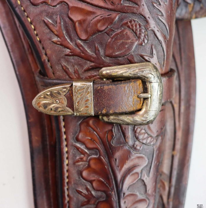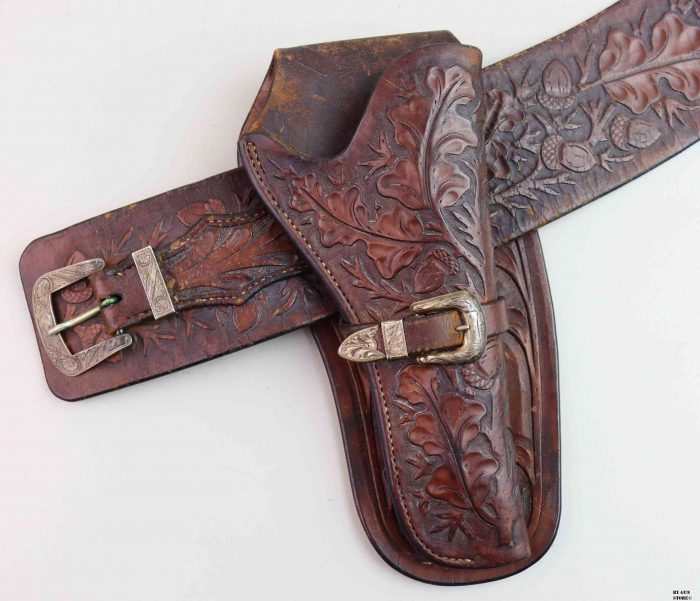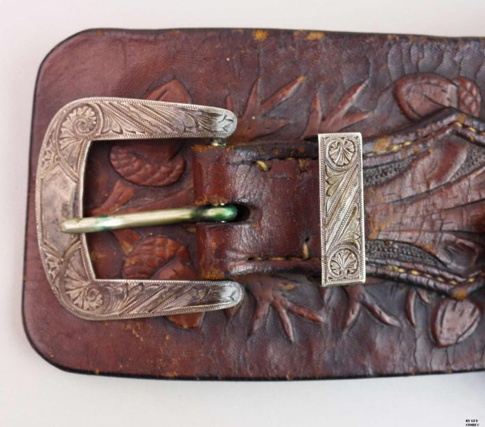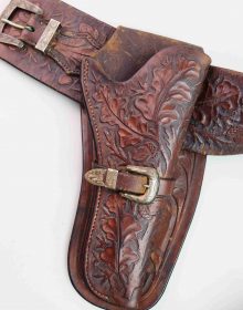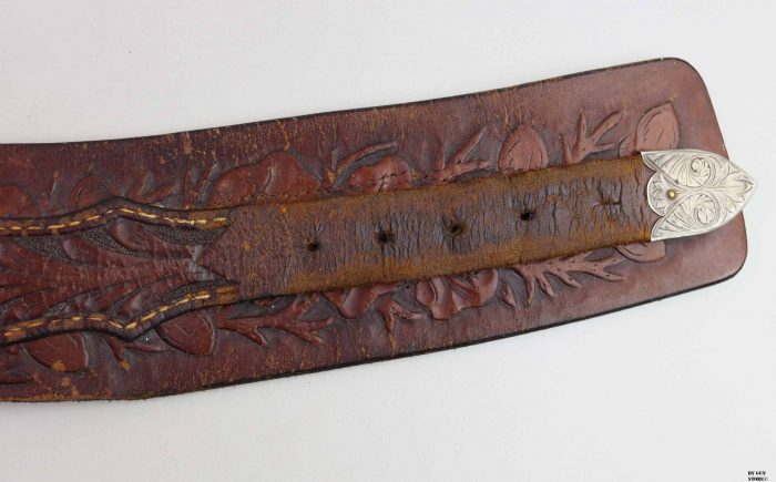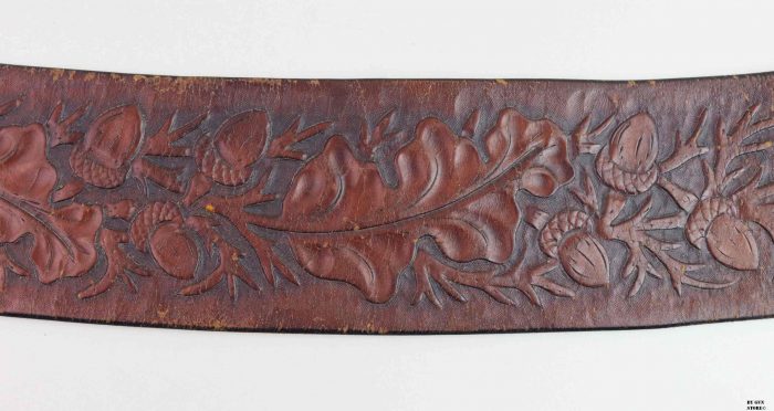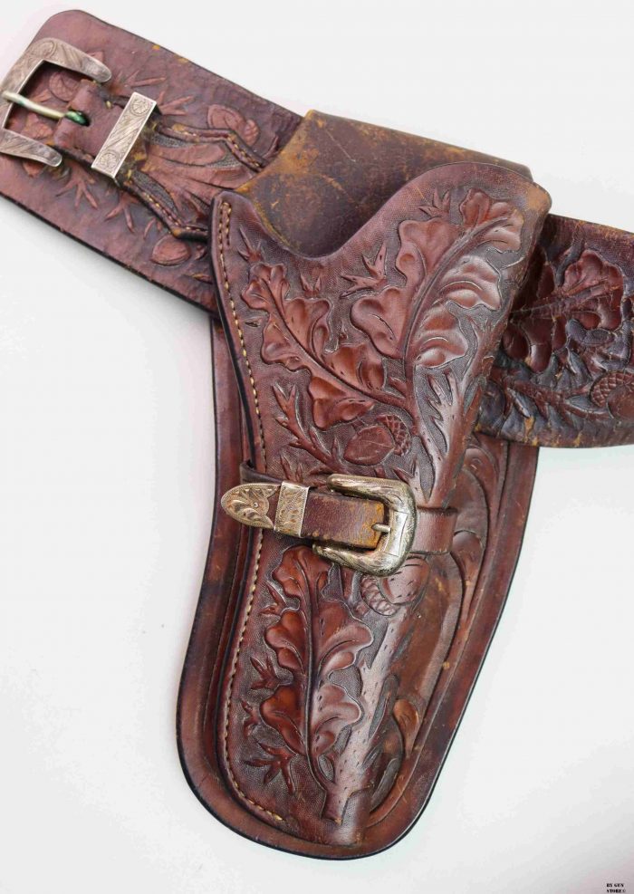 Bellissimo cinturone di cuoio originale dei primi del ‘900. Interamente decorato a foglie di quercia e ghiande, con tecnica a rilievo, è provvisto di metallerie finemente incise a mano. Attende una vera “single action” da abbinare!