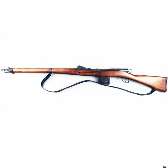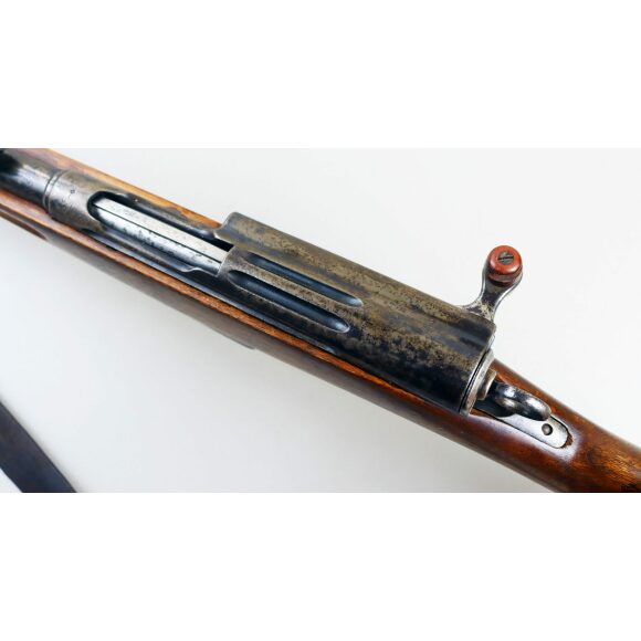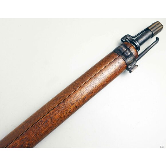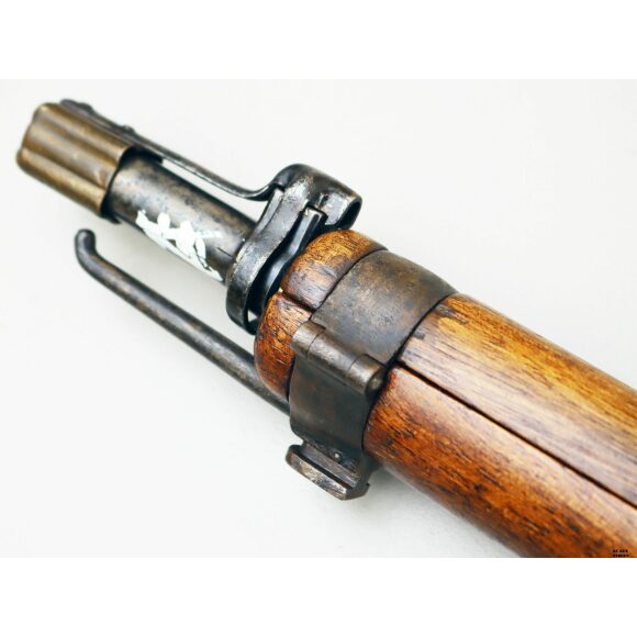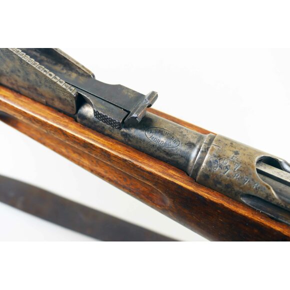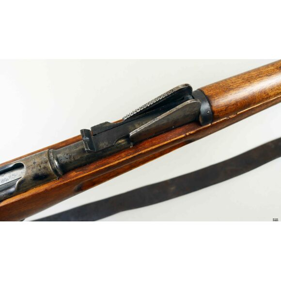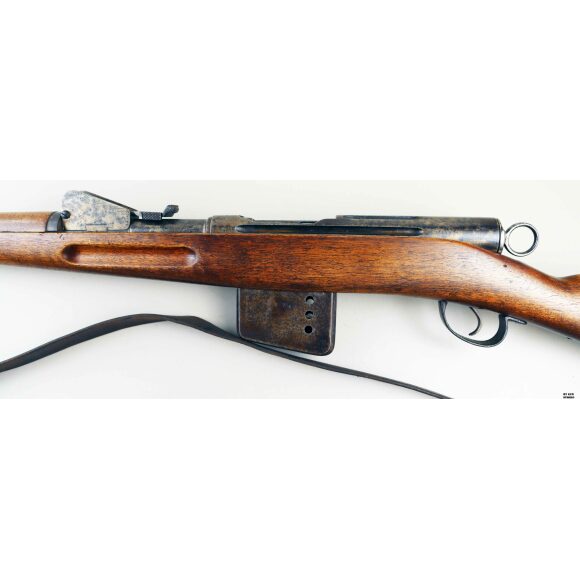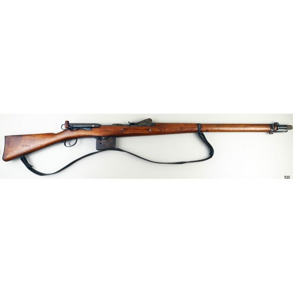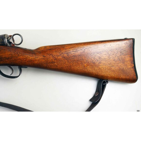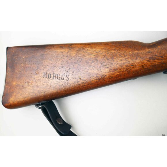 Lo Schmidt Rubin 1889 è stata la prima arma a beneficiare dell’otturatore a trazione rettilinea sviluppato dal Maggiore Rubin nel 1883. La munizione utilizzata allora non era neppure paragonabile al 7,5 svizzero attuale; utilizzava polvere semi-infume, ed il diametro della palla era da .303, anche se la palla era ricoperta lateralmente da un sottile strato di carta impregnato di lubrificante che ne portava il diametro effettivo a .304. L’arma, dotata di caricatore amovibile e decisamente sporgente, utilizzava la prima versione dell’otturatore Rubin, l’azione era piuttosto lunga e le alette di chiusura dell’otturatore, in posizione molto arretrata, potevano essere adatte alle polveri semi-infumi di allora, che sviluppavano potenze molto relative, ma risultavano inadatte per polveri più performanti, perché consentivano una eccessiva flessione dell’otturatore all’atto dello sparo. Nel 1896 l’arma venne modificata (modello 1889/96) utilizzando un otturatore leggermente più corto con alette di chiusura rinforzate. Questo matrciola 97878 è in ordine, monomatricola, con cinghia originale e tappo coprivolata. Canna marcata “A. Baumann Morges”. Arma antica.