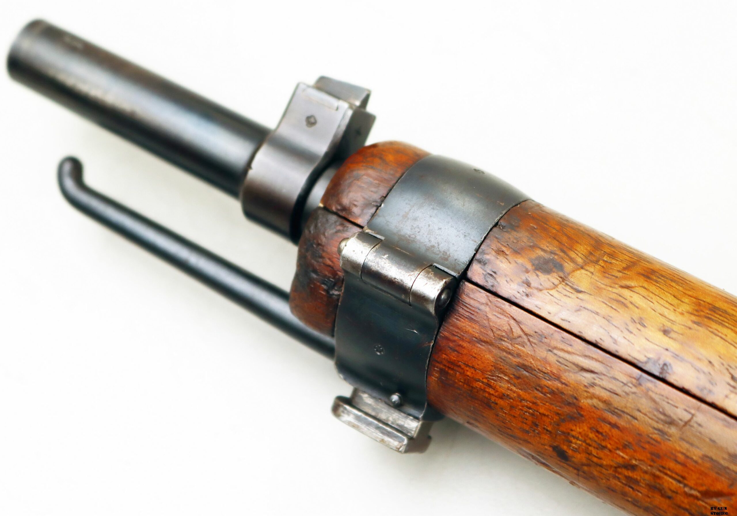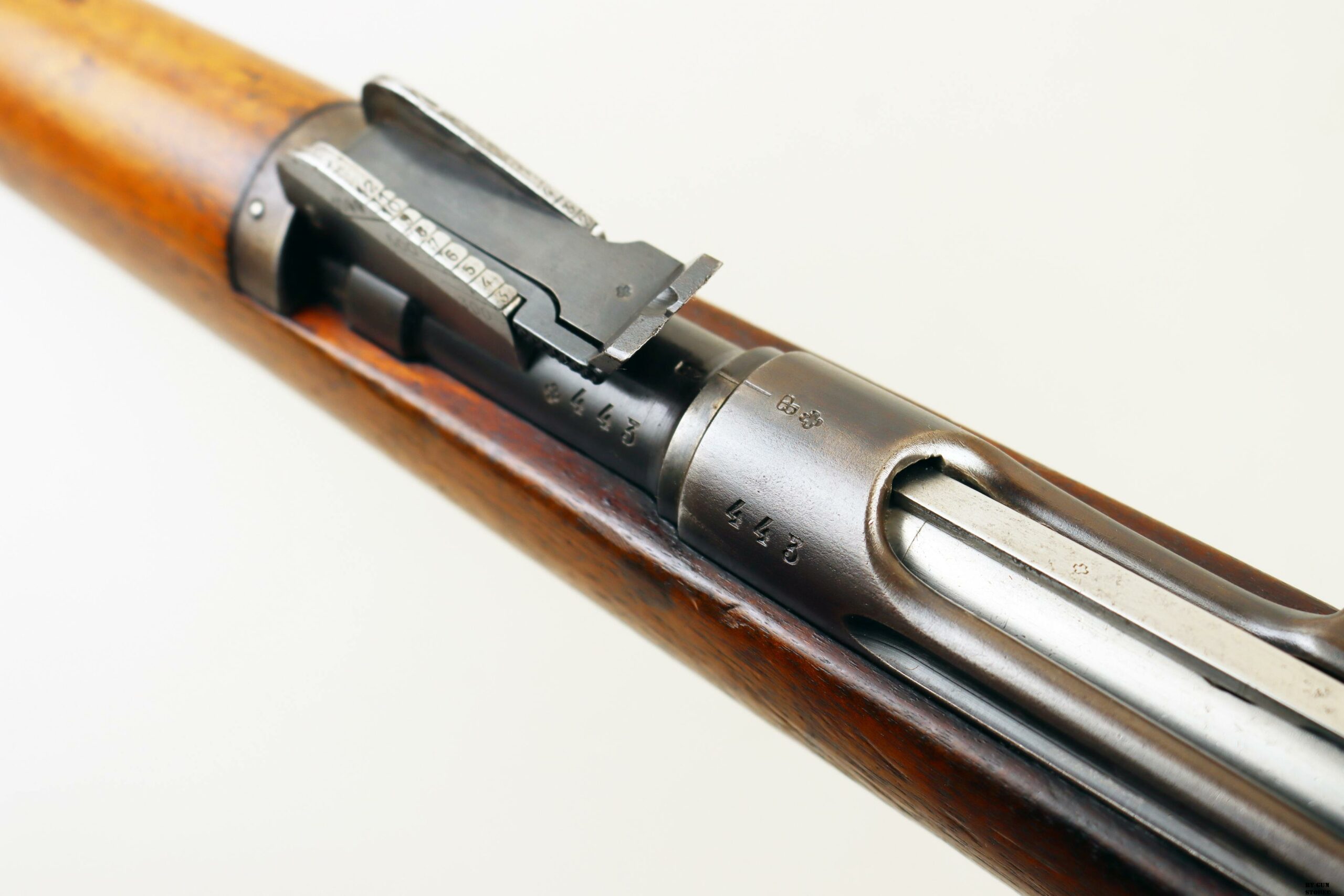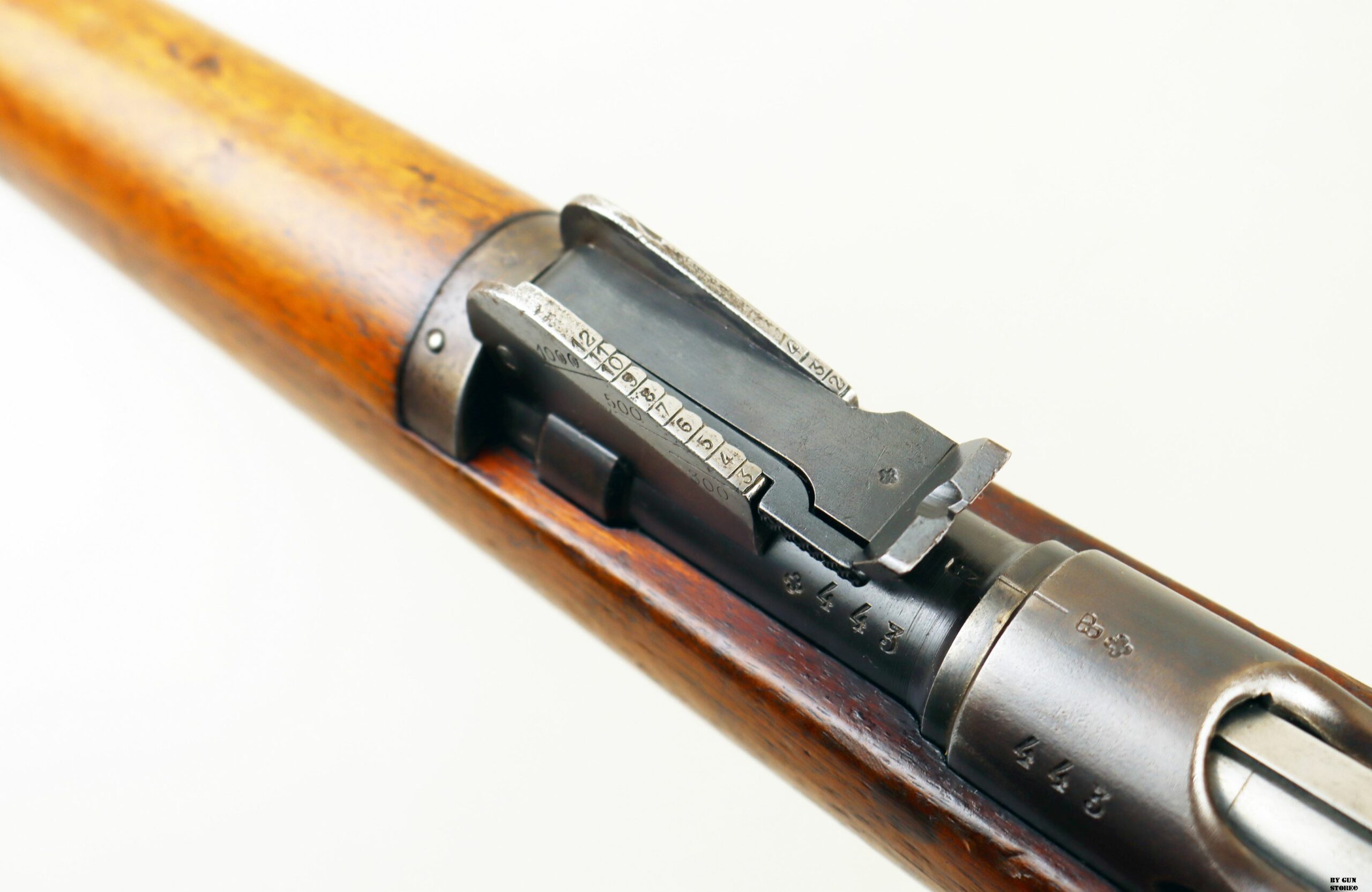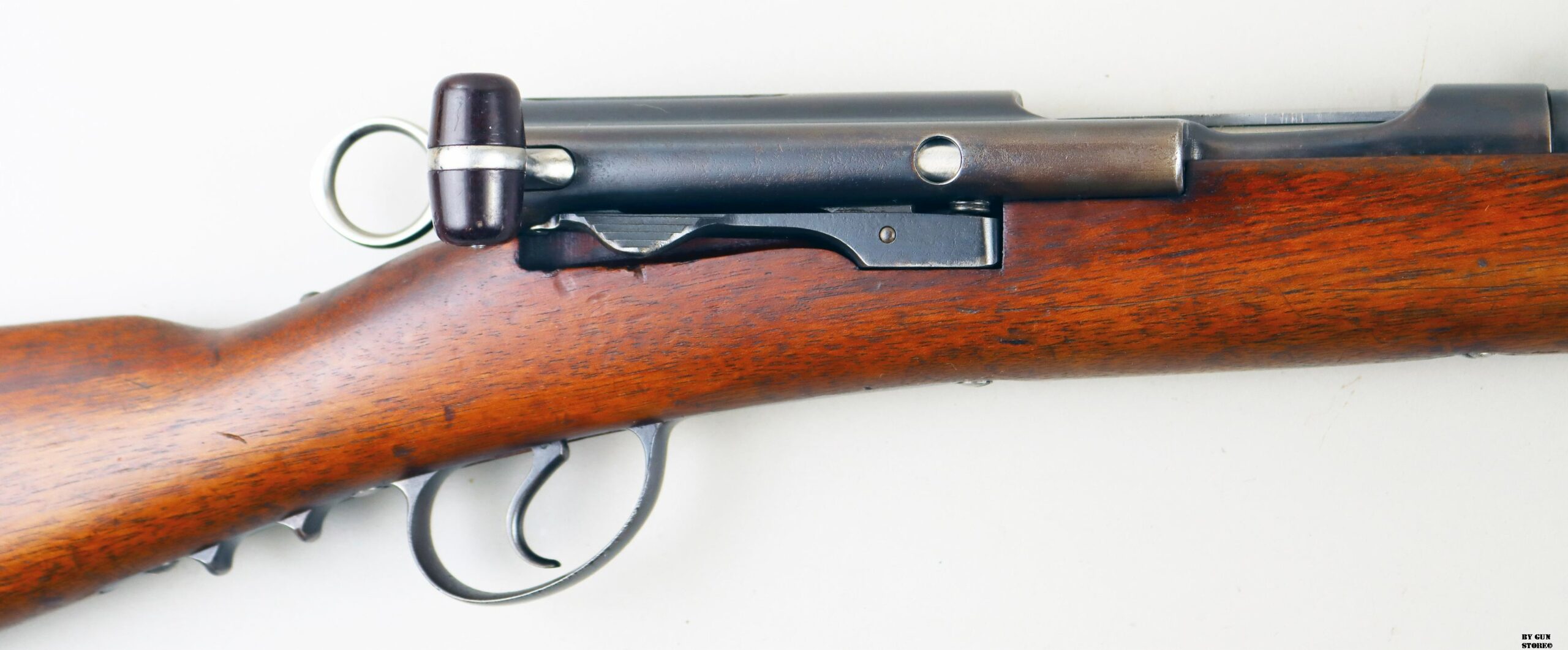 Il fucile da Cadetto, Kadettengewehr in tedesco. Un monocolpo in calibro 7,5×55. L’alzo ha sul bordo sinistro del supporto le tacche che coprono da 300 a 1200 m, ovviamente destinate al tiro con le cartucce a piena carica, mentre su quello destro le tacche sono da 200 a 400, per il tiro con le munizioni “da ragazzo”, caricate con una minor dose di propellente. Il castello presenta una culla liscia che chiude la sede del caricatore. Ovviamente è diversa dal normale anche la parte inferiore dell’arma, che presenta solo le teste delle viti di fissaggio inserite in rosette di acciaio annegate nel legno, e diversi sono anche i valori di peso e lunghezza, per adattarsi al fisico dei giovani da addestrare. La canna è lunga 60 cm, contro i 70 e passa dei fucili d’ordinanza, e anche il calcio ha dimensioni ridotte, ma tutto il resto, ovvero sistema di otturazione, sicura, tipo della calciatura, organi di mira, finimenti metallici, è molto simile. Questo è monomatricola, con canna, meccanica e azione ottime. Brunitura originale, è un ottimo pezzo da collezione o da uso al poligono. In abbinamento la baionetta corretta.