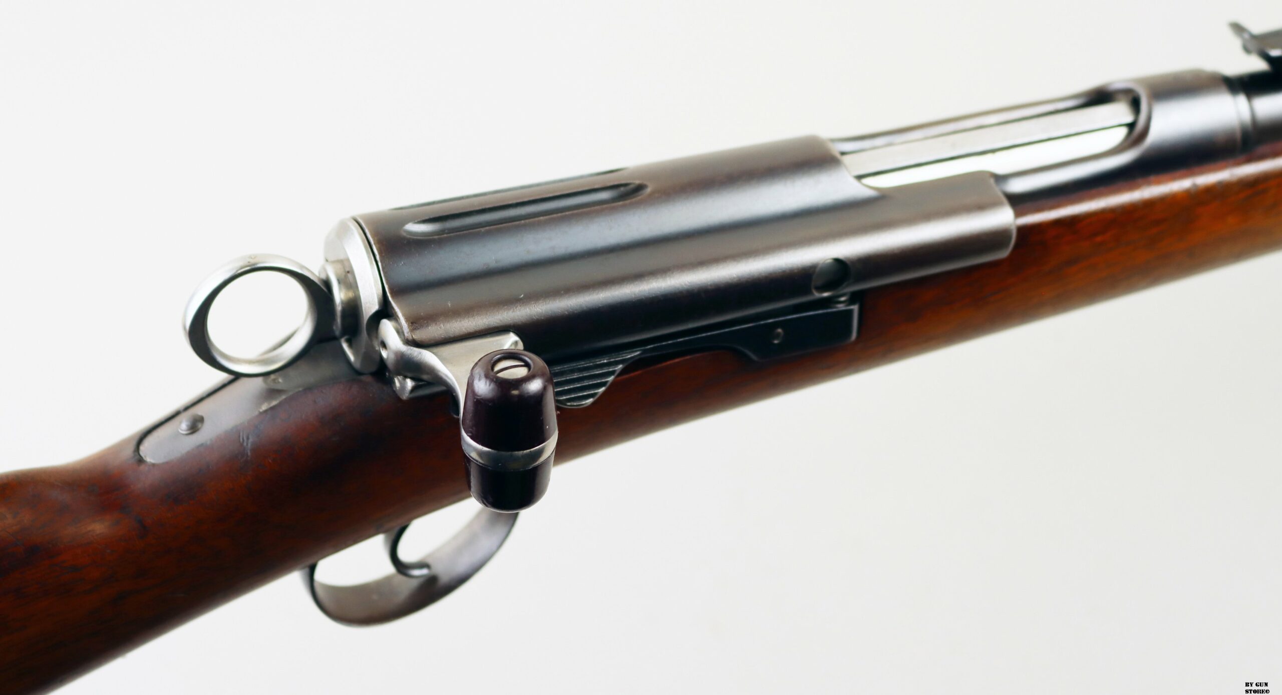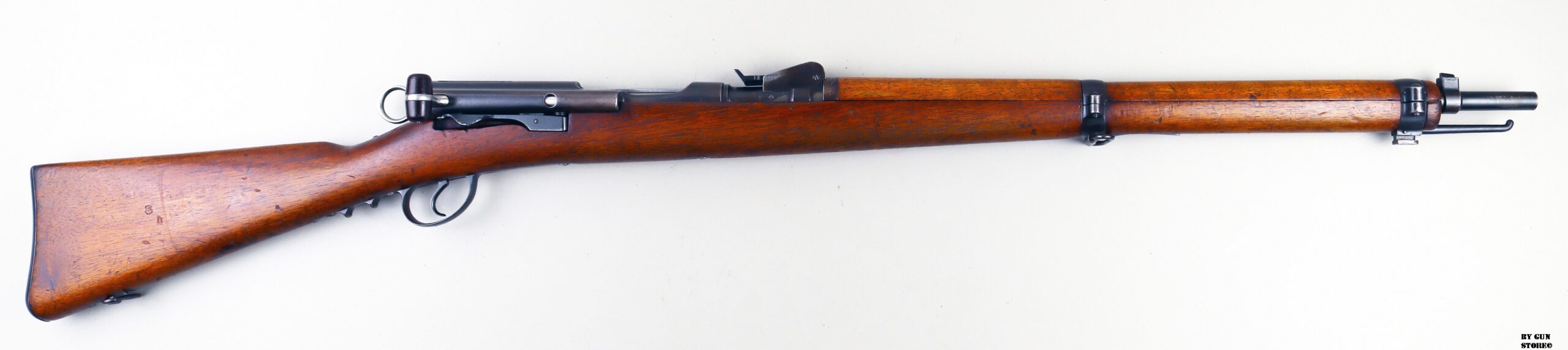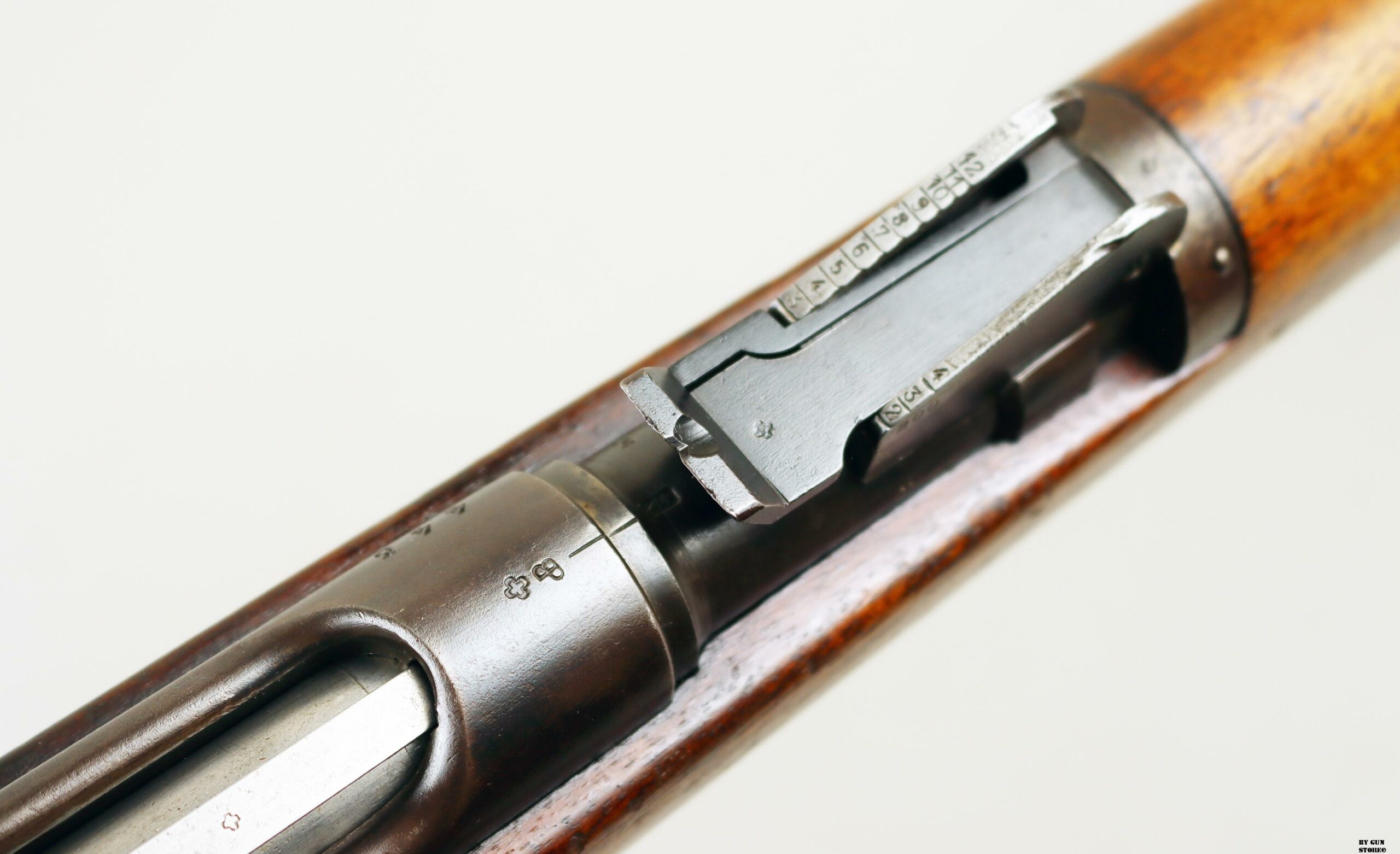 Il fucile da Cadetto, Kadettengewehr in tedesco. Un monocolpo in calibro 7,5×55. L’alzo ha sul bordo sinistro del supporto le tacche che coprono da 300 a 1200 m, ovviamente destinate al tiro con le cartucce a piena carica, mentre su quello destro le tacche sono da 200 a 400, per il tiro con le munizioni “da ragazzo”, caricate con una minor dose di propellente. Il castello presenta una culla liscia che chiude la sede del caricatore. Ovviamente è diversa dal normale anche la parte inferiore dell’arma, che presenta solo le teste delle viti di fissaggio inserite in rosette di acciaio annegate nel legno, e diversi sono anche i valori di peso e lunghezza, per adattarsi al fisico dei giovani da addestrare. La canna è lunga 60 cm, contro i 70 e passa dei fucili d’ordinanza, e anche il calcio ha dimensioni ridotte, ma tutto il resto, ovvero sistema di otturazione, sicura, tipo della calciatura, organi di mira, finimenti metallici, è molto simile. Questo è monomatricola, con canna, meccanica e azione ottime. Brunitura originale, è un ottimo pezzo da collezione o da uso al poligono. In abbinamento la baionetta corretta.