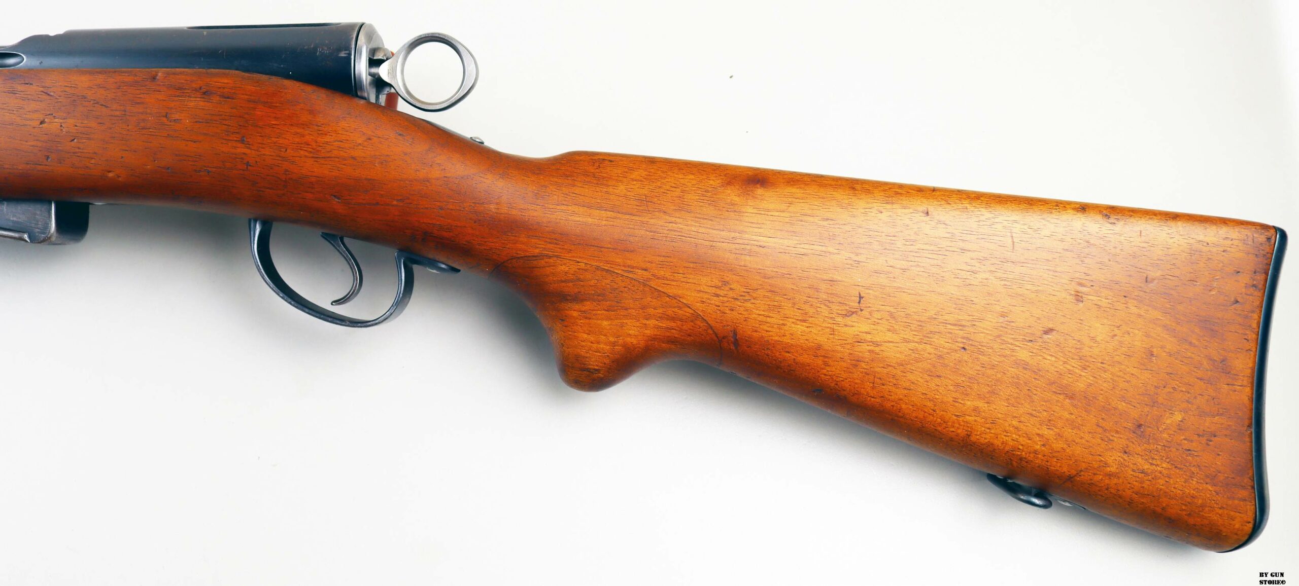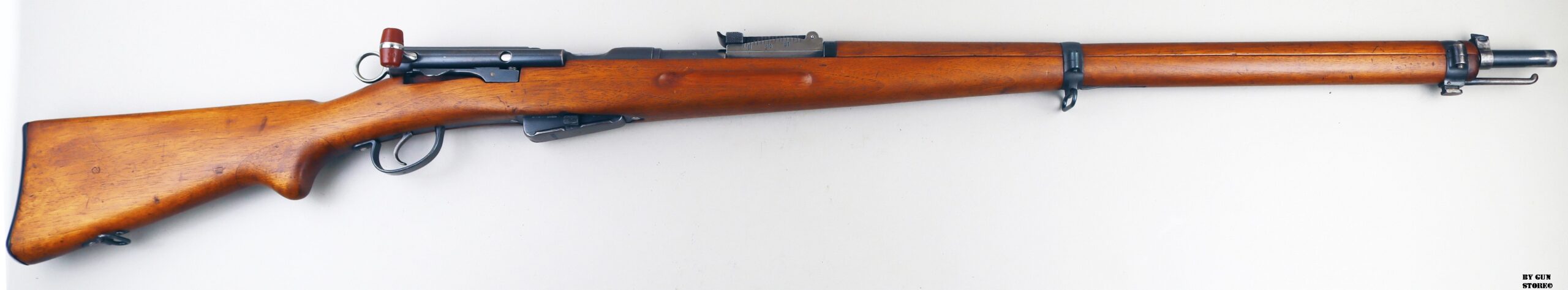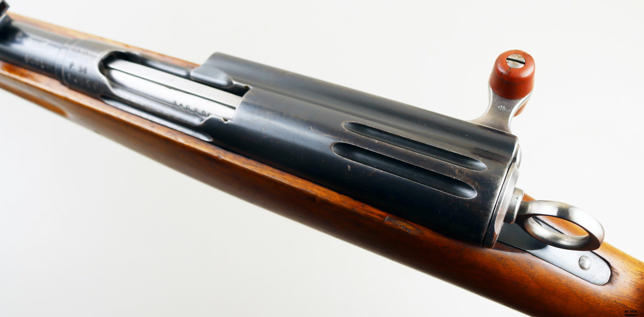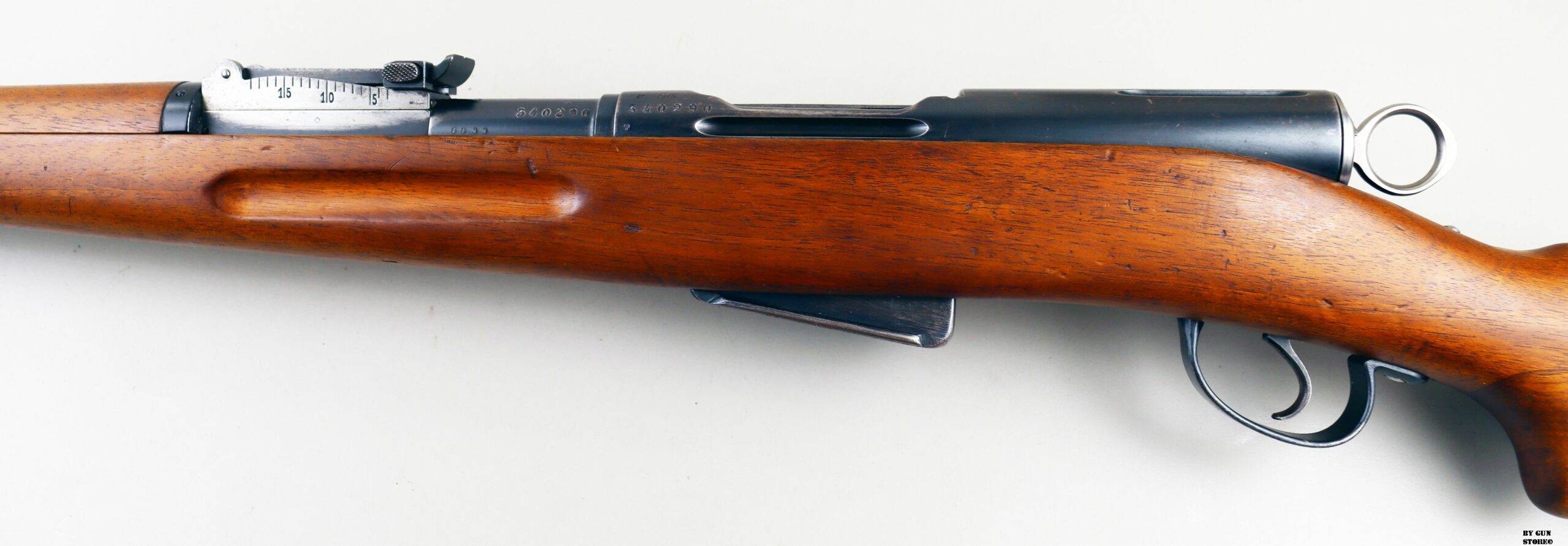 Il fucile 1911 fu il primo degli Schmidt Rubin concepito per l’utilizzo della munizione modello 11, che utilizzava polvere infume e sviluppava pressioni molto superiori alla munizione precedente camerata dallo Schmidt Rubin 1889. L’azione fu leggermente modificata, accorciata e le alette di chiusura dell’otturatore furono portate in una posizione più avanzata. Inoltre fu montato un meccanismo che impediva all’otturatore di chiudersi a caricatore vuoto. Di fucili 1911 non ne sono stati fatti circa 133.000, mentre altri 135.770 sono stati realizzati modificando i fucili 1889/96 già presenti in arsenale. Questo prodotto dalla Eidgenossische Waffenfabrik Bern (WF) è il Gew 11 (Schweizerisches Infanterie Gewehr 1911). E’ monomatricola monta una canna Hammerli & Hausch (riconoscibile dal punzone “B”). Ottime condizioni generali, cinghia originale e punzone di Privatizzazione del 1938. Calibro 7.5 x 55 GP11