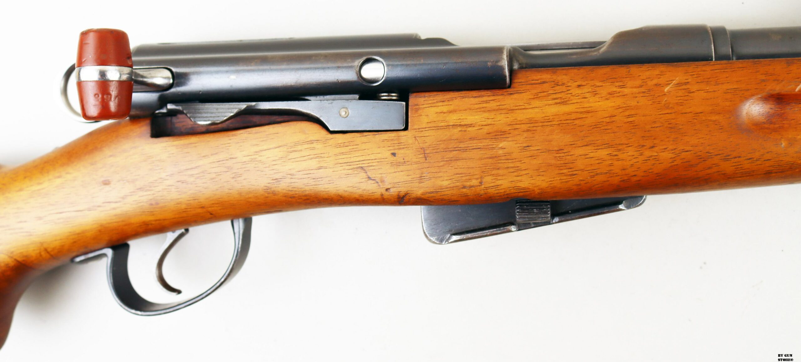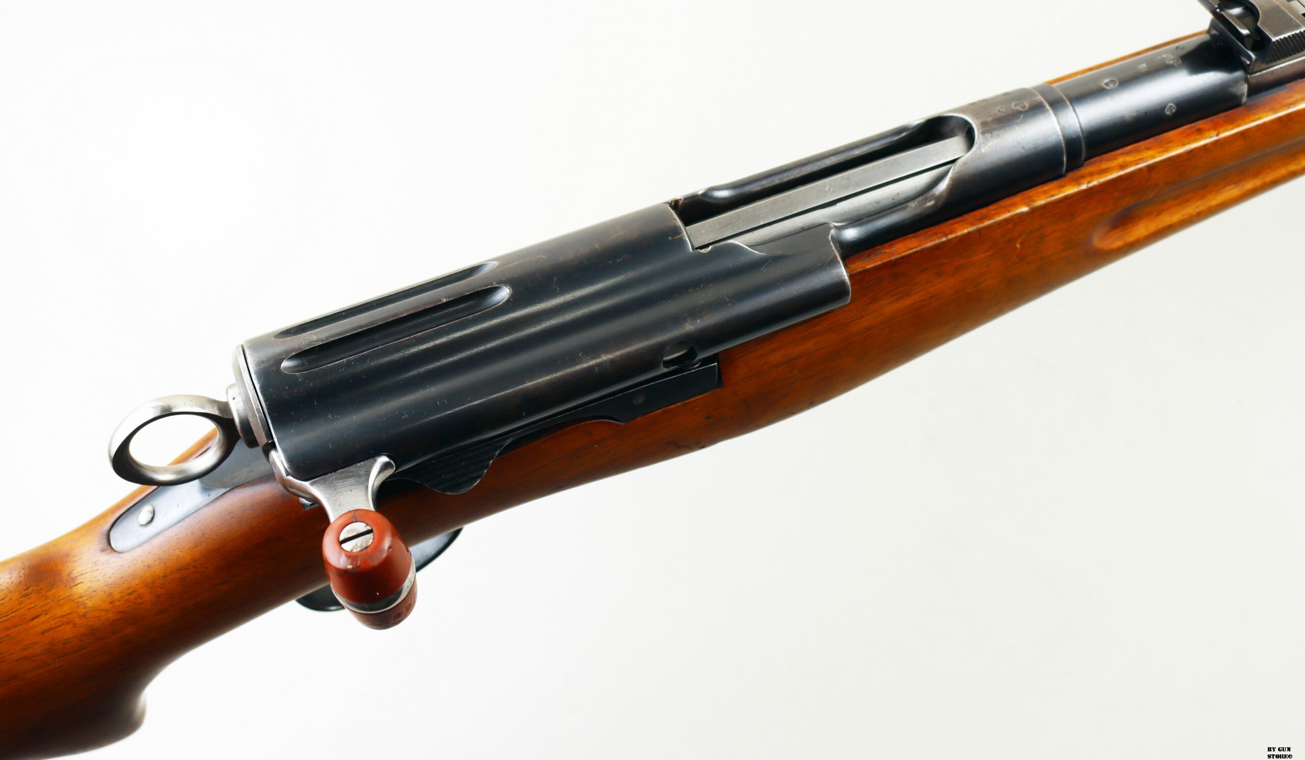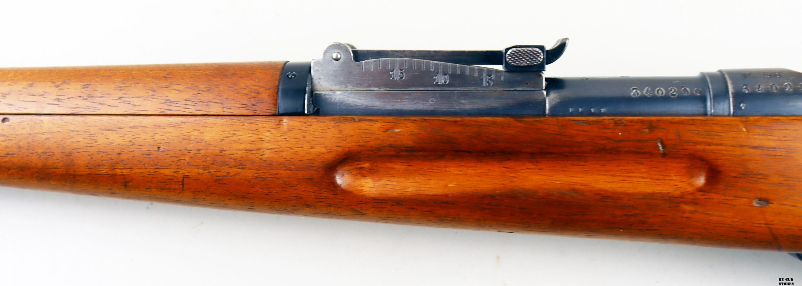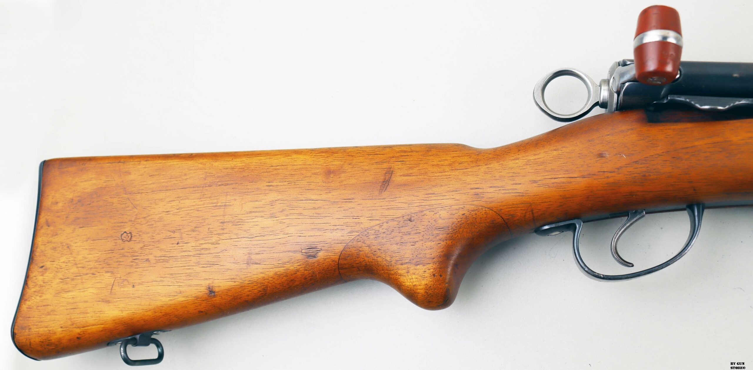 Il fucile 1911 fu il primo degli Schmidt Rubin concepito per l’utilizzo della munizione modello 11, che utilizzava polvere infume e sviluppava pressioni molto superiori alla munizione precedente camerata dallo Schmidt Rubin 1889. L’azione fu leggermente modificata, accorciata e le alette di chiusura dell’otturatore furono portate in una posizione più avanzata. Inoltre fu montato un meccanismo che impediva all’otturatore di chiudersi a caricatore vuoto. Di fucili 1911 non ne sono stati fatti circa 133.000, mentre altri 135.770 sono stati realizzati modificando i fucili 1889/96 già presenti in arsenale. Questo prodotto dalla Eidgenossische Waffenfabrik Bern (WF) è il Gew 11 (Schweizerisches Infanterie Gewehr 1911). E’ monomatricola monta una canna Hammerli & Hausch (riconoscibile dal punzone “B”). Ottime condizioni generali, cinghia originale e punzone di Privatizzazione del 1938. Calibro 7.5 x 55 GP11