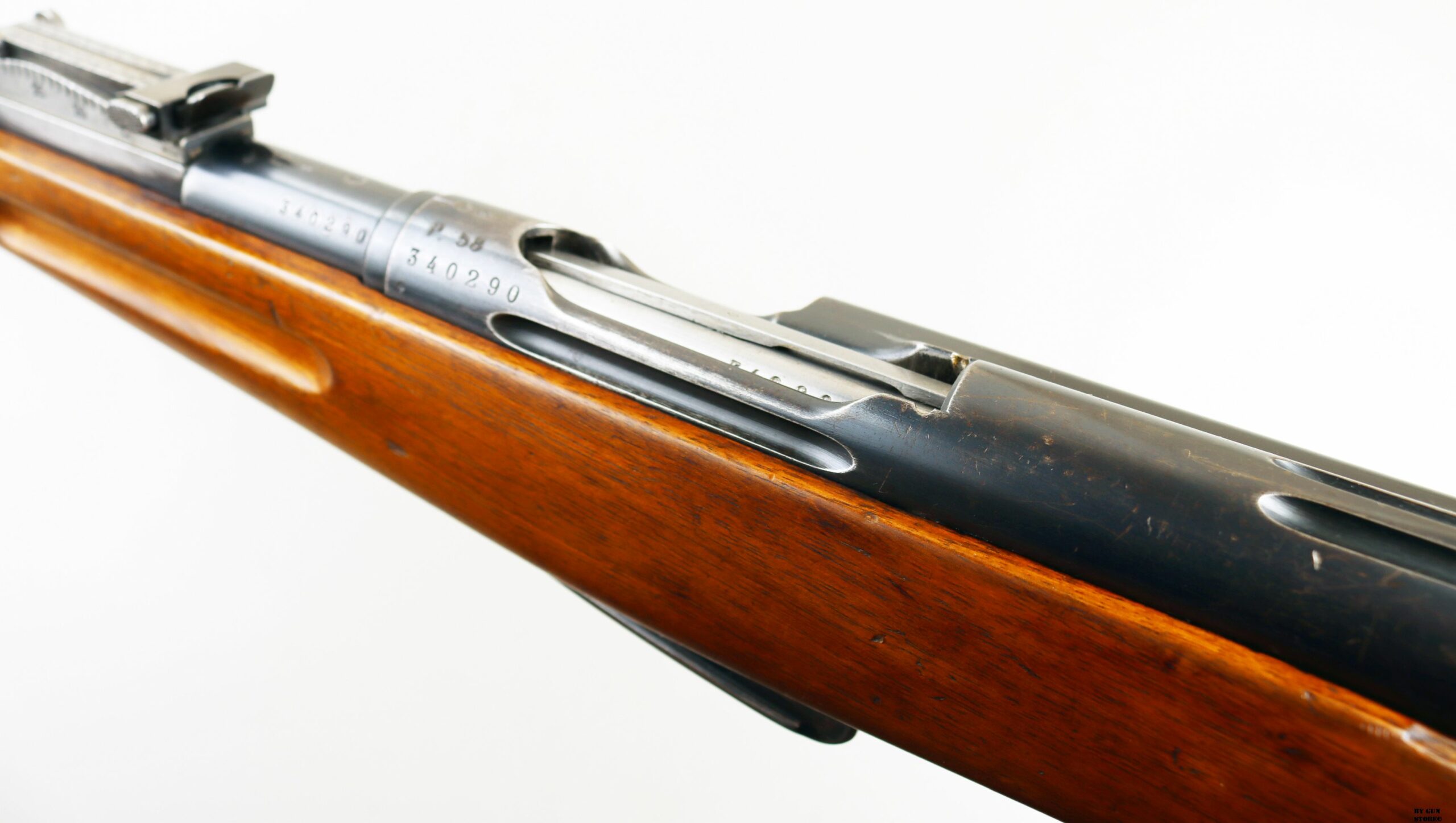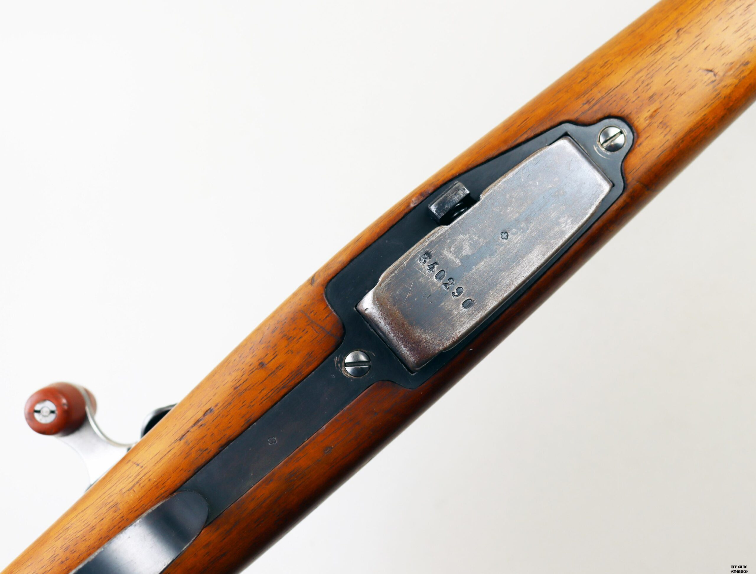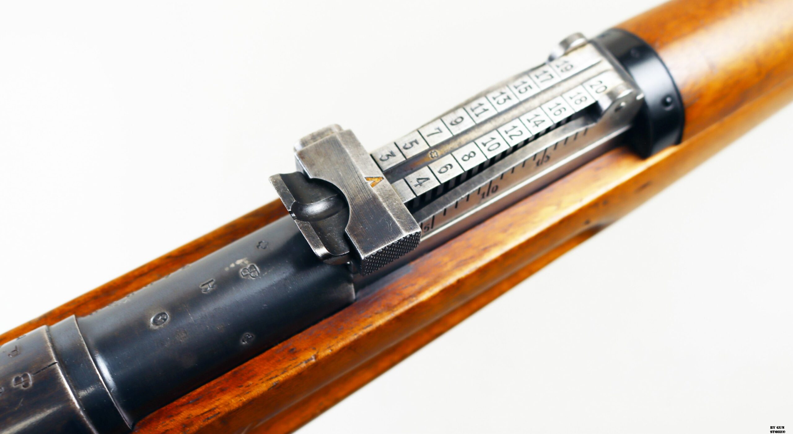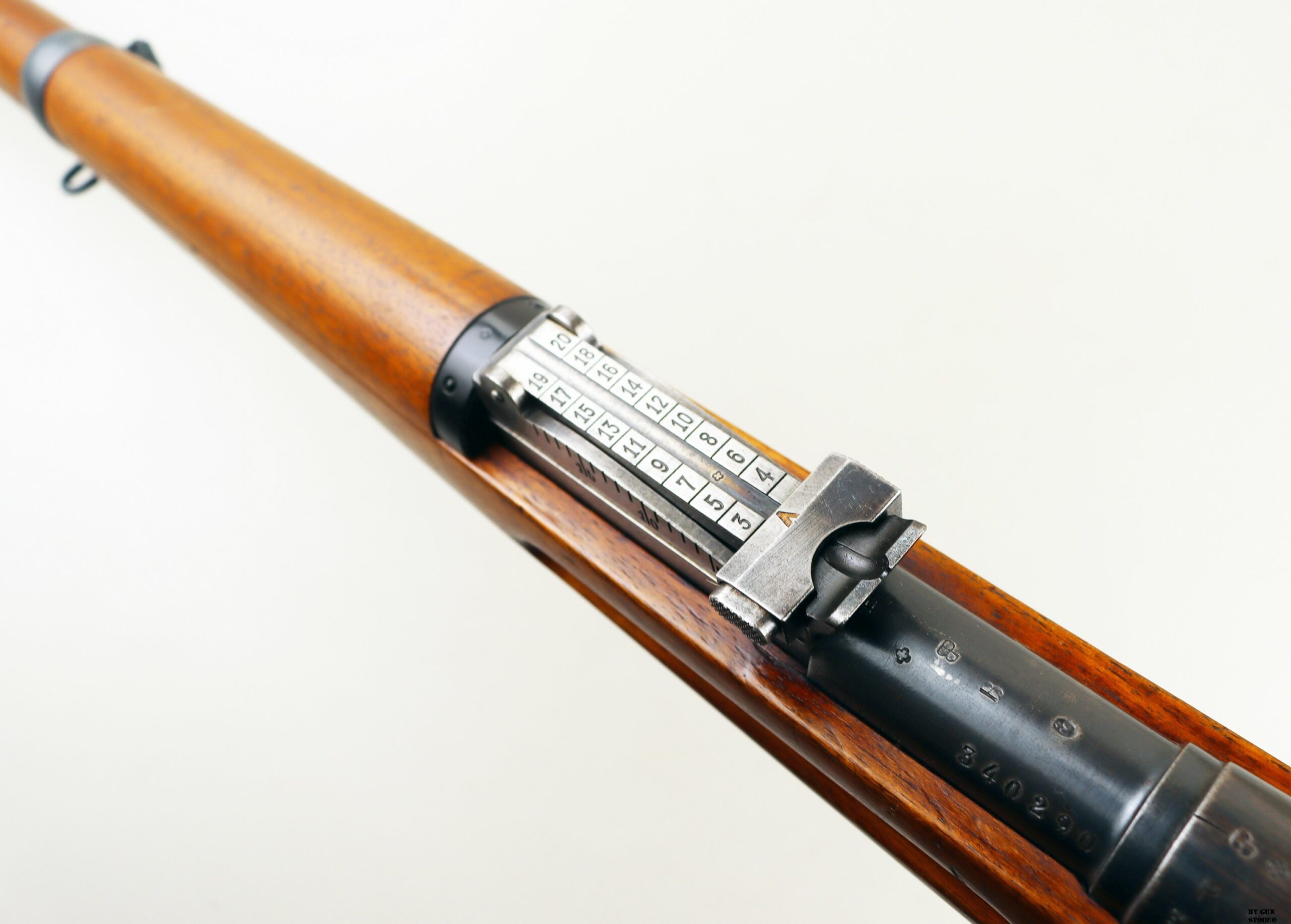 Il fucile 1911 fu il primo degli Schmidt Rubin concepito per l’utilizzo della munizione modello 11, che utilizzava polvere infume e sviluppava pressioni molto superiori alla munizione precedente camerata dallo Schmidt Rubin 1889. L’azione fu leggermente modificata, accorciata e le alette di chiusura dell’otturatore furono portate in una posizione più avanzata. Inoltre fu montato un meccanismo che impediva all’otturatore di chiudersi a caricatore vuoto. Di fucili 1911 non ne sono stati fatti circa 133.000, mentre altri 135.770 sono stati realizzati modificando i fucili 1889/96 già presenti in arsenale. Questo prodotto dalla Eidgenossische Waffenfabrik Bern (WF) è il Gew 11 (Schweizerisches Infanterie Gewehr 1911). E’ monomatricola monta una canna Hammerli & Hausch (riconoscibile dal punzone “B”). Ottime condizioni generali, cinghia originale e punzone di Privatizzazione del 1938. Calibro 7.5 x 55 GP11