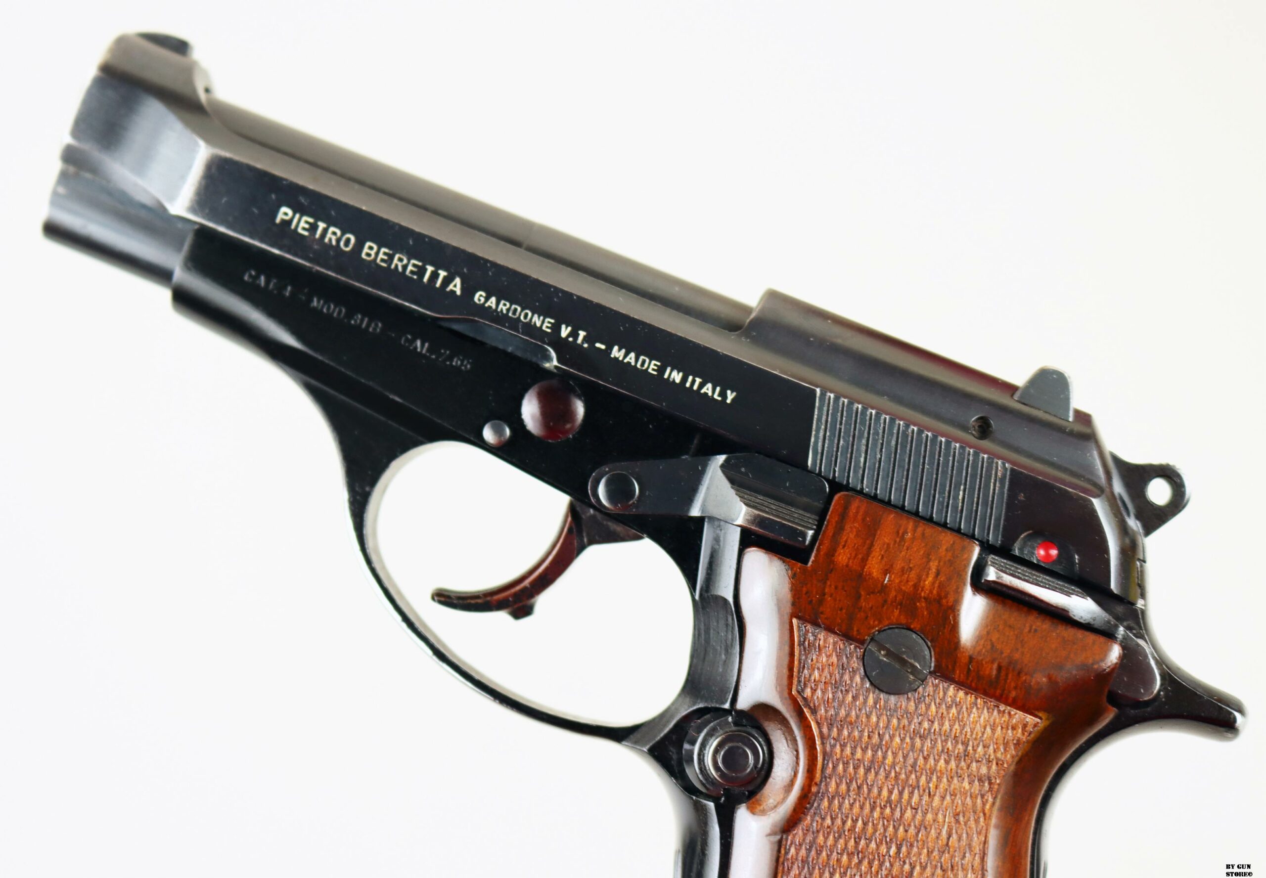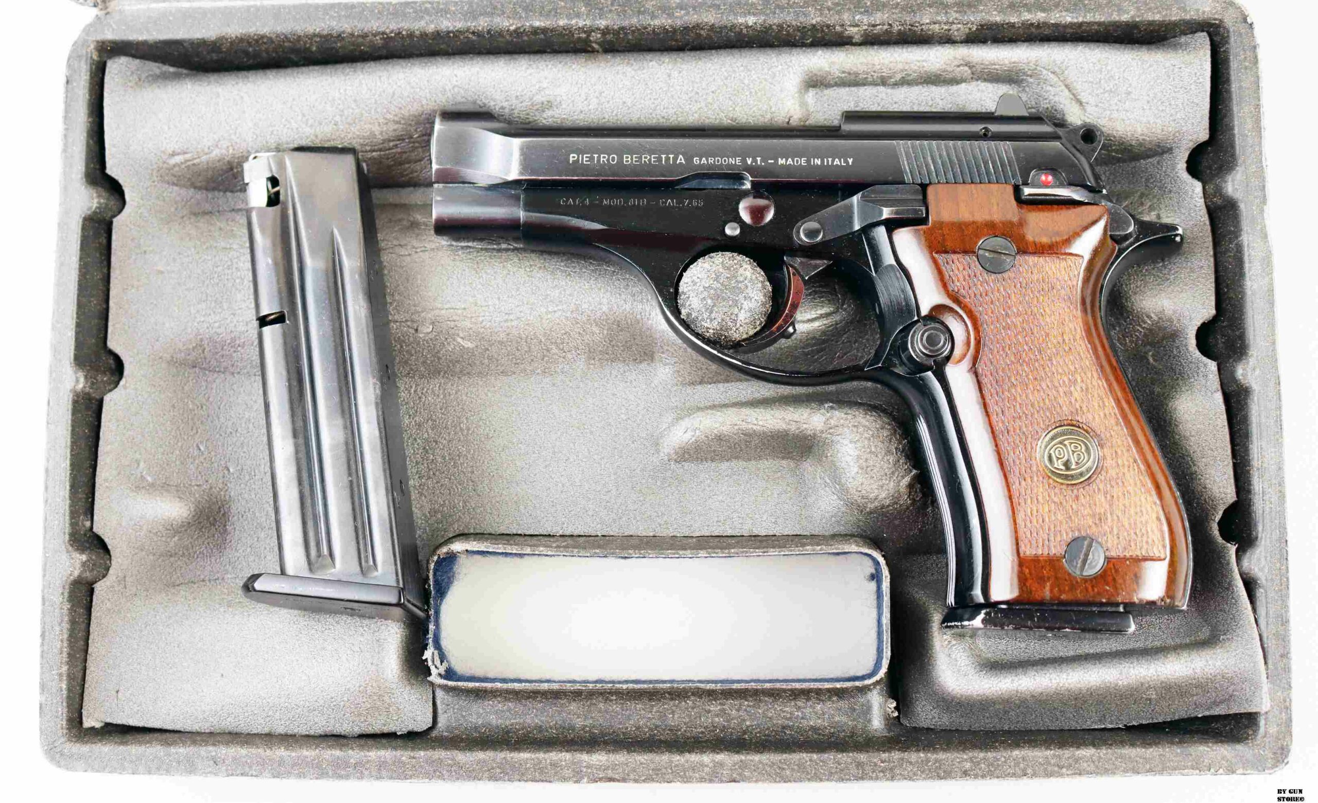 Anno 1982 di produzione e bancatura (AI) per questa pistola Beretta modello 81B. Arma in condizioni molto valide. Canna, meccanica e azione sono ottime. Brunitura originale con segni d’uso, guancette in legno con logo e dotazione completa di fabbrica con scatola, caricatore e libretto. Calibro 7,65 mm, arma comune.