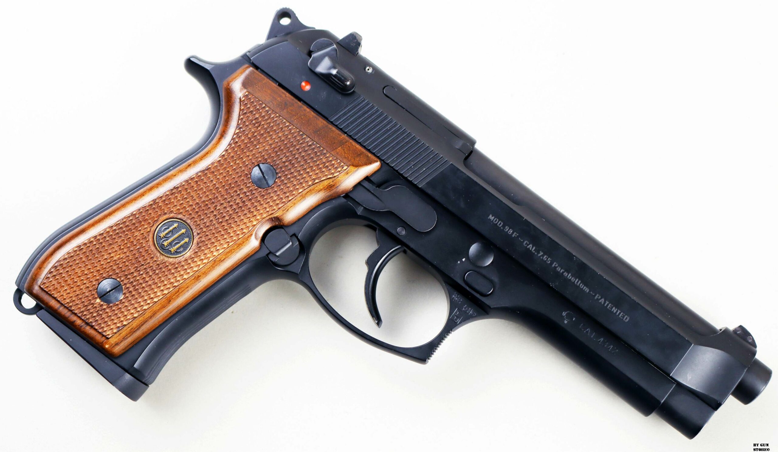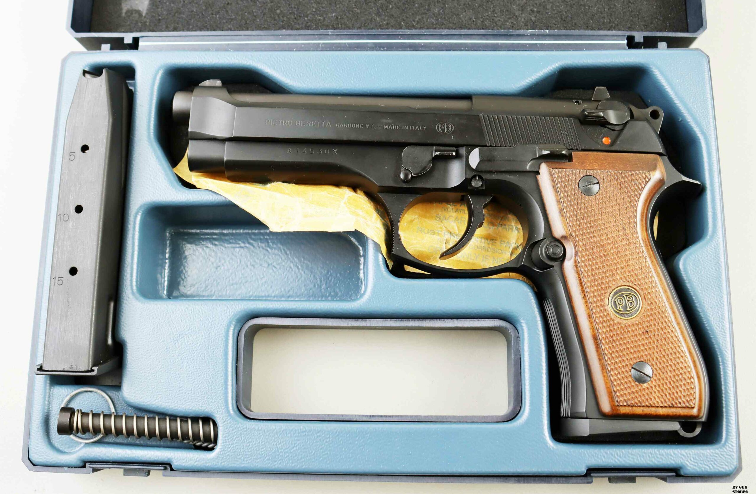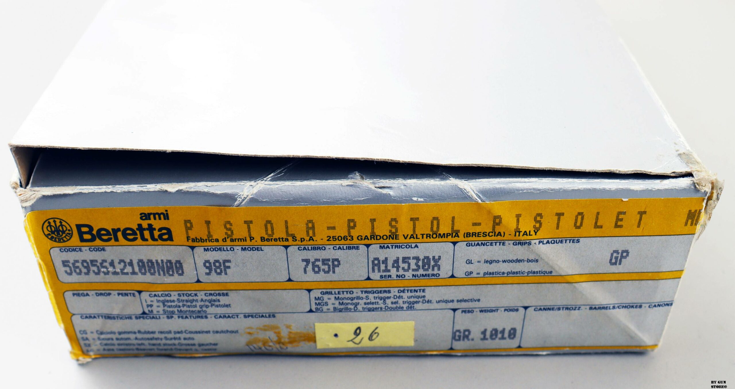 Anno 1986 di produzione e bancatura (AP) presso il BNP di Gardone, per questa pistola Beretta modello 98F. Una delle prime prodotte in calibro 7,65 parabellum. Proveniente da collezione è immacolata e con la dotazione di fabbrica originale. Scatola, sopra scatola, libretto e guancette di plastica di origine. Il precedente proprietario ha montato delle guancette di legno originali e ha sostituito l’asta guidamolla con quella in acciaio, sempre Beretta. Arma Comune.