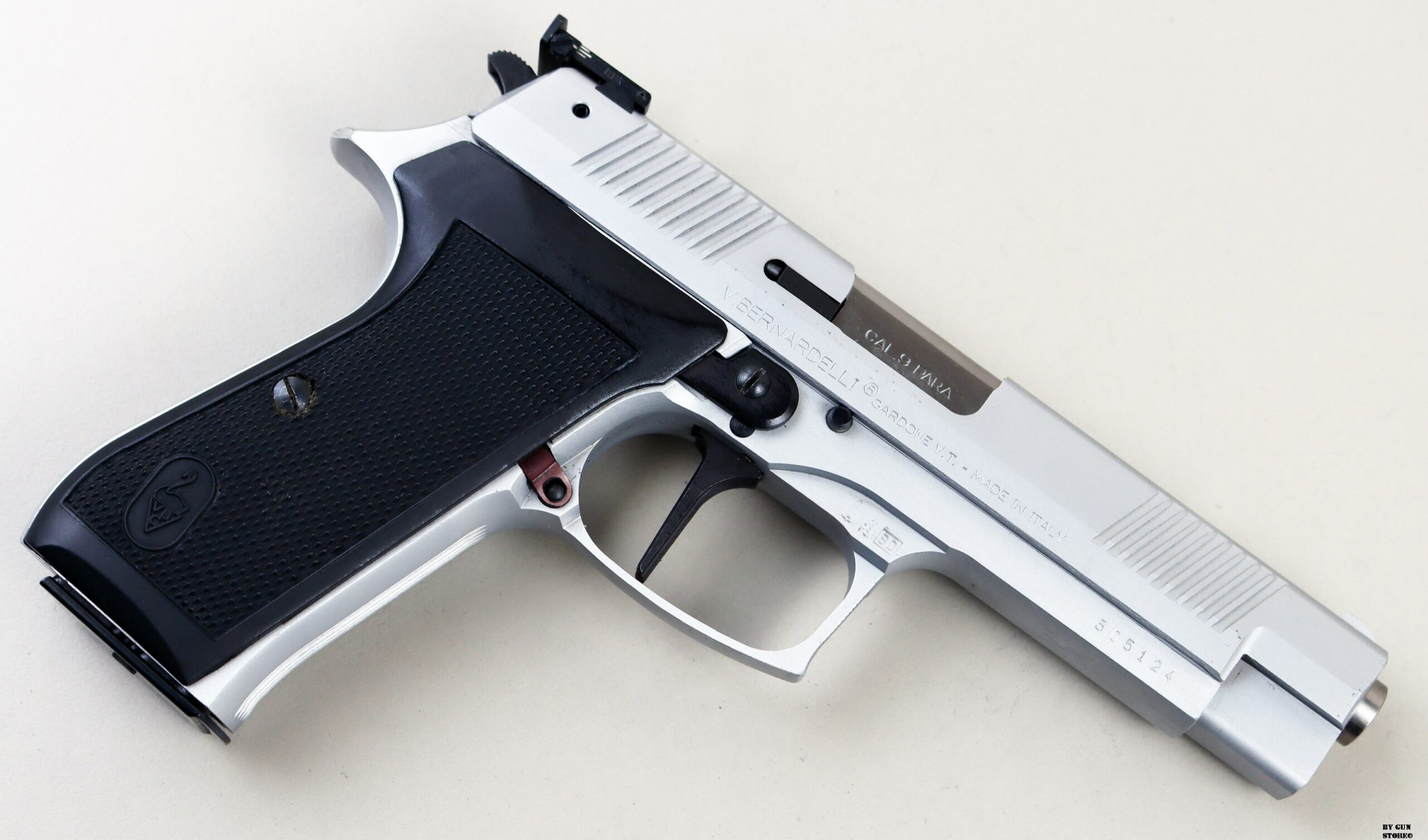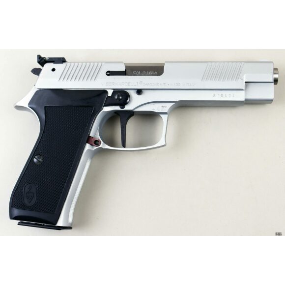 Anno 1994 di bacatura per questa splendida pistola prodotta dalla Vincenzo Bernardelli nel modello P.ONE. Arma in calibro originale costruita per il mercato dell’esportazione. Set completo della casa Gardonese composto dalla scatola, doppio caricatore, scovolino, libretto e accessori. Arma dall’animo sportivo data la mira regolabile. Introdotta nel 1994 in sostituzione del modello P0 18, la P.One mantiene la costruzione interamente in acciaio fresato, le guide a tutta lunghezza tipo P210, ma presenta una linea più raffinata, gli intagli di presa anteriori e posteriori sul carrello, il grilletto verticale e lo sgancio caricatore alto. Proveniente da collezione estera è in condizioni generali ottime. Calibro 9×19, arma comune.
