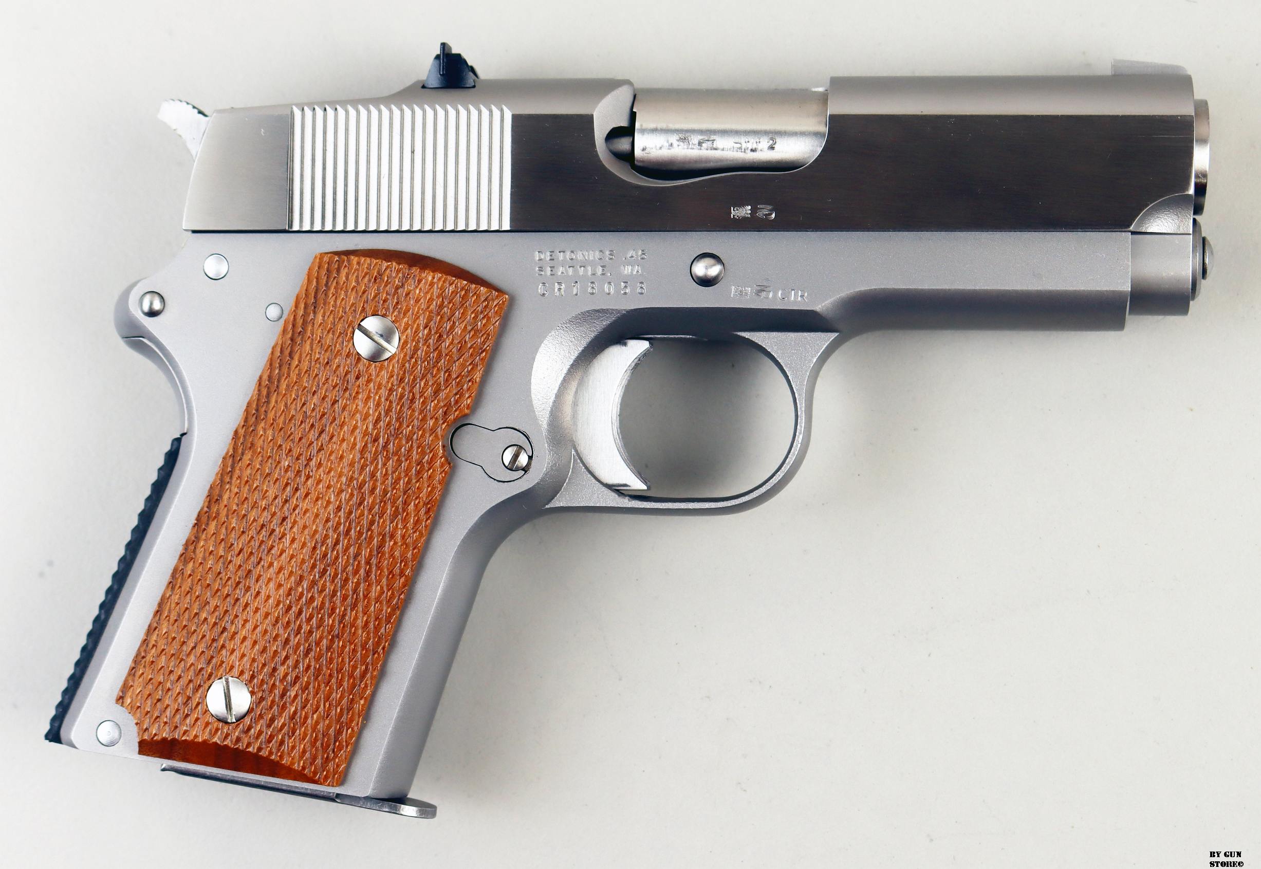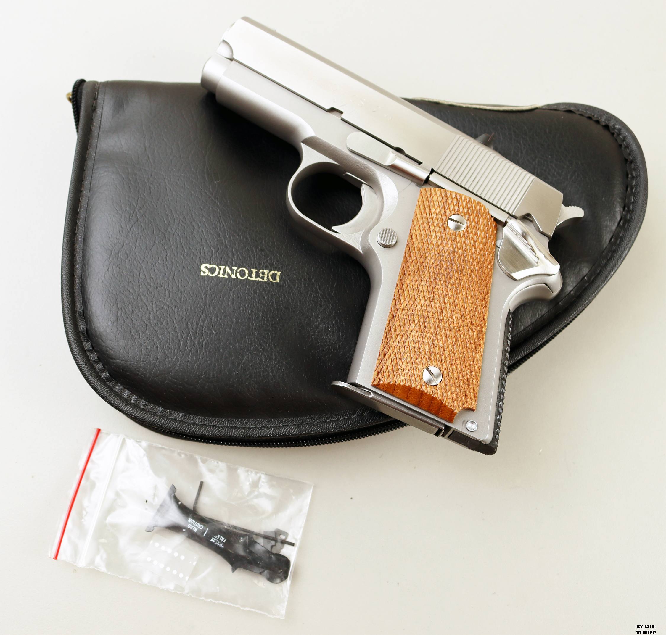 Condizioni eccellenti per questa rarissima pistola semiautomatica compatta prodotta dalla Detonics nello stato di Washington. Si stima che di tutta la produzione del modello MKVI comunemente camerato in .45 ACP, solamente 300/350 pz. vennero realizzati in cal. 9×19; non a caso i fusti erano i medesimi per entrambe i calibri ed a testimonianza di ciò erano tutti marcati “.45” (anche quello di questa riporta “Detonics .45″. Proveniente da collezione si presenta con la classica finitura inox satinato perfetta, canna 3 ” 1/2 a specchio con ottime rigature, guancette in legno intonse. In confezione originale con custodia morbida imbottita e sovrascatola in cartone matricolata. Prontissima per una nuova collezione. Arma Comune.