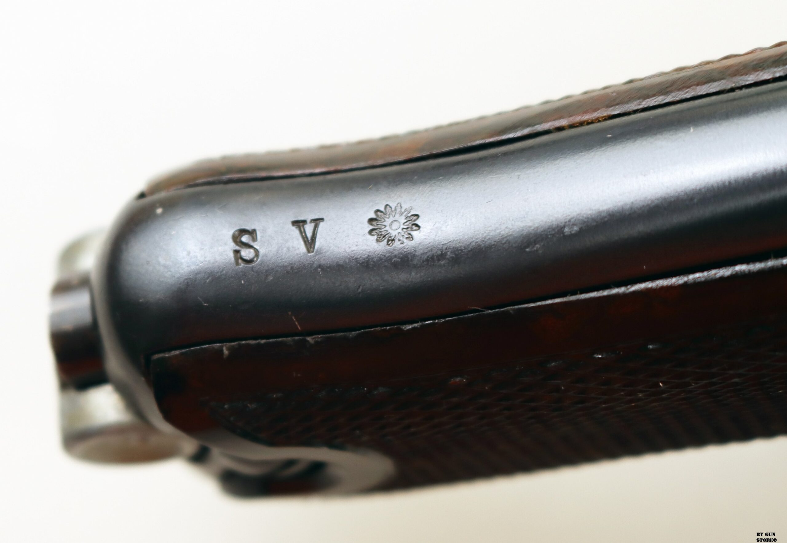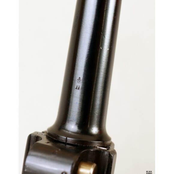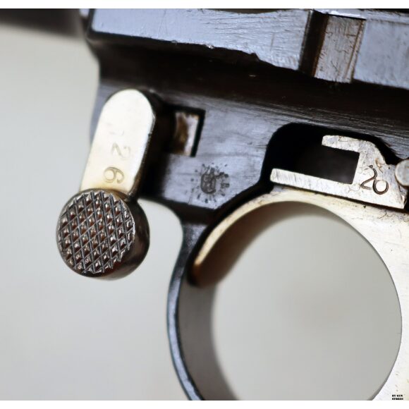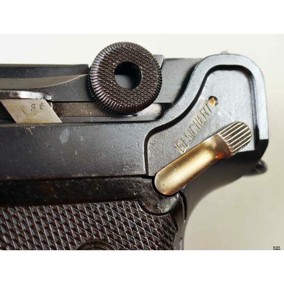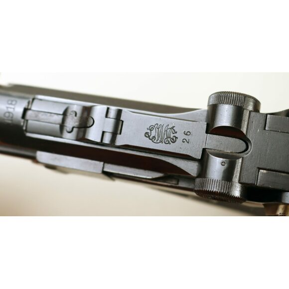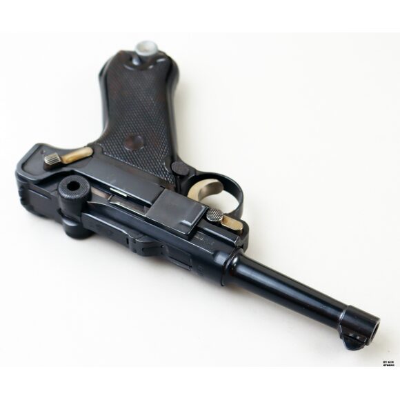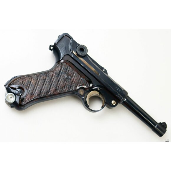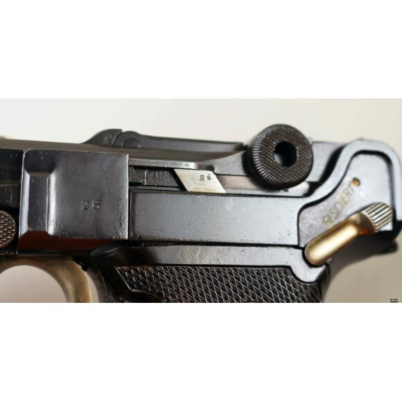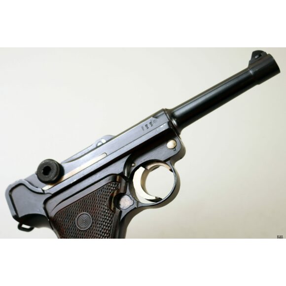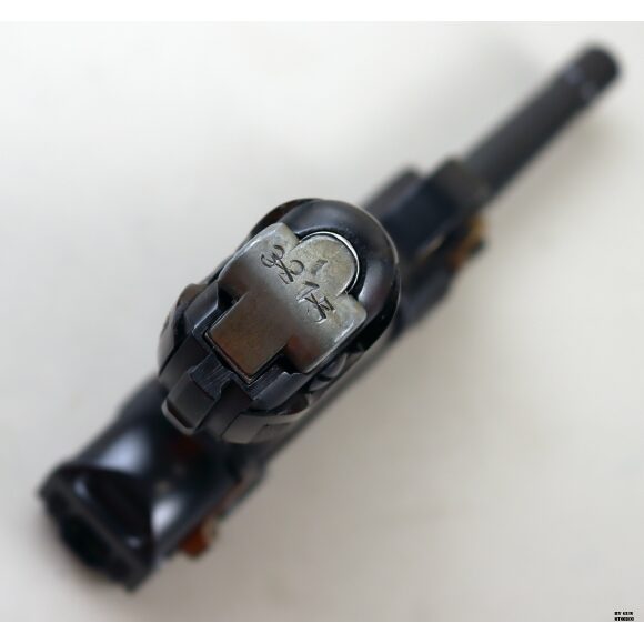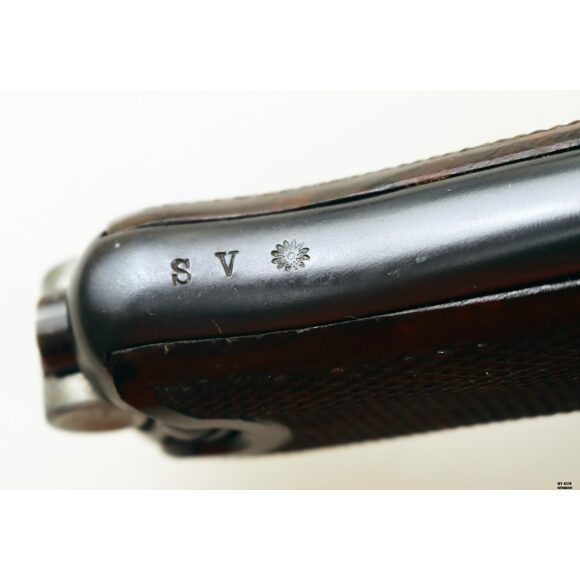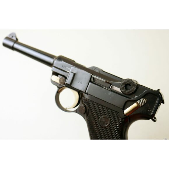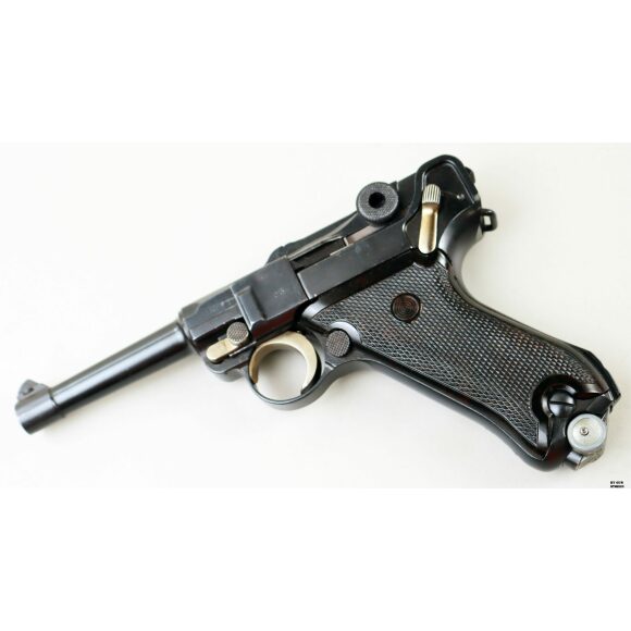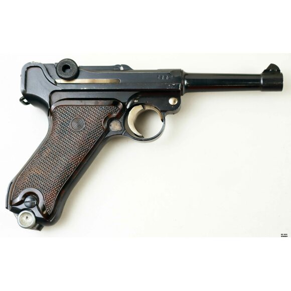 Anno 1918 per questa pistola prodotta originariamente dalla Deutsche Waffen- und Munitionsfabriken, meglio conosciuta come DWM. Ebbe una seconda vita, dopo la Prima Guerra Mondiale nella VOPO, Sicherheitspolizei Ostberlin. Spesso riassemblate questa di sicuro monta una canna di origina commerciale degli anni ’30, identificabile dal punzone nitroproof “N” coronato. SV con il sole della Polizia di Berlino può indicare la Sowjetzone. Canna e azione sono molto valide. L’arma monta le tipiche guancette dell’epoca VOPO. Interessante pezzo da collezione, calibro 9×19 parabellum e arma sportiva.