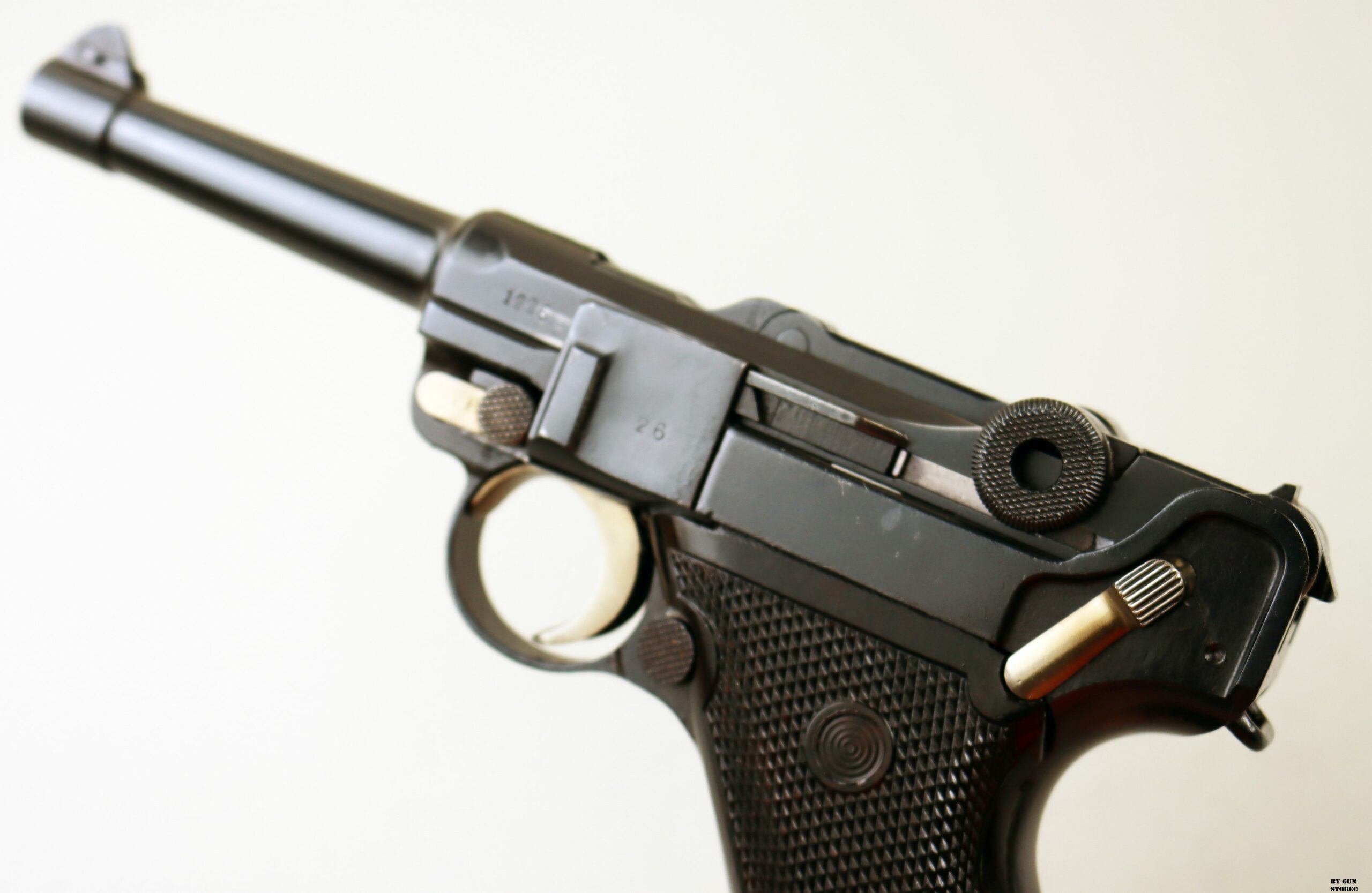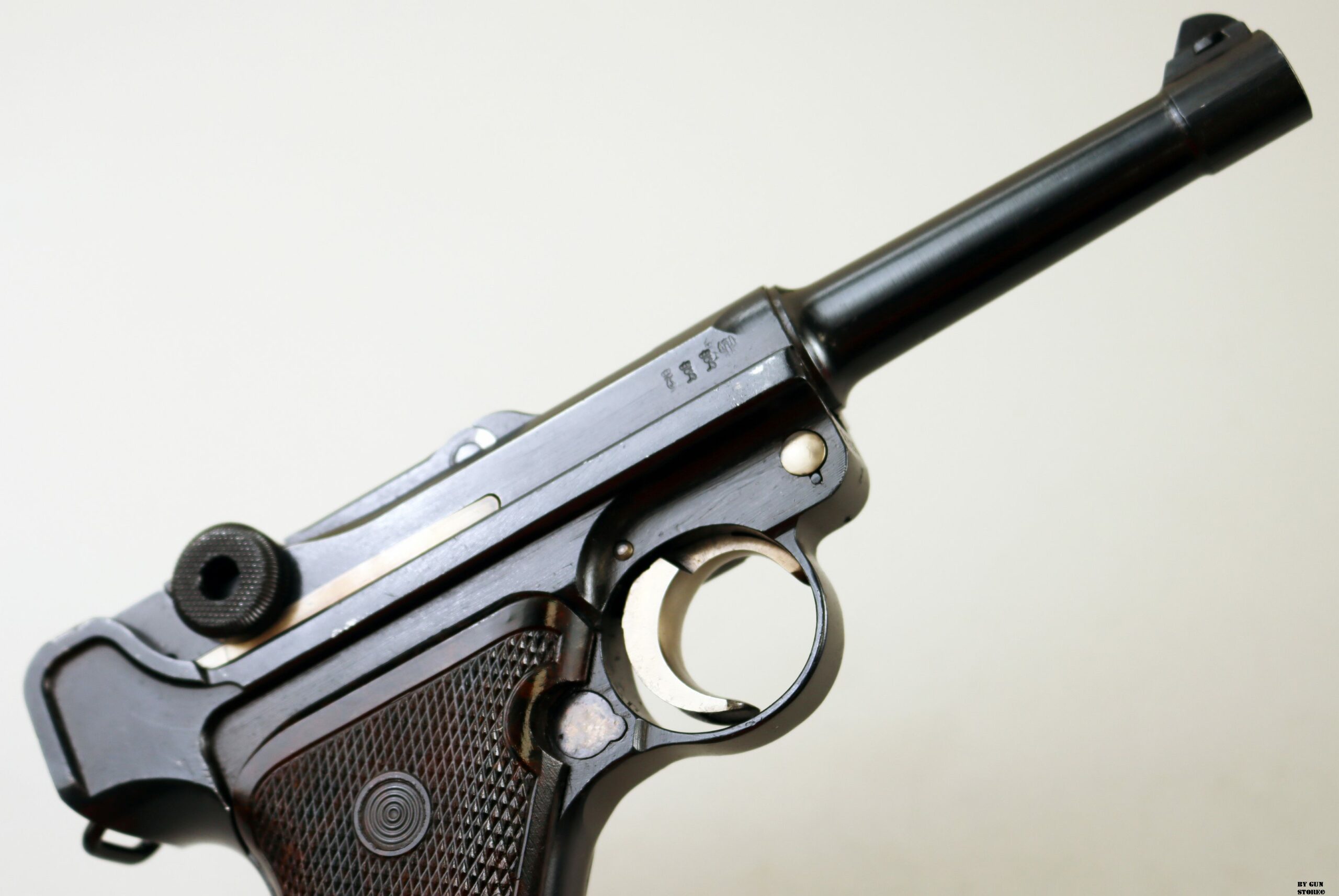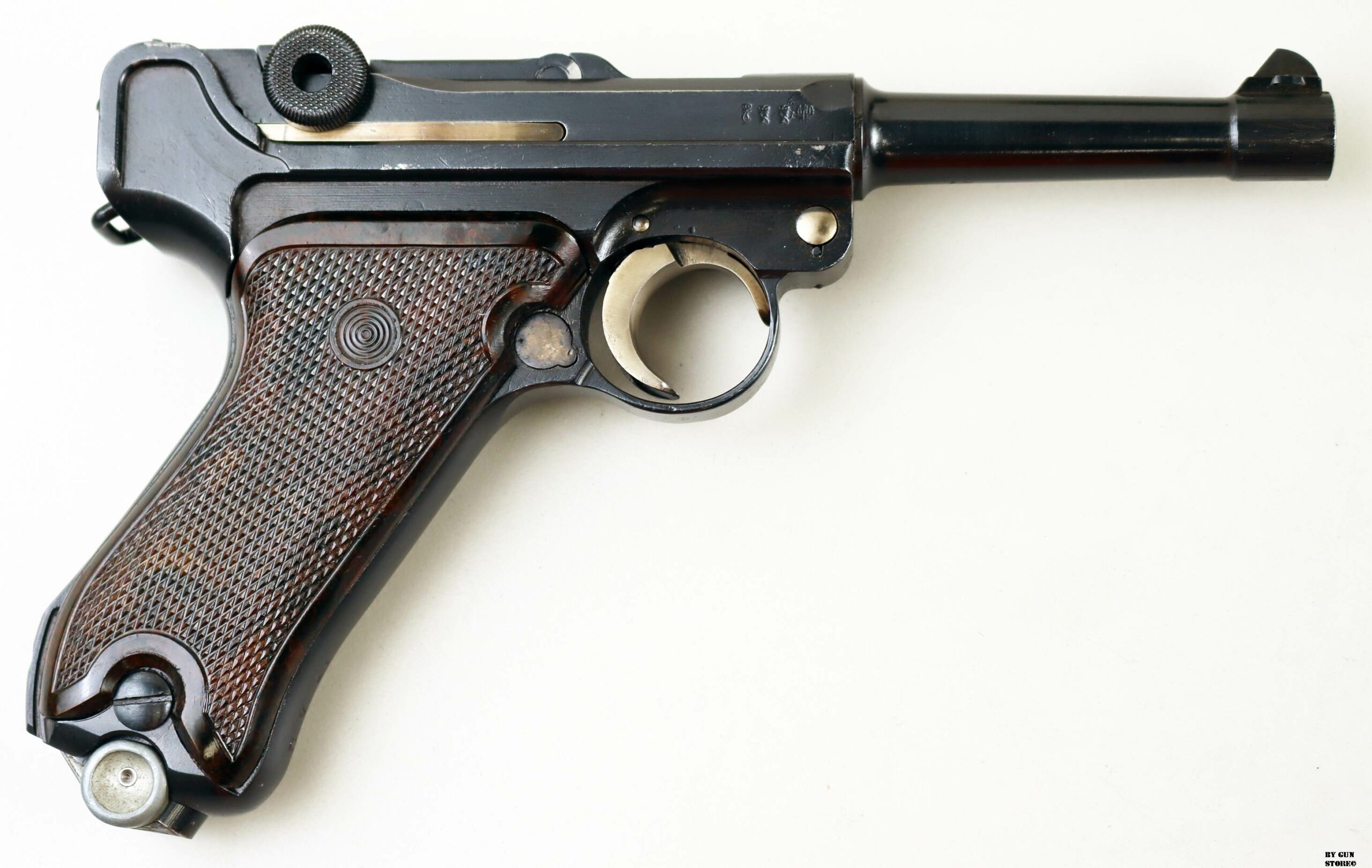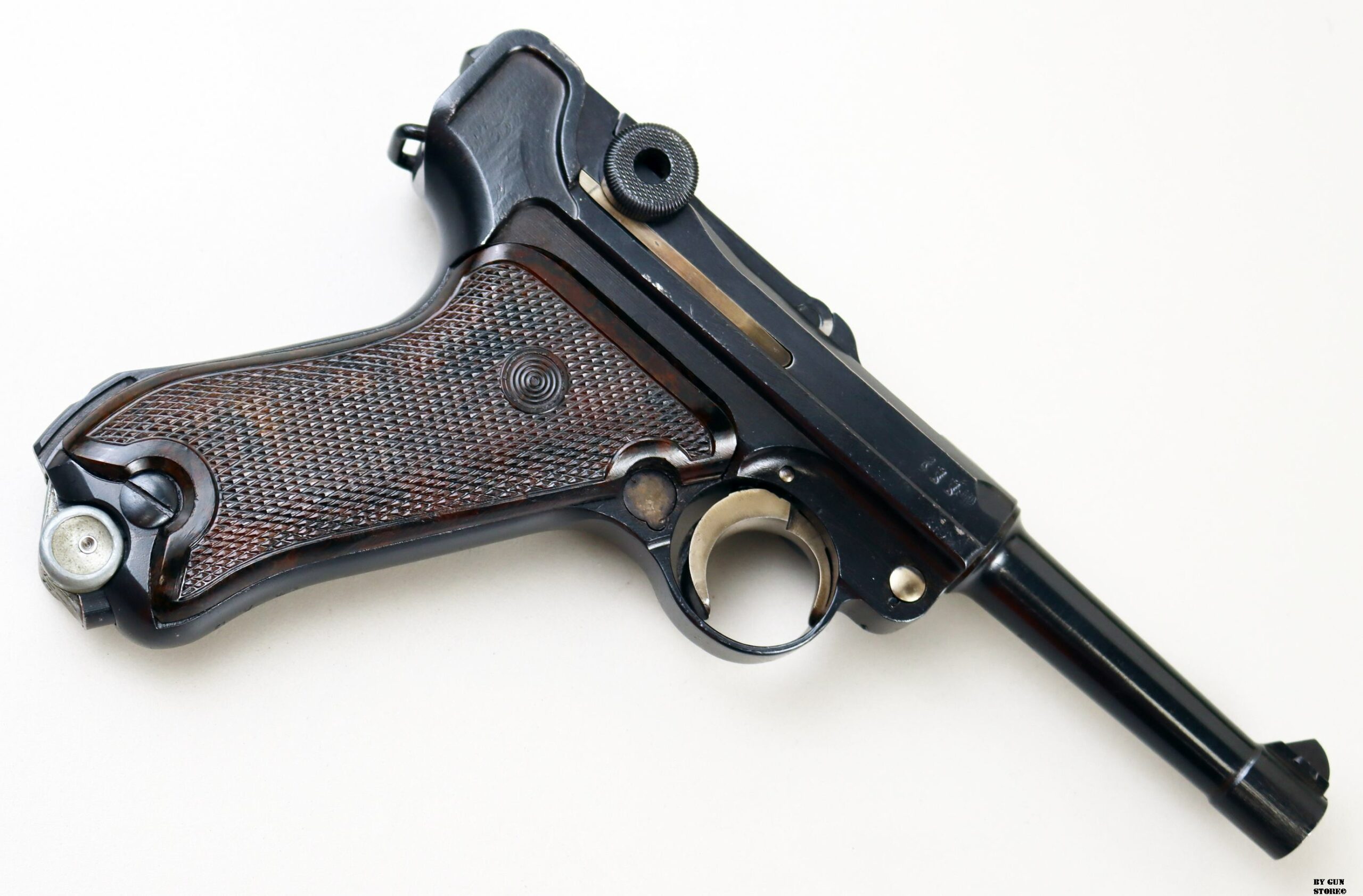 Anno 1918 per questa pistola prodotta originariamente dalla Deutsche Waffen- und Munitionsfabriken, meglio conosciuta come DWM. Ebbe una seconda vita, dopo la Prima Guerra Mondiale nella VOPO, Sicherheitspolizei Ostberlin. Spesso riassemblate questa di sicuro monta una canna di origina commerciale degli anni ’30, identificabile dal punzone nitroproof “N” coronato. SV con il sole della Polizia di Berlino può indicare la Sowjetzone. Canna e azione sono molto valide. L’arma monta le tipiche guancette dell’epoca VOPO. Interessante pezzo da collezione, calibro 9×19 parabellum e arma sportiva.