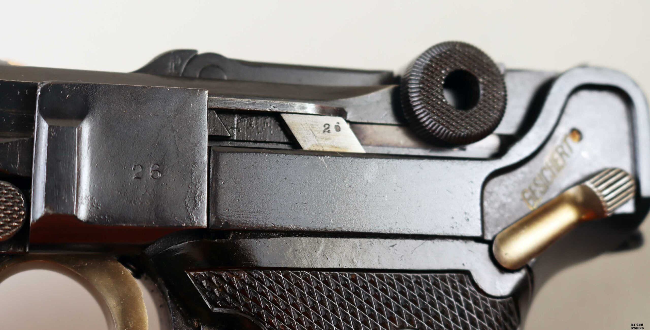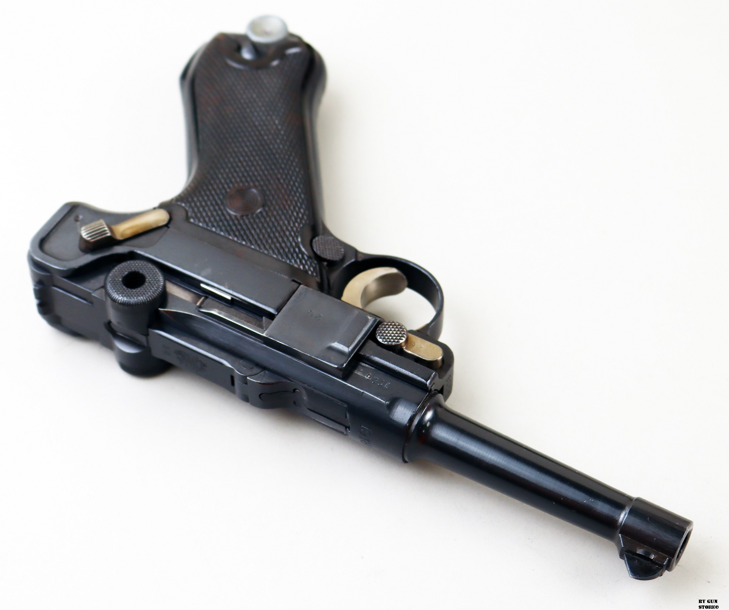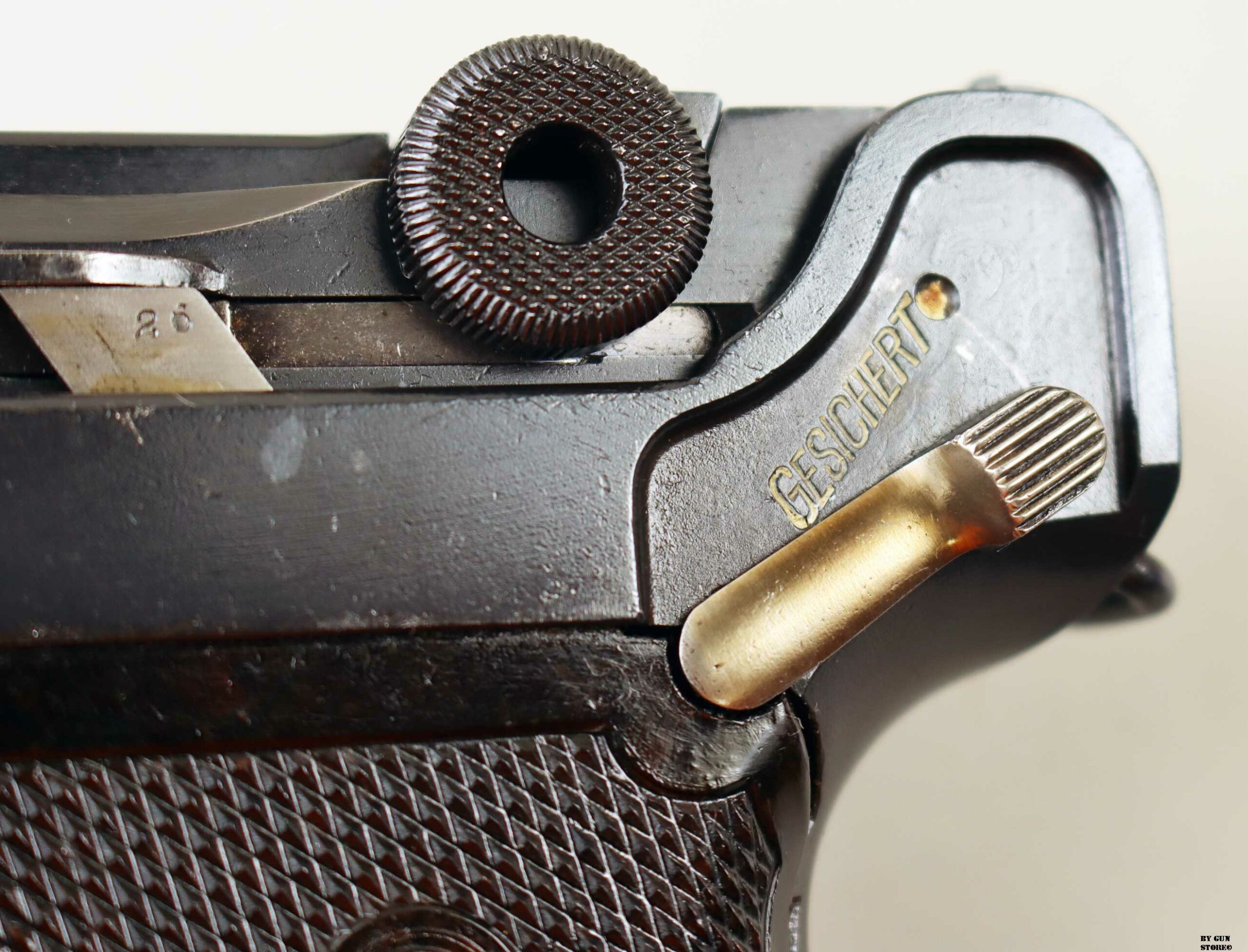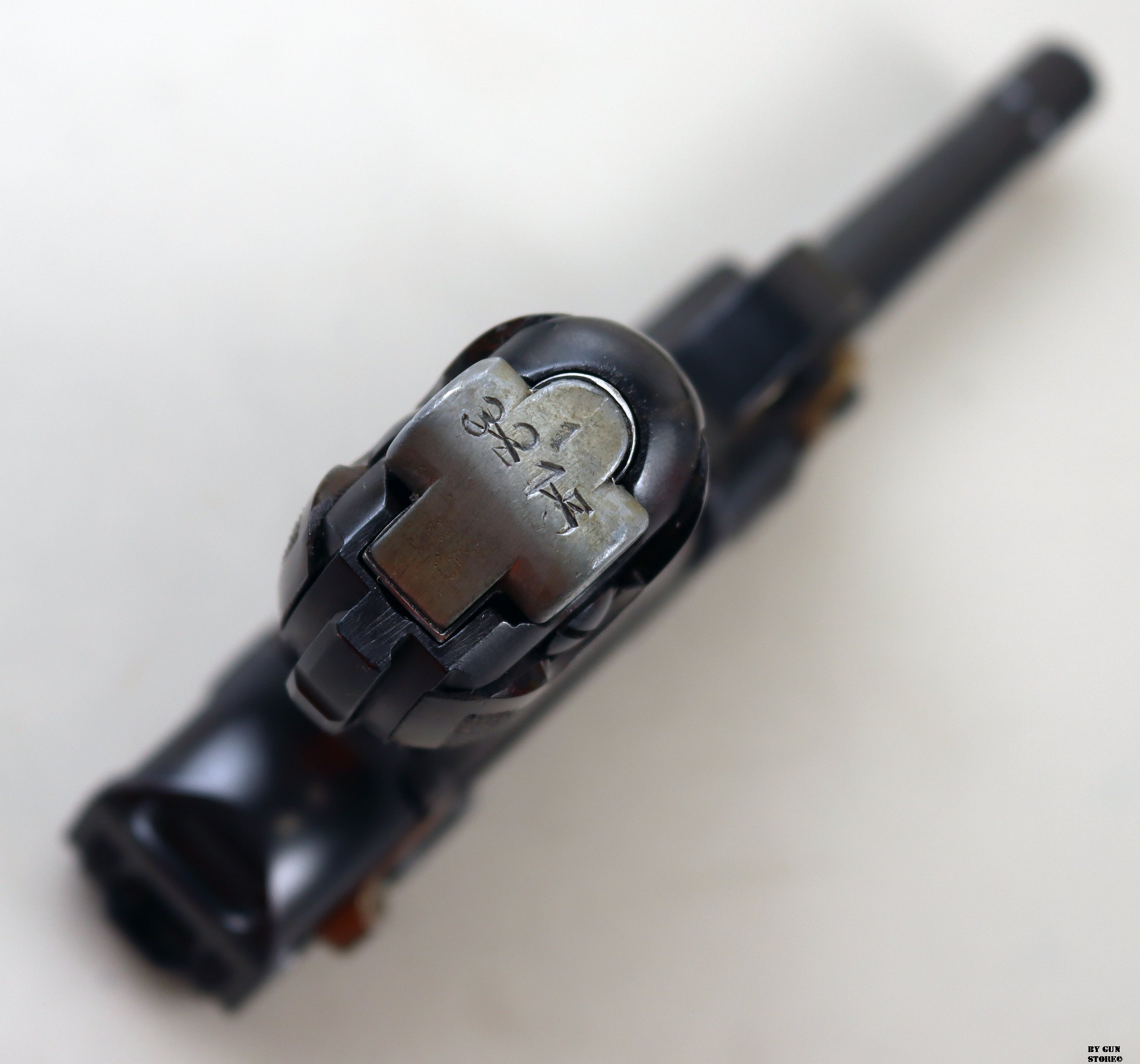 Anno 1918 per questa pistola prodotta originariamente dalla Deutsche Waffen- und Munitionsfabriken, meglio conosciuta come DWM. Ebbe una seconda vita, dopo la Prima Guerra Mondiale nella VOPO, Sicherheitspolizei Ostberlin. Spesso riassemblate questa di sicuro monta una canna di origina commerciale degli anni ’30, identificabile dal punzone nitroproof “N” coronato. SV con il sole della Polizia di Berlino può indicare la Sowjetzone. Canna e azione sono molto valide. L’arma monta le tipiche guancette dell’epoca VOPO. Interessante pezzo da collezione, calibro 9×19 parabellum e arma sportiva.