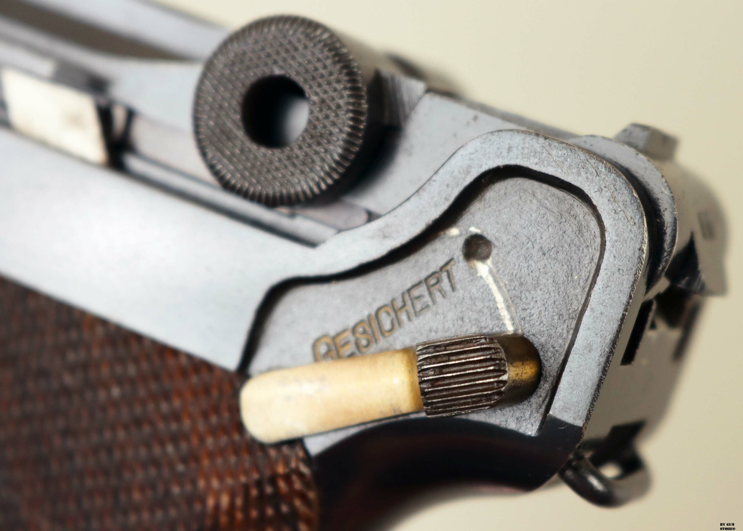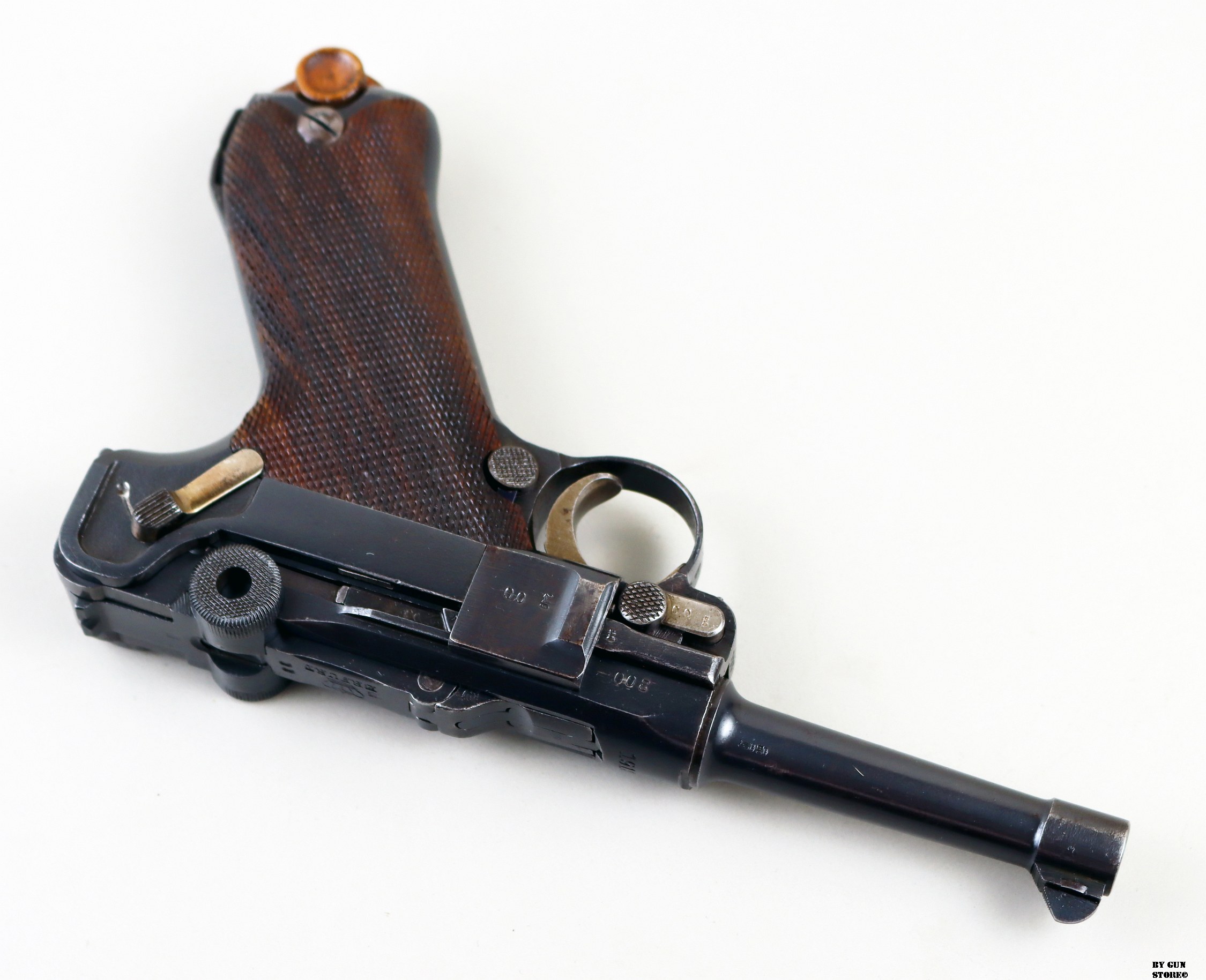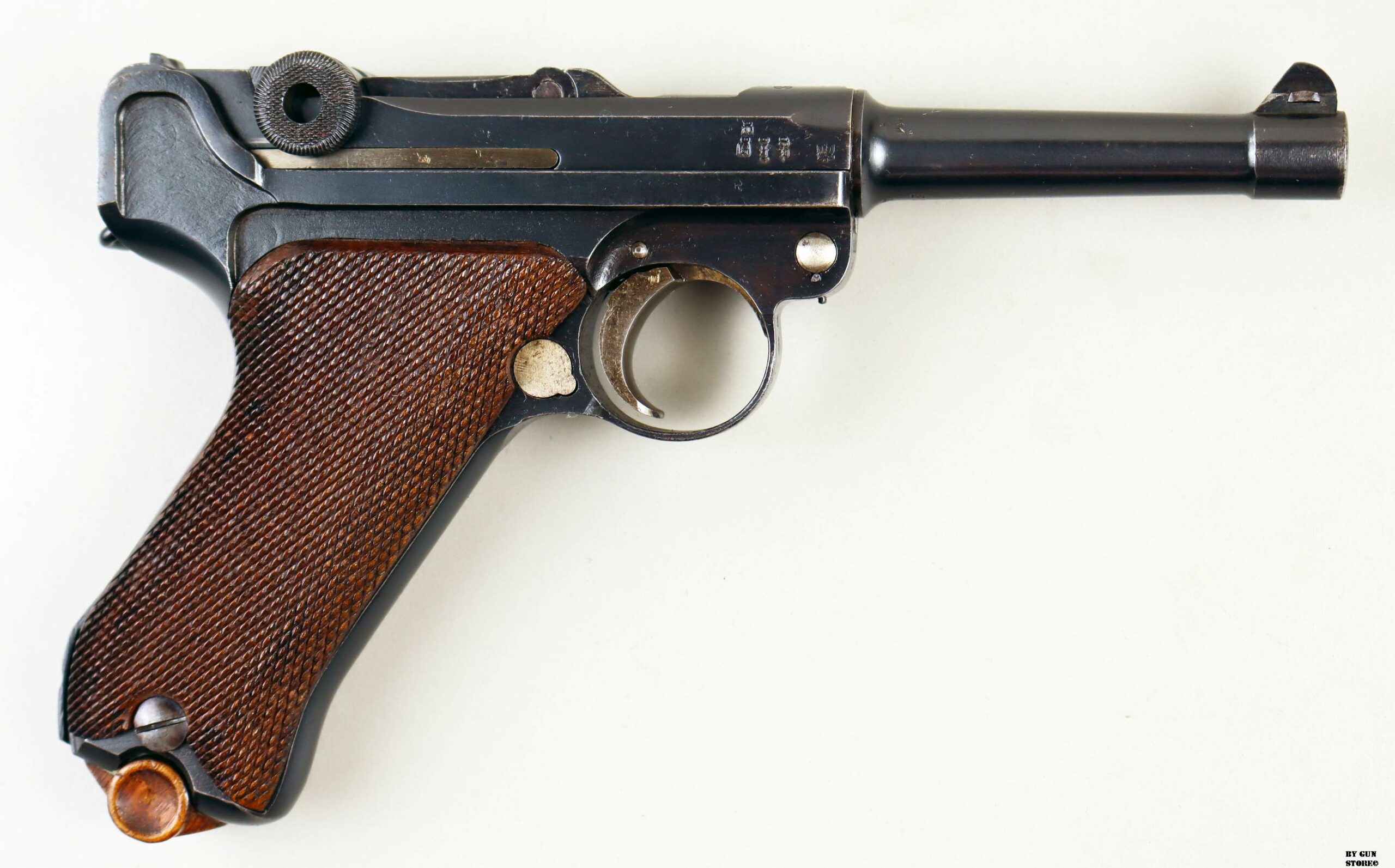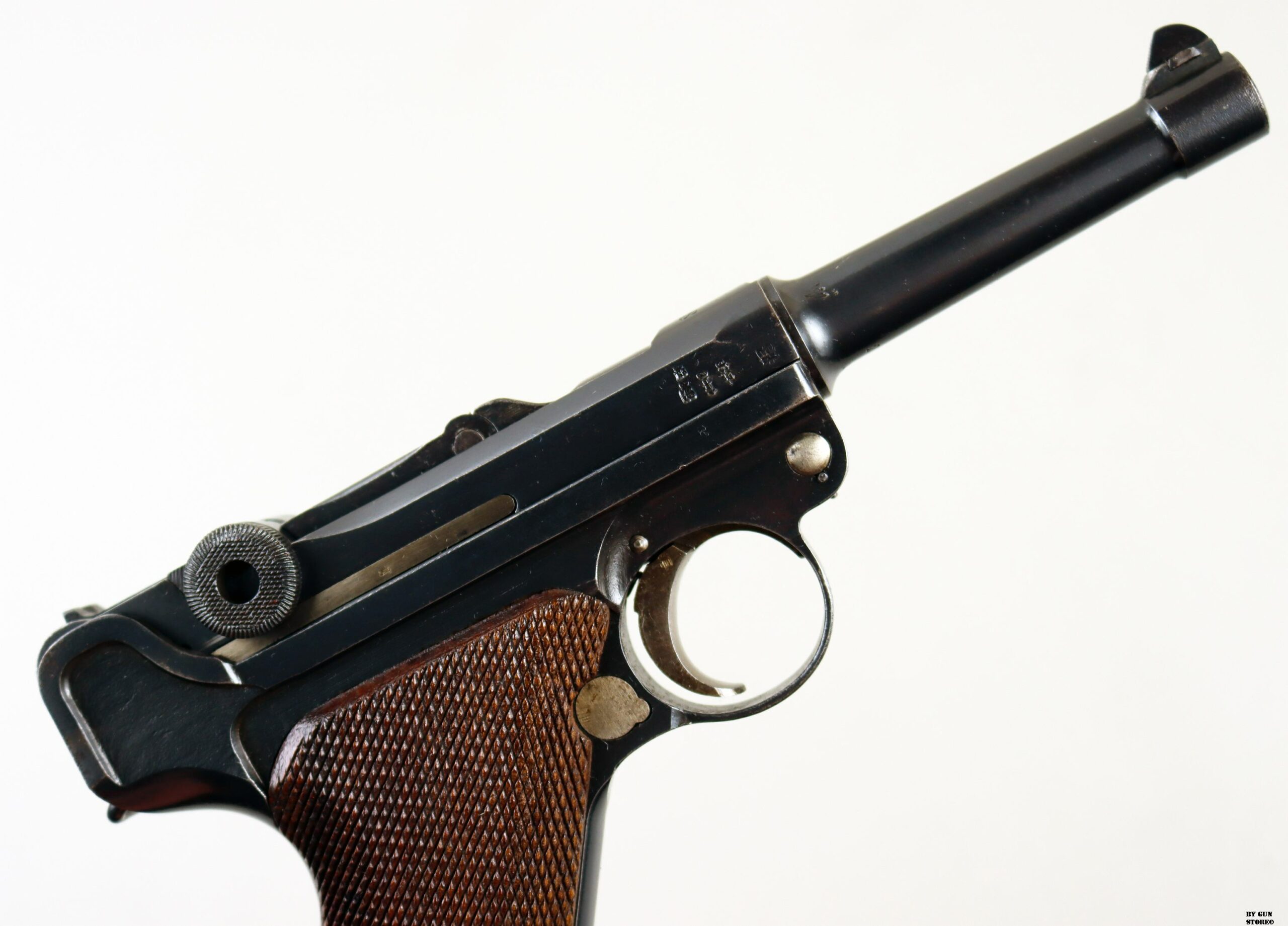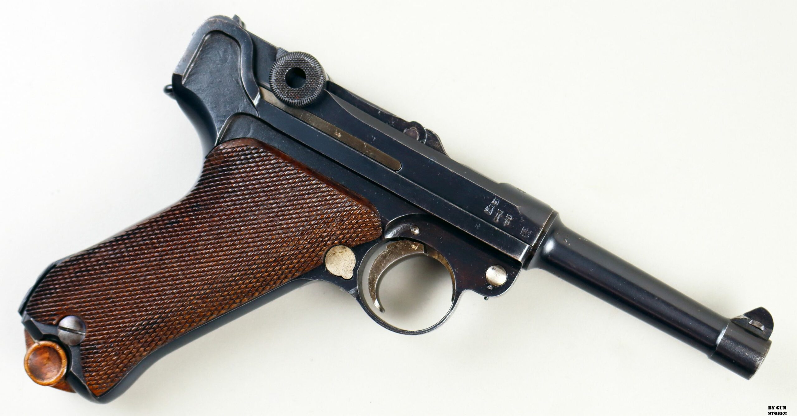 Anno 1918 per questa non comune pistola Luger modello P08 prodotta presso lo stabilimento Erfurt. Un’arma d’Ordinanza ormai molto rara con brunitura ottima e rigorosamente originale. Dorature bene conservate e arma monomatricola dappertutto (guancette e caricatore compresi). Presenta tutte le marcature imperiali corrette. Canna in ordine con rigature valide e meccanica ottima. Vero pezzo carico di Storia e ottimo pezzo per una collezione a tema. Calibro 9×19 parabellum, classificazione sportiva al n° 22_00059s2