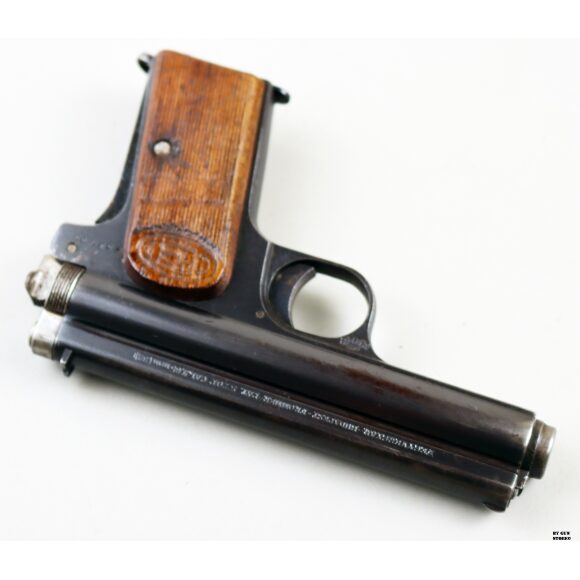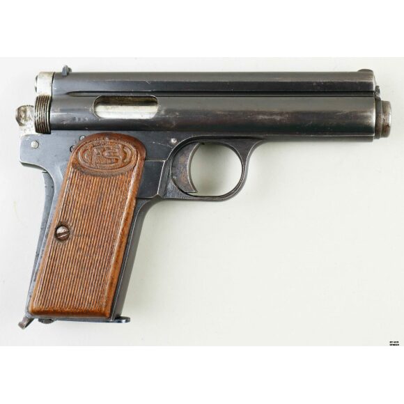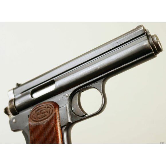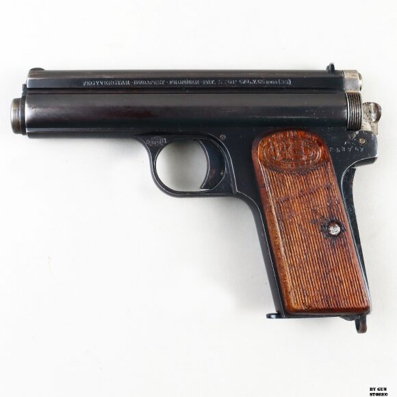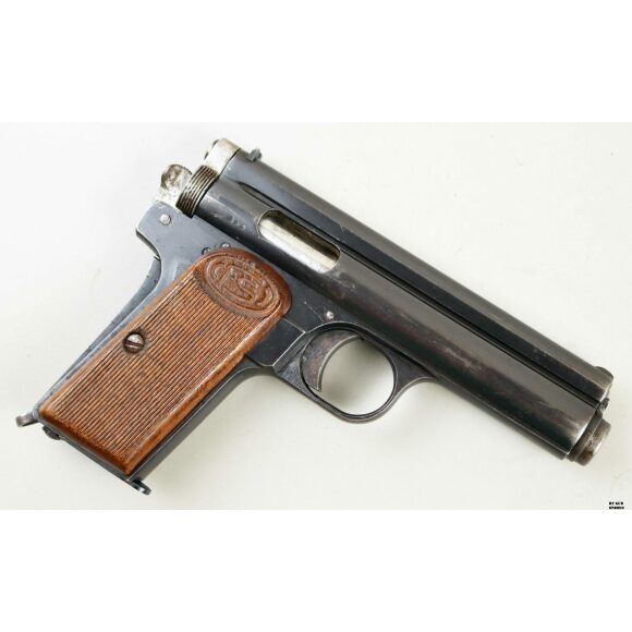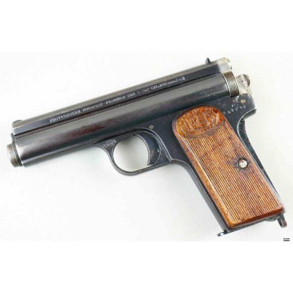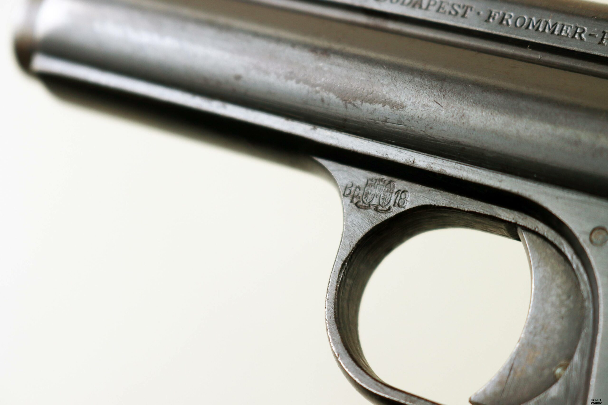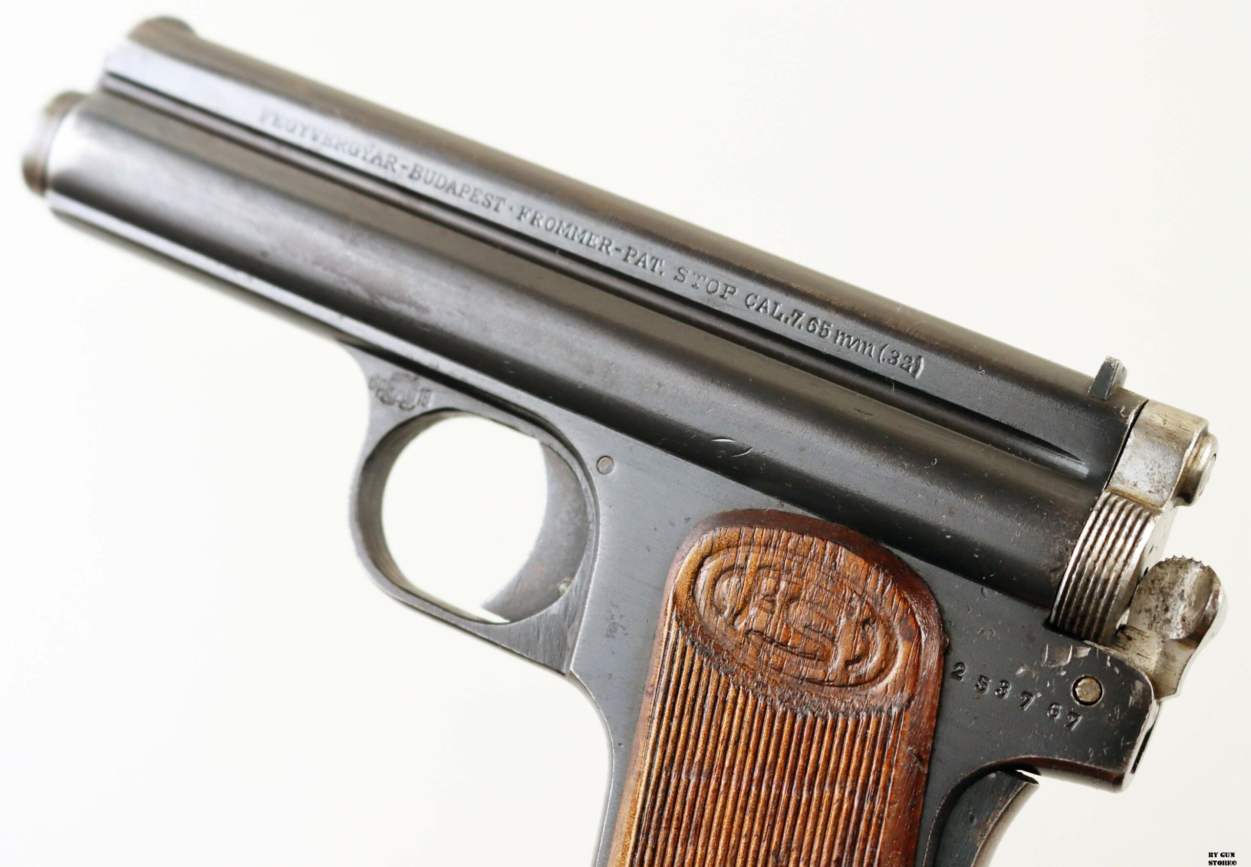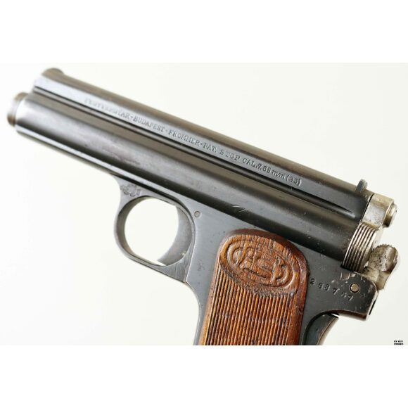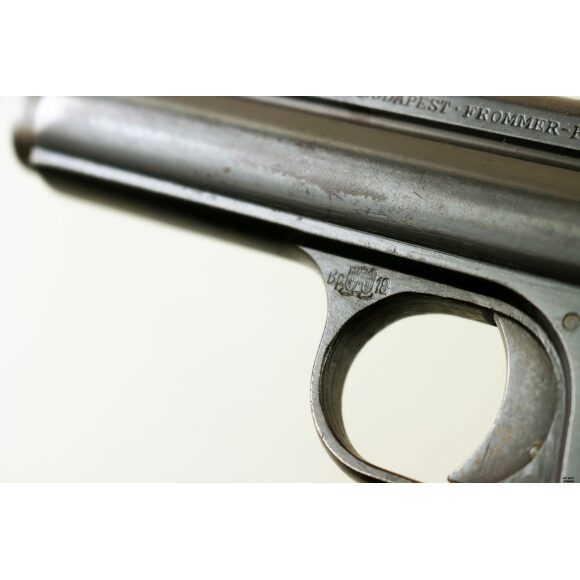 Progettata da Rudolph Frommer, con meccanica a lungo rinculo e costruita dalla Fegyvergyar (FEG) a Budapest dal 1912 (primo contratto), era l’arma da fianco compatta dell’Honvédség, il Regio Esercito Ungherese, per il quale quest’arma fu protagonista nel primo conflitto mondiale. Successivamente dal 1914 iniziarono le commesse di costruzione per tutti gli alleati delle potenze centrali oltre anche un lotto per destinazione commerciale. Questa che presentiamo in ottime condizioni è una versione militare. E’ infatti distinta dalla produzione civile, dai marchi presenti a sinistra sul ponticello del grilletto. Presenta BP (=Budapest) con gli stemmi araldici dell’Impero Austro-Ungarico e il 17 che identifica l’anno 1917 (produzione matricole da 133.000 alla 208.500). Riguardo al calibro è doveroso segnalare che, seppur classificata con il calibro 7,65×17 Browning, il calibro della Stop è il 7,65×17 Frommer. Non è raro trovare tiratori e possessori di questa arma che lamentano il mancato riarmo del secondo colpo oppure di un inceppamento. Infatti la munizione originaria, nonostante abbia le stesse identiche quote del Browning, ha una potenza superiore che permette il riarmo semiautomatico senza alcun problema. Vera icona della Prima Guerra Mondiale, con brunitura originale e meccanica ottima, punzonata nel 1918. Arma comune.