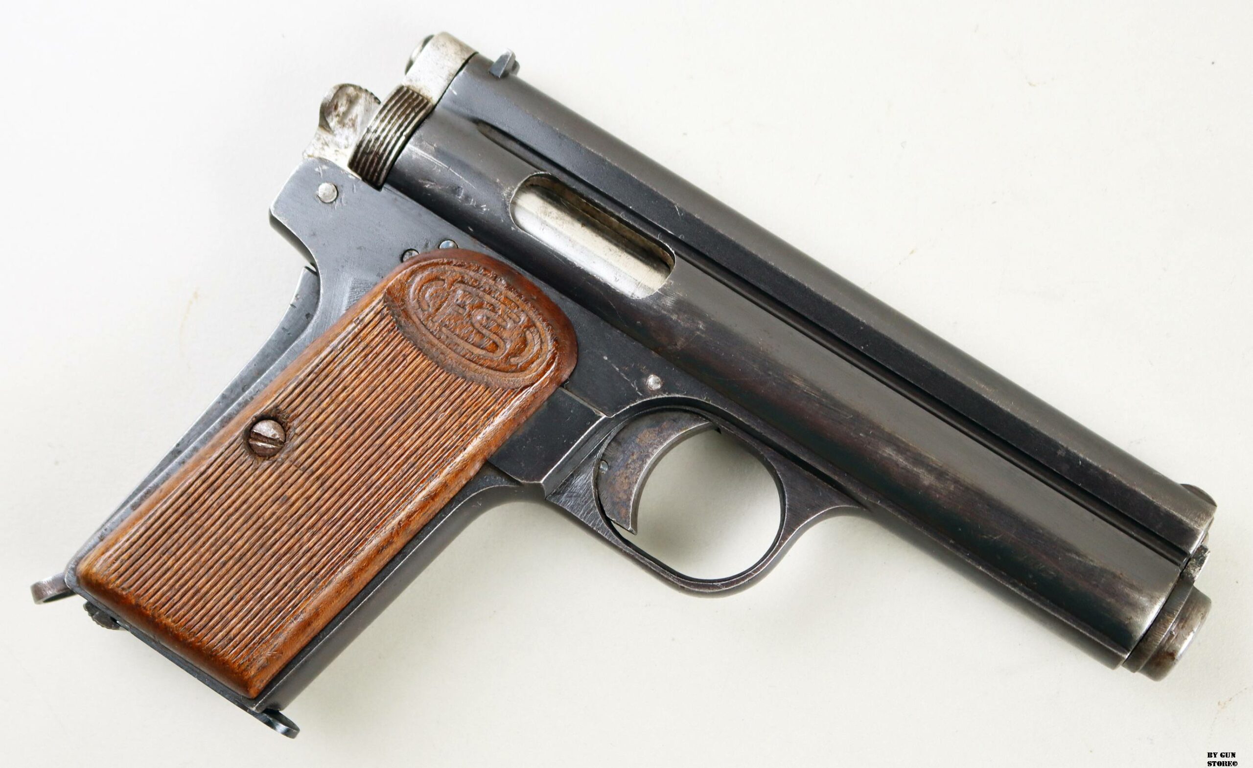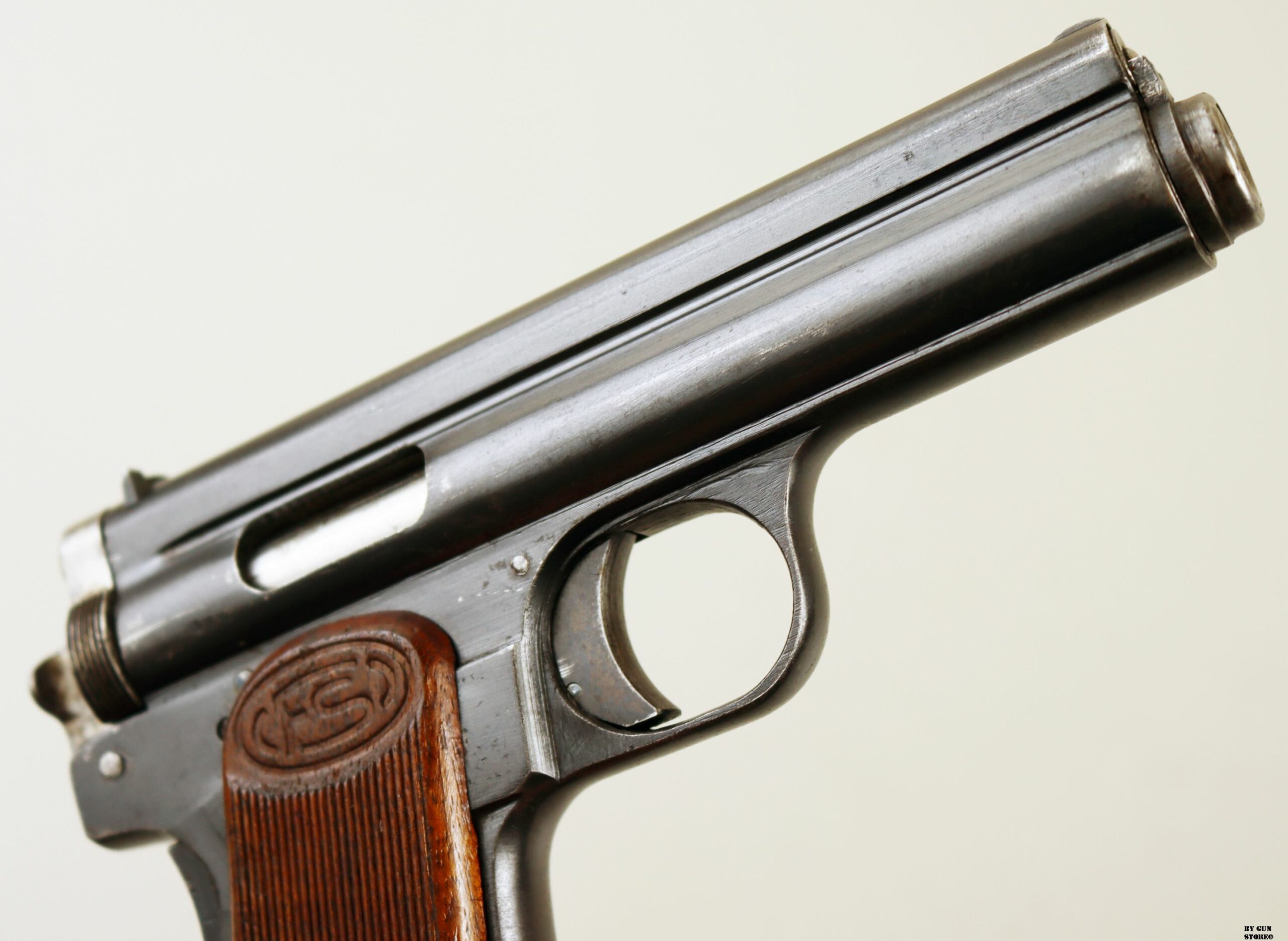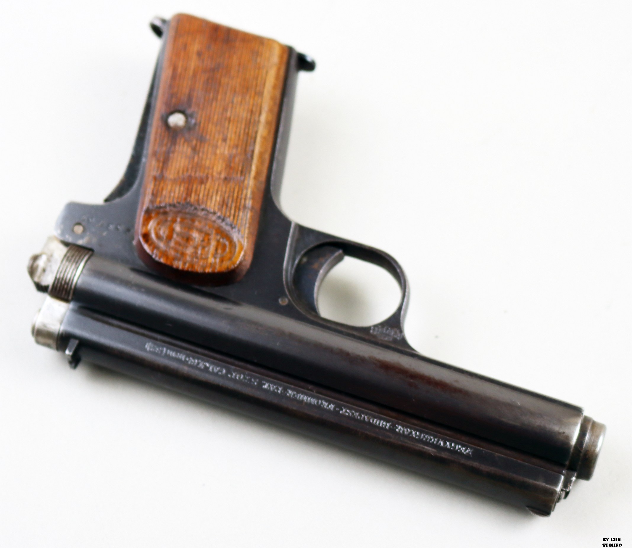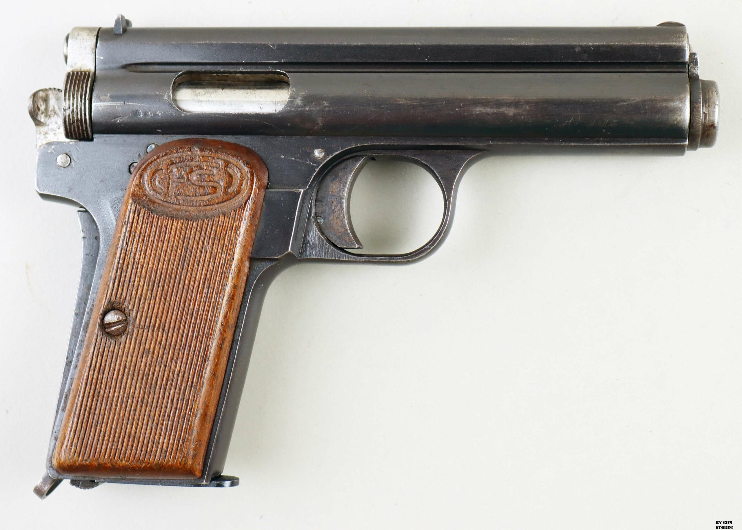 Progettata da Rudolph Frommer, con meccanica a lungo rinculo e costruita dalla Fegyvergyar (FEG) a Budapest dal 1912 (primo contratto), era l’arma da fianco compatta dell’Honvédség, il Regio Esercito Ungherese, per il quale quest’arma fu protagonista nel primo conflitto mondiale. Successivamente dal 1914 iniziarono le commesse di costruzione per tutti gli alleati delle potenze centrali oltre anche un lotto per destinazione commerciale. Questa che presentiamo in ottime condizioni è una versione militare. E’ infatti distinta dalla produzione civile, dai marchi presenti a sinistra sul ponticello del grilletto. Presenta BP (=Budapest) con gli stemmi araldici dell’Impero Austro-Ungarico e il 17 che identifica l’anno 1917 (produzione matricole da 133.000 alla 208.500). Riguardo al calibro è doveroso segnalare che, seppur classificata con il calibro 7,65×17 Browning, il calibro della Stop è il 7,65×17 Frommer. Non è raro trovare tiratori e possessori di questa arma che lamentano il mancato riarmo del secondo colpo oppure di un inceppamento. Infatti la munizione originaria, nonostante abbia le stesse identiche quote del Browning, ha una potenza superiore che permette il riarmo semiautomatico senza alcun problema. Vera icona della Prima Guerra Mondiale, con brunitura originale e meccanica ottima, punzonata nel 1918. Arma comune.