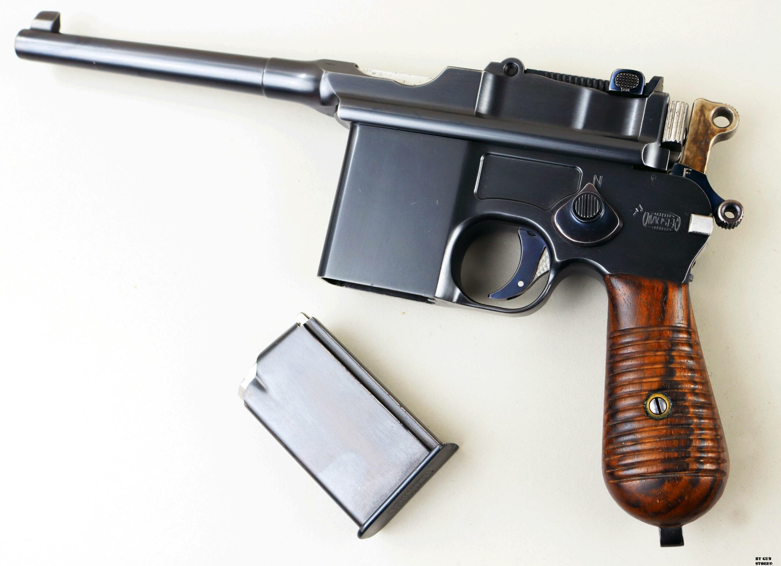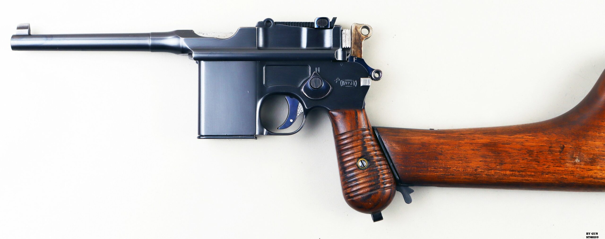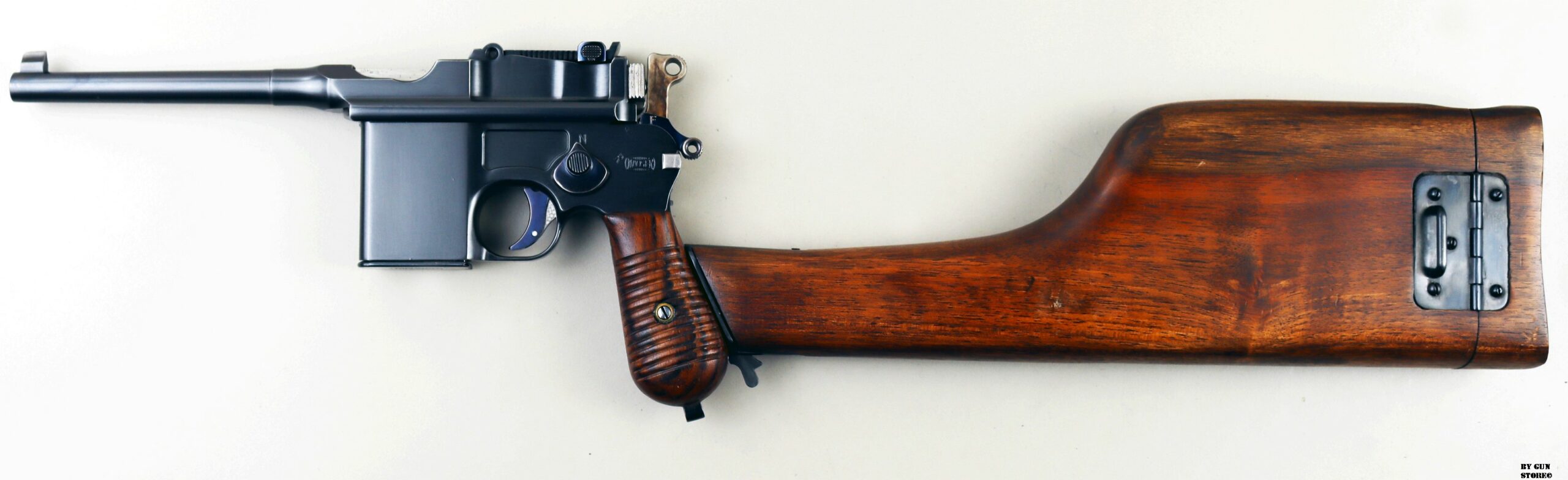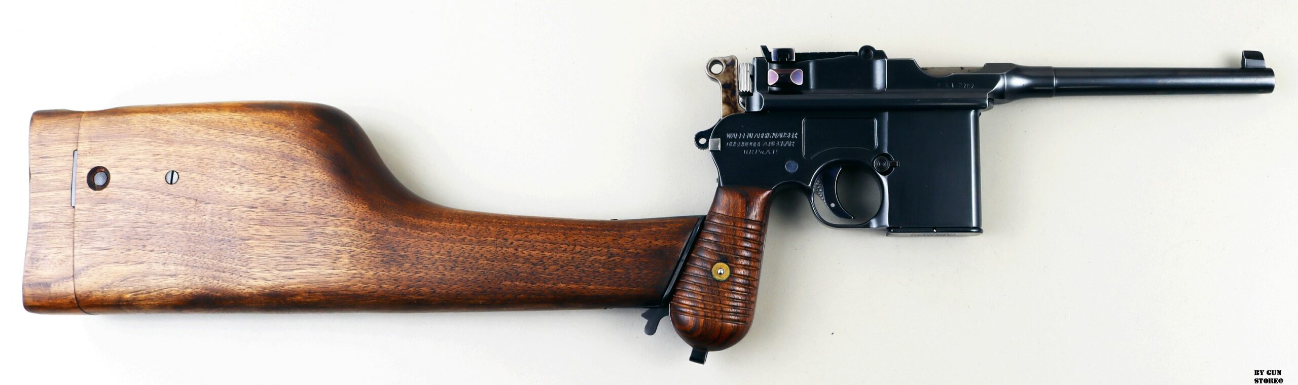 Le aziende spagnole Beistegui Hermanos e Astra iniziarono a produrre versioni della C96 alimentate da caricatore amovibile e a fuoco selettivo rispettivamente nel 1927 e nel 1928, destinate all’esportazione in Estremo Oriente. La Mauser per non perdere quote di mercato iniziò la produzione dello Schnellfeuer (fuoco rapido), la loro versione a fuoco selettivo e caricatore staccabile dell’M30 progettata dall’ingegnere Karl Westinger. La produzione iniziò nel 1932 e terminò nel 1938. Un progetto di grande successo, con circa 98.000 pezzi prodotti con una propria serie di range matricolare. Gran parte della produzione fu destinata all’esportazione in Sud America, Cina e per la guerra civile spagnola. Dal 1932 al 1935, l’esercito jugoslavo testò lotti di Schnellfeuer sia in 7,63 mm sia in 9×19. Anche il governo brasiliano acquistò cinquecento pistole mitragliatrici Schnellfeuer per la Policia Militar do Distrito Federal. Nel 1939, le forze armate tedesche iniziarono ad acquisire la Schnellfeuer con la denominazione militare “Reihenfeuer (“Serie di fuoco”) Pistole Modell 712″. Queste furono distribuite alle unità di polizia militare della Wehrmacht, delle Waffen-SS, alla Kriegsmarine per l’uso della fanteria di marina e alla Luftwaffe per portaordini motociclisti e reparti dell’antiaerea. Si tratta di 7.800 pezzi compresi nel range matricolare da 83.000 e 93.000 (questa è la numero 86599). L’arma ha una canna da 5,5 pollici, un gruppo di mira posteriore graduato da 50 a 1.000 metri e l’attacco per un un calciolo/fondina in legno (presente). Si differenzia dalla C96 standard per il caricatore amovibile e un selettore di fuoco sul lato sinistro del telaio con marcature “N” per “Normalfeuer” (fuoco a colpo singolo) e Reihenfeuer (“fuoco in serie”). Di fianco è presente il MAUSER banner. In modalità completamente automatica, la pistola produce una cadenza ciclica di circa 900 colpi al minuto, il che la rende quasi incontrollabile se non si monta il calciolo. Questa si presenta in ottime condizioni generali con canna, meccanica e azione ottime. Ha una bellissima brunitura a tampone e ai sali (grilletto, estrattore, cursore dell’alzo, selettore) che sono successive alla produzione. Comuque un ottimo pezzo con classificazione ad uso sportivo 24_00010ds1