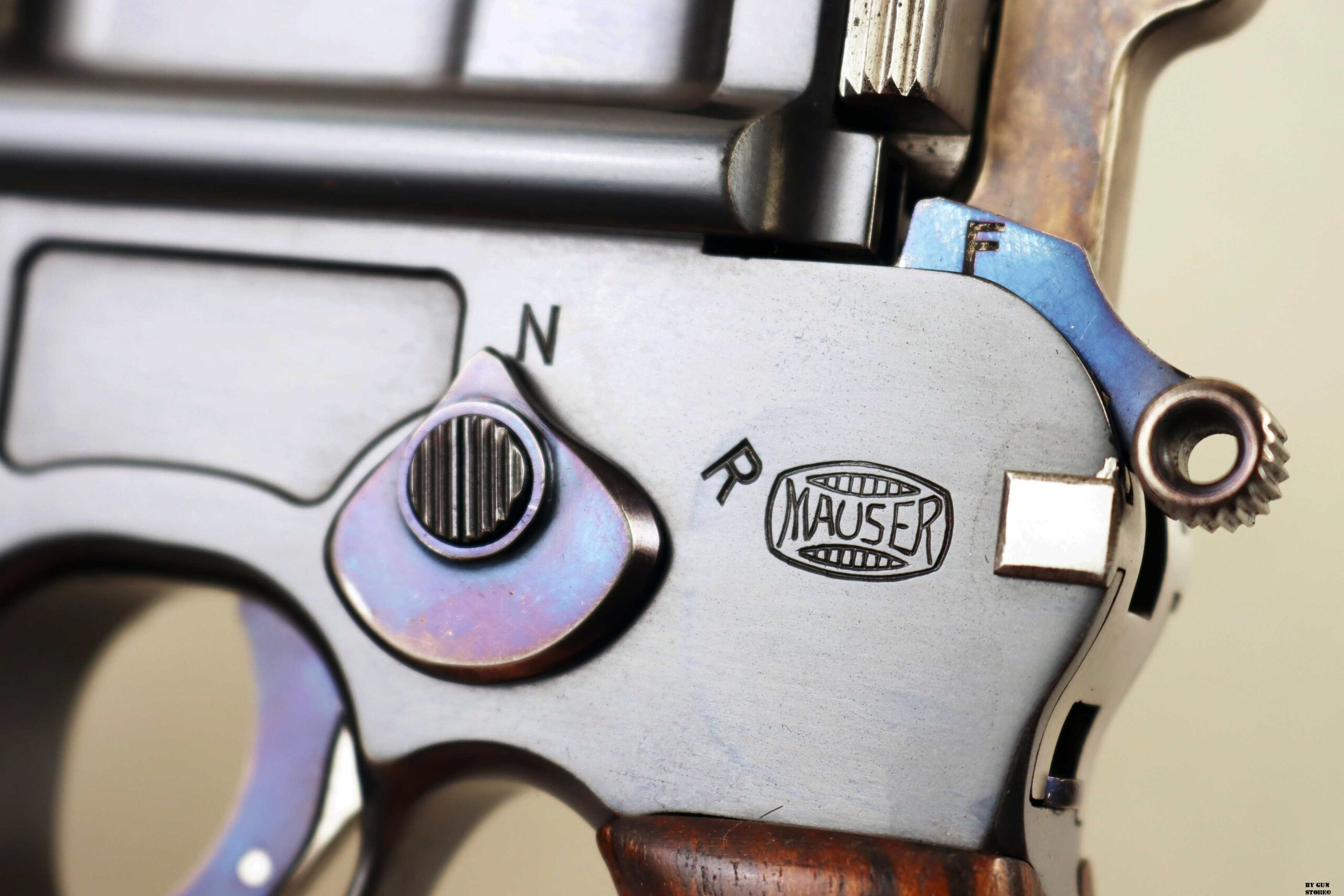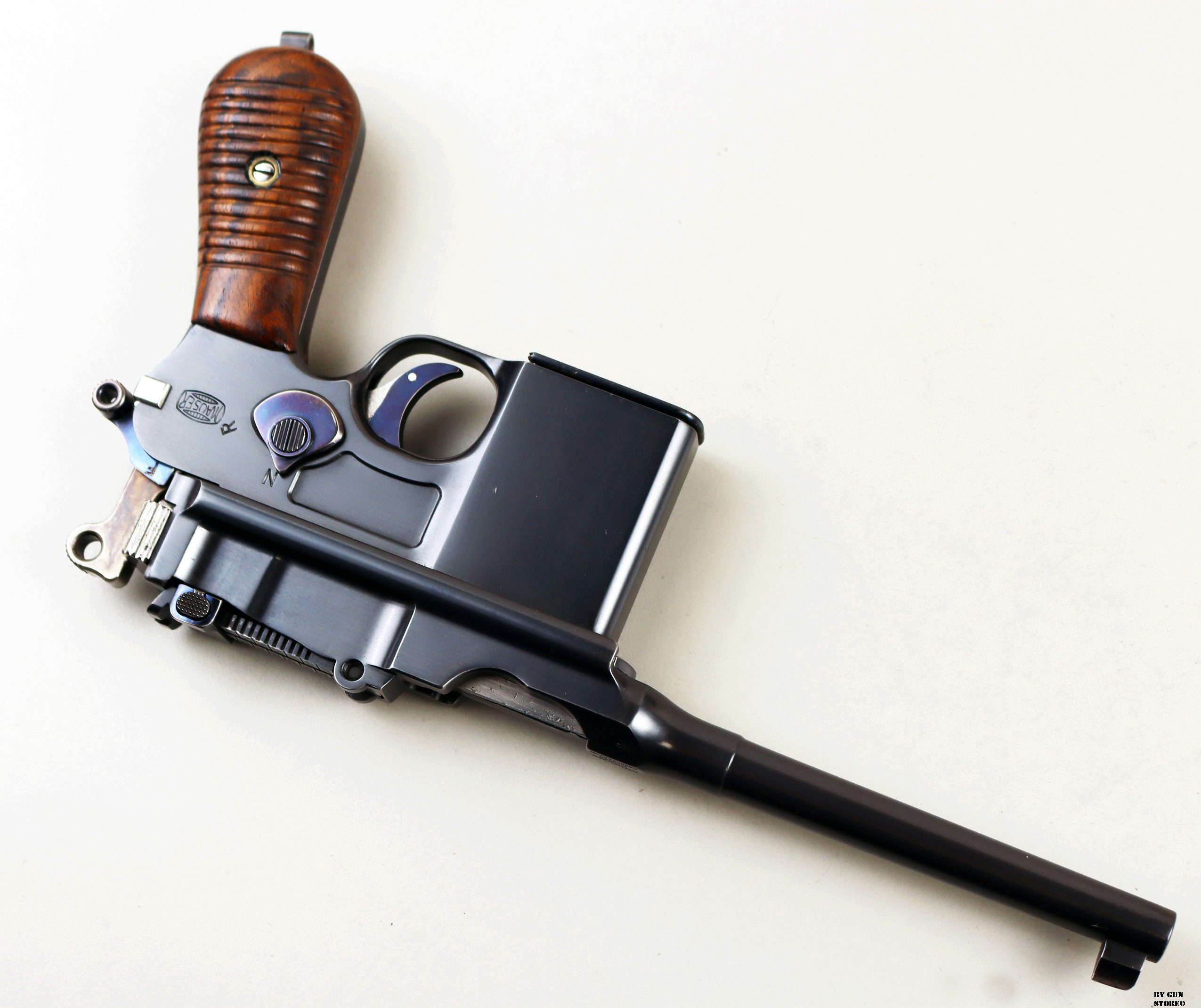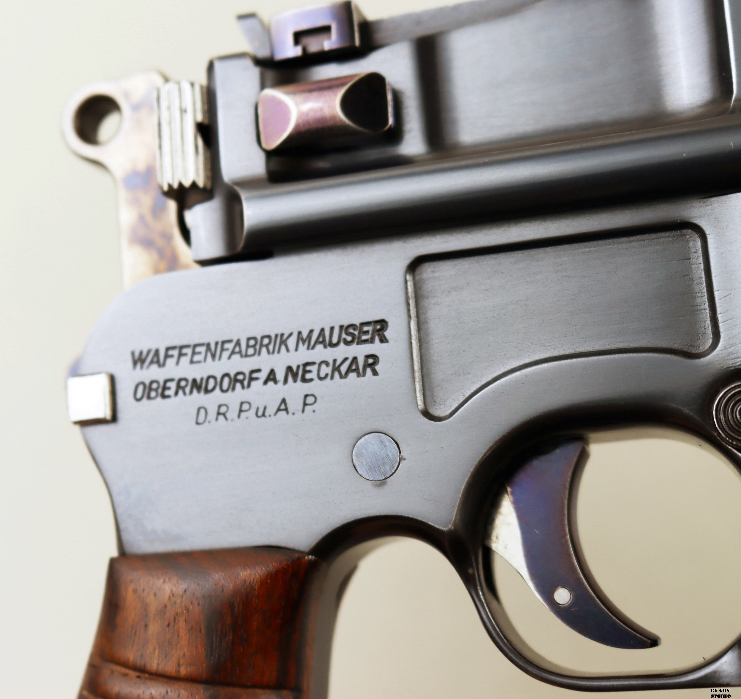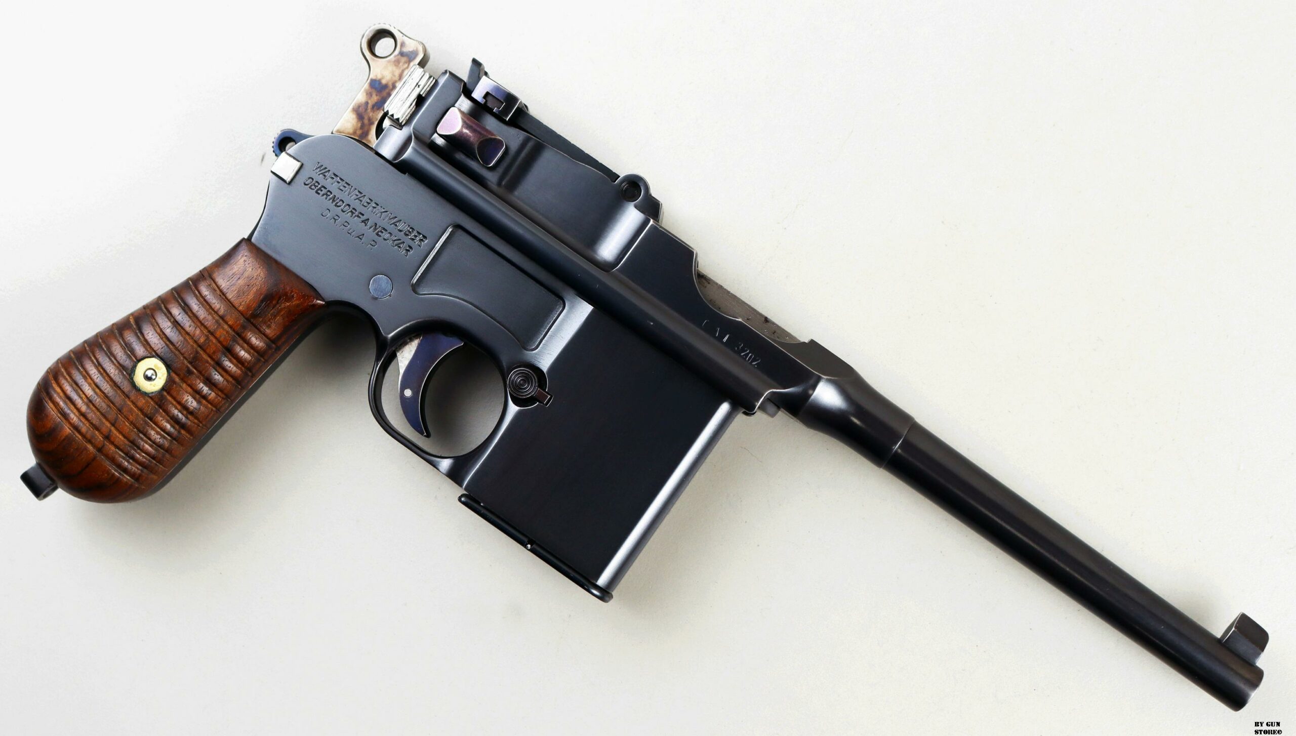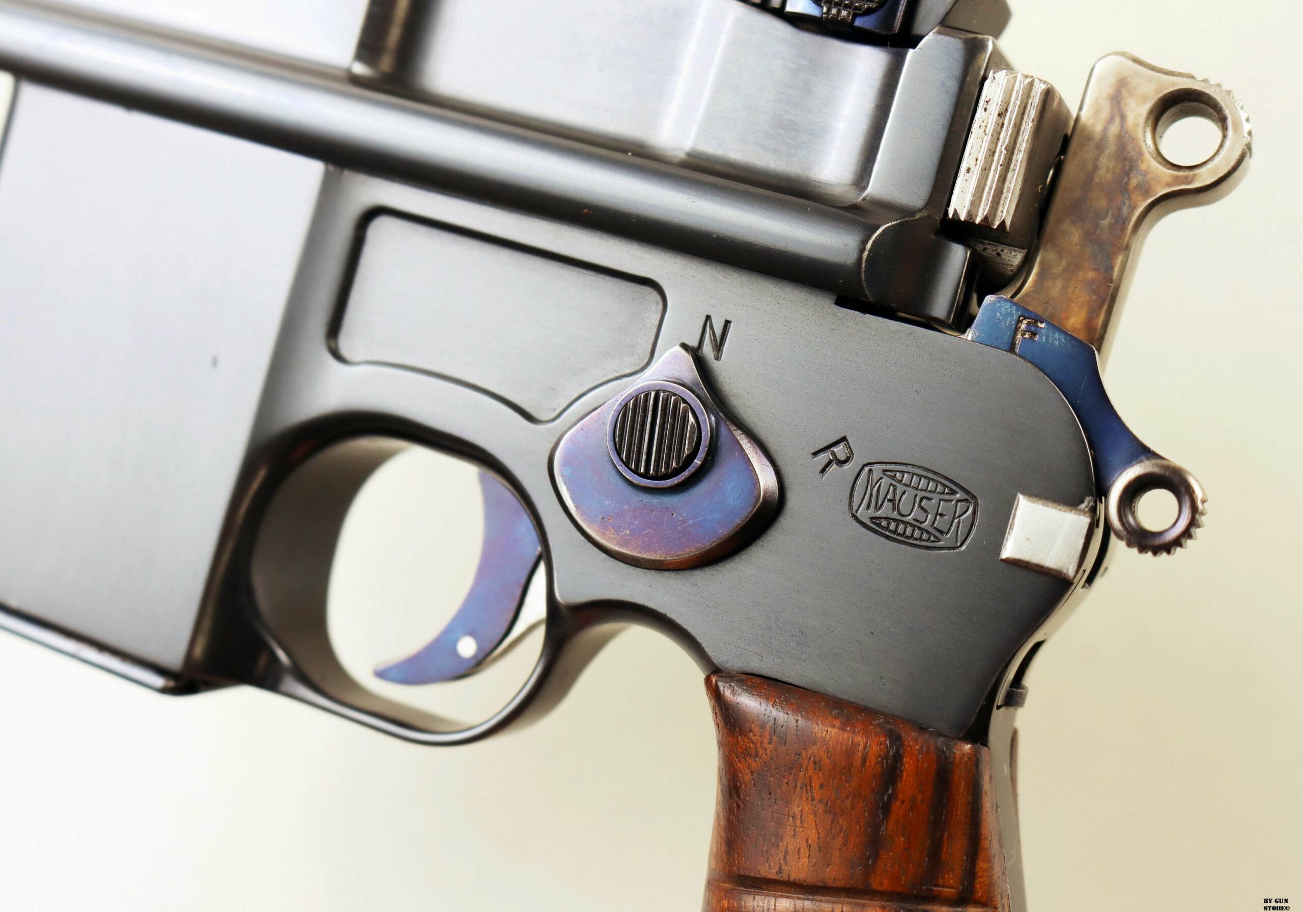 Le aziende spagnole Beistegui Hermanos e Astra iniziarono a produrre versioni della C96 alimentate da caricatore amovibile e a fuoco selettivo rispettivamente nel 1927 e nel 1928, destinate all’esportazione in Estremo Oriente. La Mauser per non perdere quote di mercato iniziò la produzione dello Schnellfeuer (fuoco rapido), la loro versione a fuoco selettivo e caricatore staccabile dell’M30 progettata dall’ingegnere Karl Westinger. La produzione iniziò nel 1932 e terminò nel 1938. Un progetto di grande successo, con circa 98.000 pezzi prodotti con una propria serie di range matricolare. Gran parte della produzione fu destinata all’esportazione in Sud America, Cina e per la guerra civile spagnola. Dal 1932 al 1935, l’esercito jugoslavo testò lotti di Schnellfeuer sia in 7,63 mm sia in 9×19. Anche il governo brasiliano acquistò cinquecento pistole mitragliatrici Schnellfeuer per la Policia Militar do Distrito Federal. Nel 1939, le forze armate tedesche iniziarono ad acquisire la Schnellfeuer con la denominazione militare “Reihenfeuer (“Serie di fuoco”) Pistole Modell 712″. Queste furono distribuite alle unità di polizia militare della Wehrmacht, delle Waffen-SS, alla Kriegsmarine per l’uso della fanteria di marina e alla Luftwaffe per portaordini motociclisti e reparti dell’antiaerea. Si tratta di 7.800 pezzi compresi nel range matricolare da 83.000 e 93.000 (questa è la numero 86599). L’arma ha una canna da 5,5 pollici, un gruppo di mira posteriore graduato da 50 a 1.000 metri e l’attacco per un un calciolo/fondina in legno (presente). Si differenzia dalla C96 standard per il caricatore amovibile e un selettore di fuoco sul lato sinistro del telaio con marcature “N” per “Normalfeuer” (fuoco a colpo singolo) e Reihenfeuer (“fuoco in serie”). Di fianco è presente il MAUSER banner. In modalità completamente automatica, la pistola produce una cadenza ciclica di circa 900 colpi al minuto, il che la rende quasi incontrollabile se non si monta il calciolo. Questa si presenta in ottime condizioni generali con canna, meccanica e azione ottime. Ha una bellissima brunitura a tampone e ai sali (grilletto, estrattore, cursore dell’alzo, selettore) che sono successive alla produzione. Comuque un ottimo pezzo con classificazione ad uso sportivo 24_00010ds1