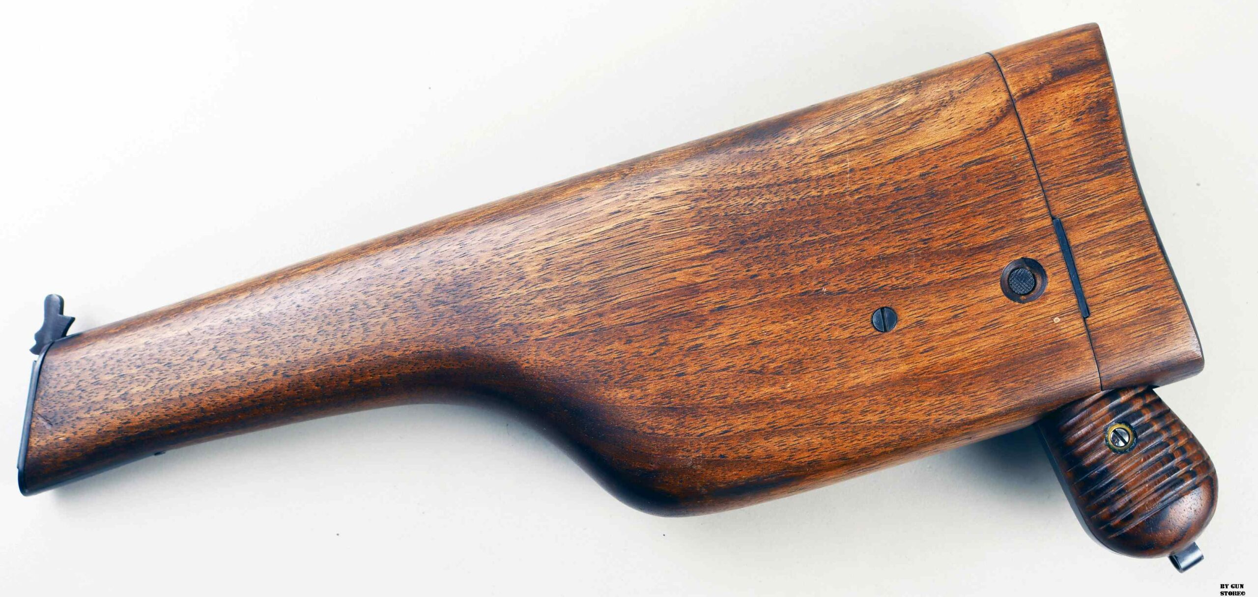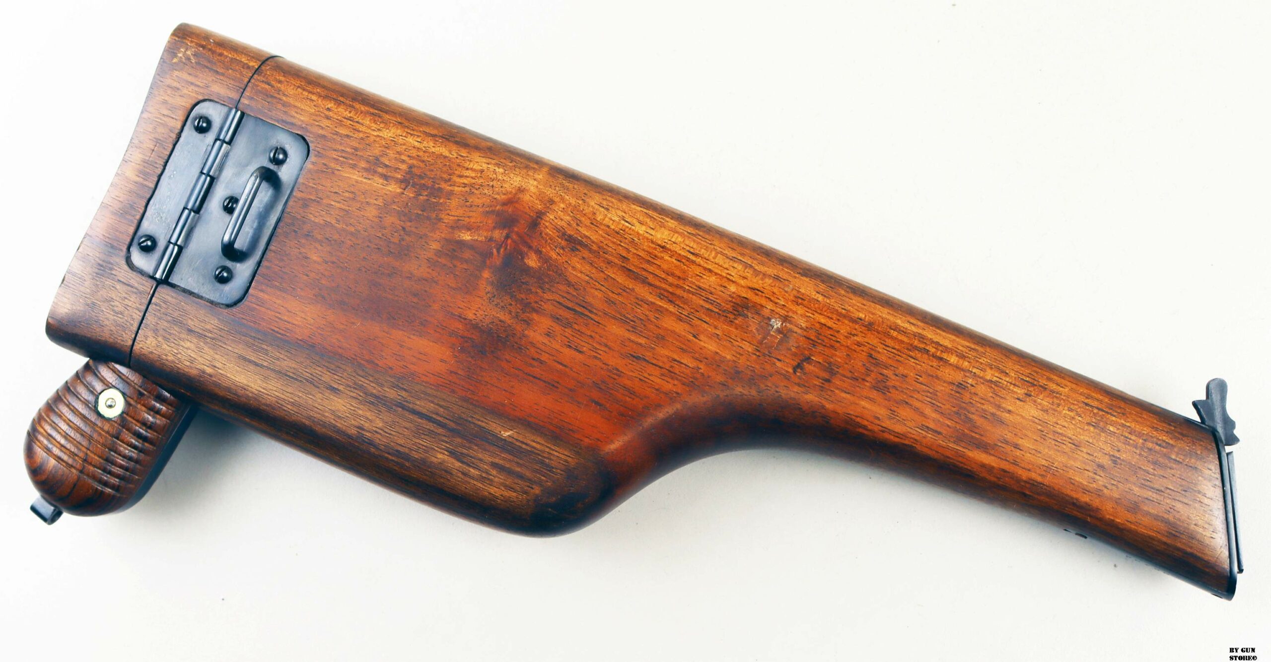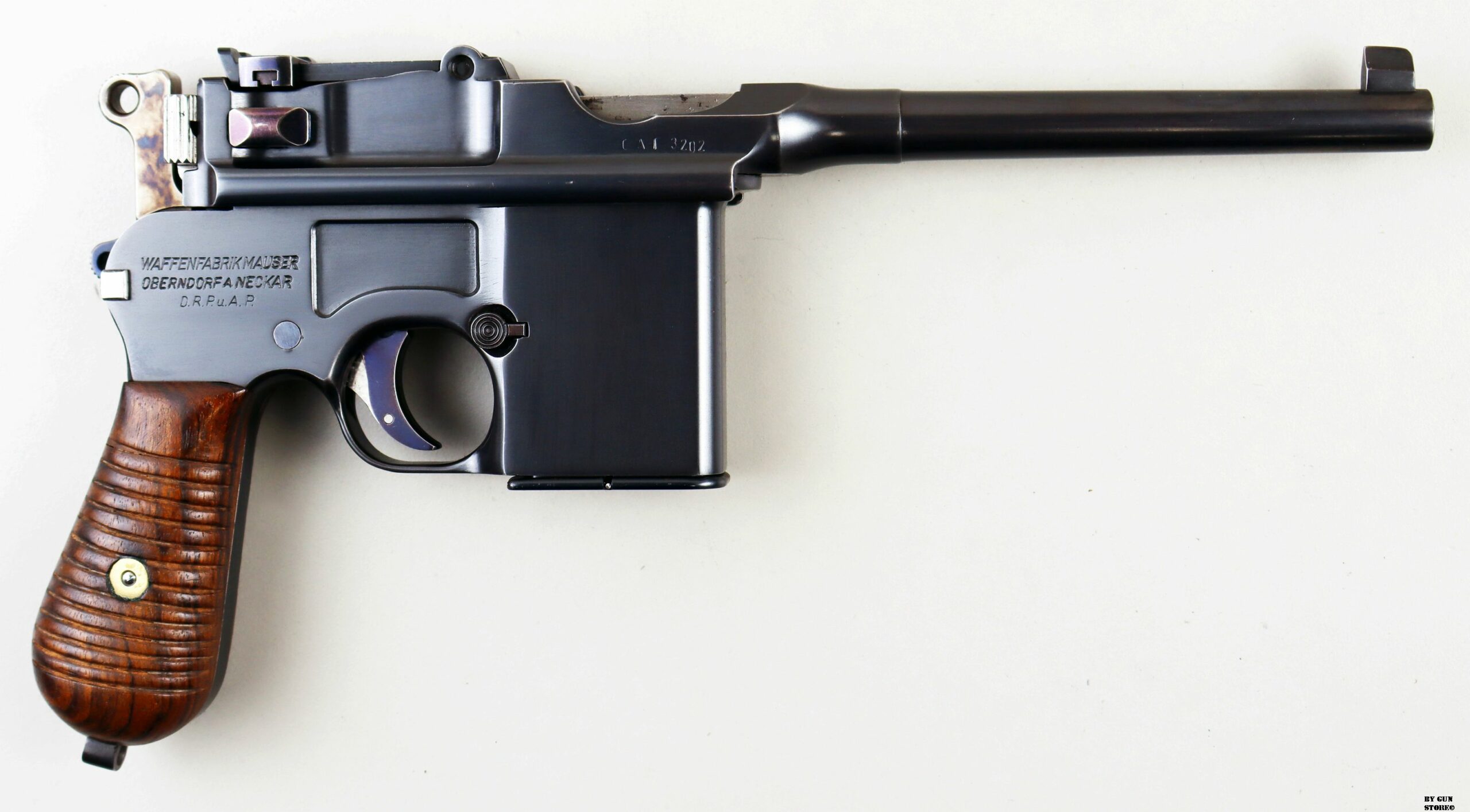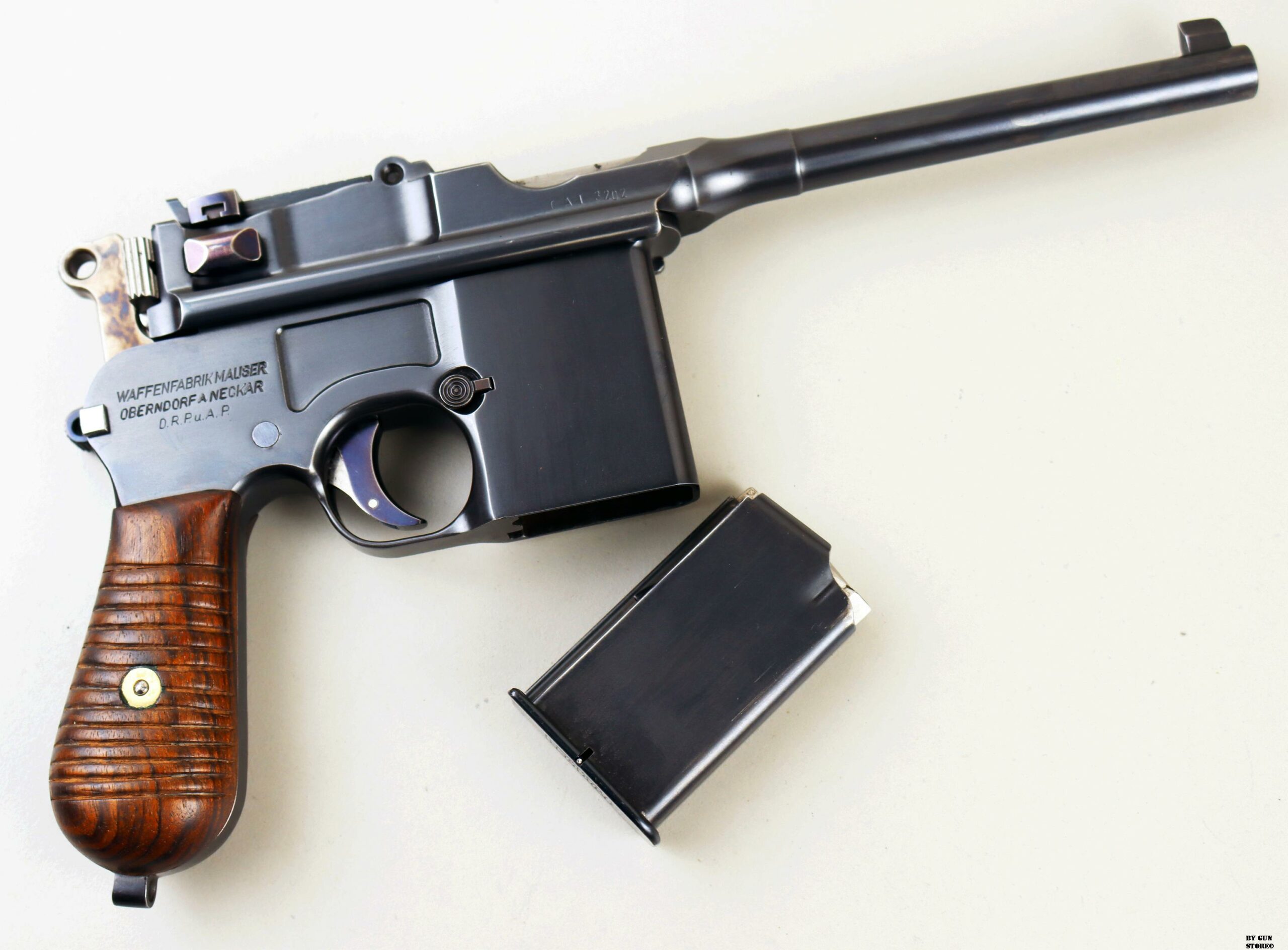 Le aziende spagnole Beistegui Hermanos e Astra iniziarono a produrre versioni della C96 alimentate da caricatore amovibile e a fuoco selettivo rispettivamente nel 1927 e nel 1928, destinate all’esportazione in Estremo Oriente. La Mauser per non perdere quote di mercato iniziò la produzione dello Schnellfeuer (fuoco rapido), la loro versione a fuoco selettivo e caricatore staccabile dell’M30 progettata dall’ingegnere Karl Westinger. La produzione iniziò nel 1932 e terminò nel 1938. Un progetto di grande successo, con circa 98.000 pezzi prodotti con una propria serie di range matricolare. Gran parte della produzione fu destinata all’esportazione in Sud America, Cina e per la guerra civile spagnola. Dal 1932 al 1935, l’esercito jugoslavo testò lotti di Schnellfeuer sia in 7,63 mm sia in 9×19. Anche il governo brasiliano acquistò cinquecento pistole mitragliatrici Schnellfeuer per la Policia Militar do Distrito Federal. Nel 1939, le forze armate tedesche iniziarono ad acquisire la Schnellfeuer con la denominazione militare “Reihenfeuer (“Serie di fuoco”) Pistole Modell 712″. Queste furono distribuite alle unità di polizia militare della Wehrmacht, delle Waffen-SS, alla Kriegsmarine per l’uso della fanteria di marina e alla Luftwaffe per portaordini motociclisti e reparti dell’antiaerea. Si tratta di 7.800 pezzi compresi nel range matricolare da 83.000 e 93.000 (questa è la numero 86599). L’arma ha una canna da 5,5 pollici, un gruppo di mira posteriore graduato da 50 a 1.000 metri e l’attacco per un un calciolo/fondina in legno (presente). Si differenzia dalla C96 standard per il caricatore amovibile e un selettore di fuoco sul lato sinistro del telaio con marcature “N” per “Normalfeuer” (fuoco a colpo singolo) e Reihenfeuer (“fuoco in serie”). Di fianco è presente il MAUSER banner. In modalità completamente automatica, la pistola produce una cadenza ciclica di circa 900 colpi al minuto, il che la rende quasi incontrollabile se non si monta il calciolo. Questa si presenta in ottime condizioni generali con canna, meccanica e azione ottime. Ha una bellissima brunitura a tampone e ai sali (grilletto, estrattore, cursore dell’alzo, selettore) che sono successive alla produzione. Comuque un ottimo pezzo con classificazione ad uso sportivo 24_00010ds1