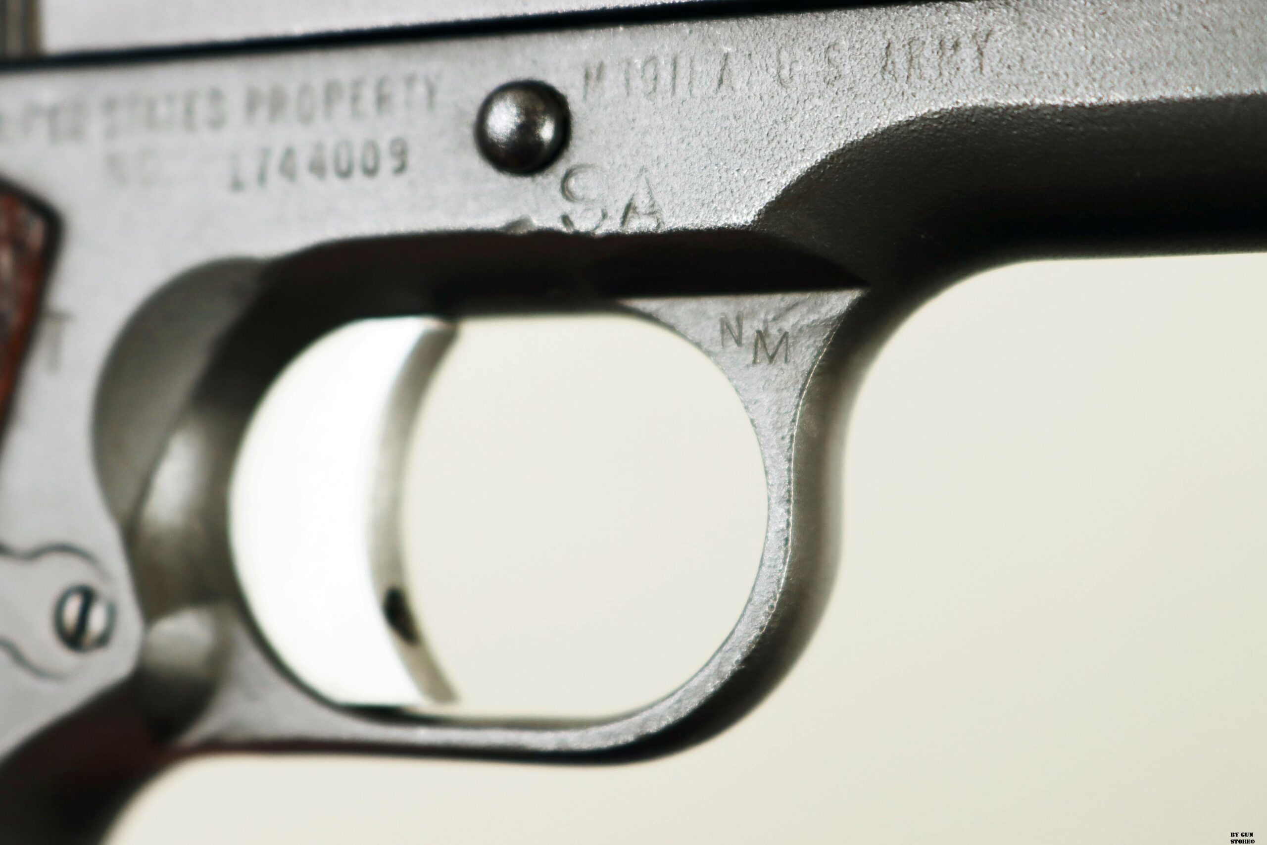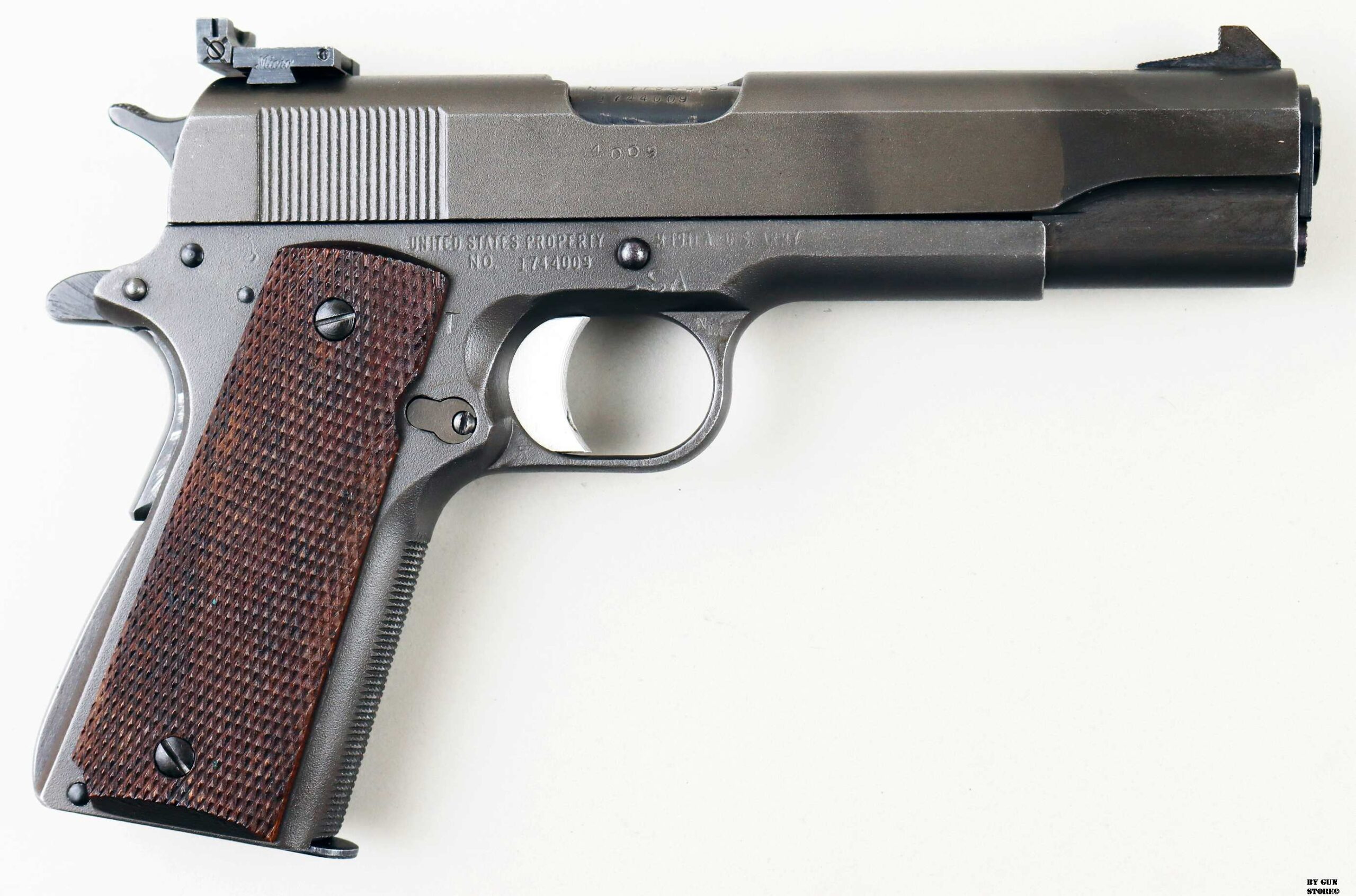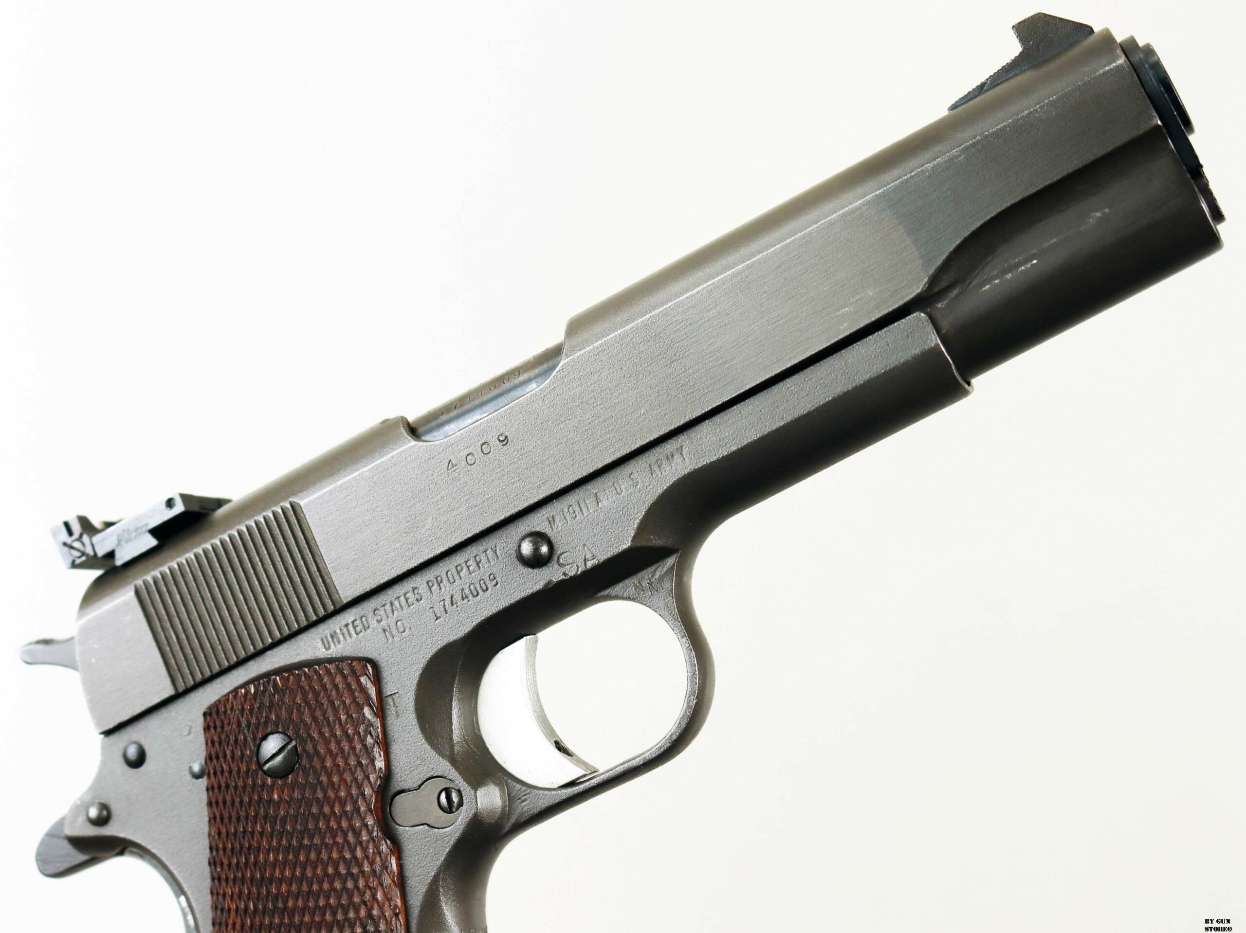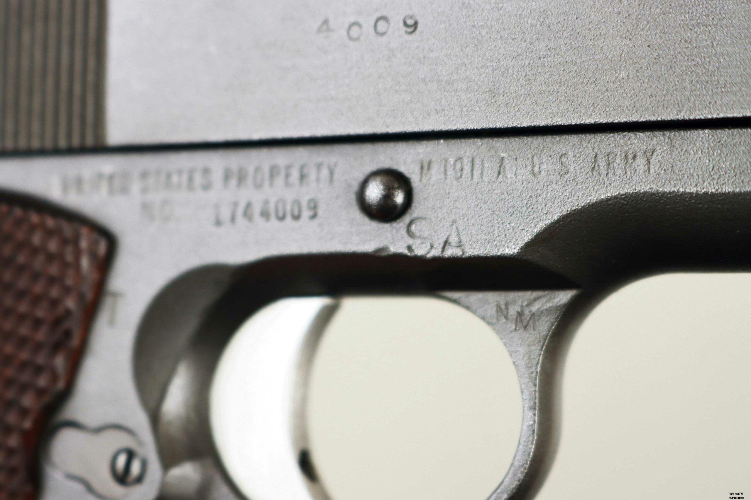 Le prime pistole di servizio da competizione, prodotte dall’Army Ordnance Corps per l’uso nelle National Matches, furono distribuite in occasione delle National Matches del 1955 ai concorrenti e nella Scuola di Tiro con Armi Leggere. Quella prima pistola da competizione National era identica nell’aspetto a una normale pistola di servizio 1911A1, fatta eccezione per la sostituzione delle guancette in plastica standard con quelle in noce zigrinato. Internamente, la precisione della pistola National Match del 1955, fu migliorata grazie alla sostituzione della canna di servizio con una canna National Match, della boccola della canna d’Ordinanza con una boccola National Match e del collegamento della canna con un collegamento speciale. La boccola e il collegamento di ricambio servivano a riportare la canna, dopo il rinculo, in una posizione più precisa rispetto al carrello e alle mire per ogni colpo. Ogni anno successivo, la pistola National Match ha subito ulteriori miglioramenti e modifiche. Nel 1956, ad esempio, il mirino di servizio fu sostituito con uno largo 1/8″ e la tacca di mira posteriore fu ridotta a 1/8″. Le mire del 1957 erano più alte (0,395 per la tacca posteriore e 0,295 per il mirino anteriore) e quelle del 1958, a 0,458 e 0,358, erano ancora più alte. Nel 1961 fu introdotto il mirino posteriore regolabile di tipo commerciale, il Micro Sight, che venne poi sostituito nel 1963 dal mirino posteriore di tipo Elliason. Mentre alcune pistole National Match venivano vendute ogni anno ai partecipanti al National Match e ad altri acquirenti autorizzati dal Direttore del Tiro Civile, quelle che rimanevano sotto il controllo governativo venivano generalmente restituite ogni anno alla Springfield Armory per essere ricostruite secondo le nuove specifiche. I tiratori che acquistavano queste pistole, in molti casi, le facevano modificare per incorporare i miglioramenti più recenti. Pertanto, le prime pistole National Match nella loro configurazione originale sono relativamente rare. La pistola National Match qui esposta presenta la zigrinatura a croce fresata sulla parte anteriore dell’impugnatura, introdotta nel 1959, il grilletto in alluminio risalente al 1961, la canna è marcata NM 7790313, il mirino posteriore è ancora del tipo Micro Sight punzonato con i cannoni incrociati dell’Ordnance Department. Il bushing anch’esso originale è marcato NM 7267718 (tutti i modelli NM utilizzavano la stessa boccola della canna con questa matricolazione). Le caratteristiche di quest’arma la riporta come produzione del 1961 (972 pezzi prodotti di cui 137 rivenduti su autorizzazione del Direttore del Tiro Civile), anche perchè, nel 1962, la SA smise di stampare le ultime 4 cifre del numero di serie sul lato destro del carrello (su questa è presente il numero 4009 – a partire dal 1963 o 1964, iniziò a stampare le ultime 4 cifre del numero di serie del fusto sul carrello, sotto il fermo del percussore). Tutti i modelli National Match utilizzavano la stessa boccola della canna rullati NM7267718. L’arma di partenza è una Remington Rand prodotta tra il 1944 e 1945 (lotti da 1.610,000 a 1.655,000 & da 1.750,000 a 1.790,000 & 1.816,691 a 1.869,313), con la fosfatazione corretta. Il fusto indica che l’arma è stata ispezionata e accettata sotto la supervisione del Colonnello Frank J. Atwood (FJA – ufficiale dell’Ordnance Department dell’Esercito statunitense, responsabile del distretto di Rochester – New York – tra il 1942 e il 1946, che controllava la produzione bellica). Da notare anche il punzone SA sempre sul fusto che indica il passaggio all’Arsenale di Springfield e che fusto, canna e carrello presentano tutti la stessa matricola. Canna (originariamente Colt militare), meccanica e azione sono ottime. Vero e raro pezzo, in calibro .45 Acp, da VERA collezione vista la rarità, che gode di classificazione ad uso sportivo 18_00275cs1.