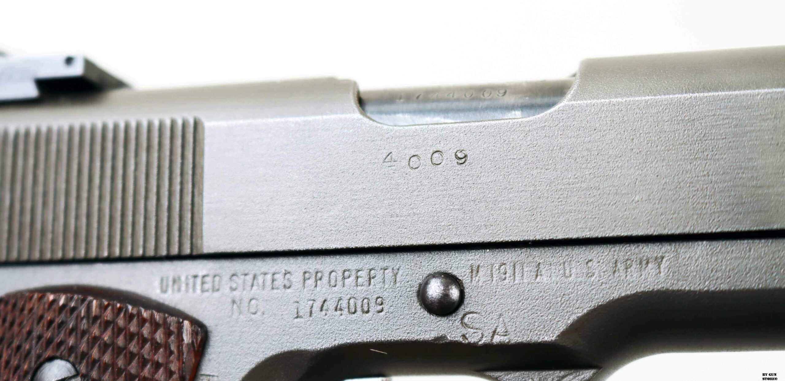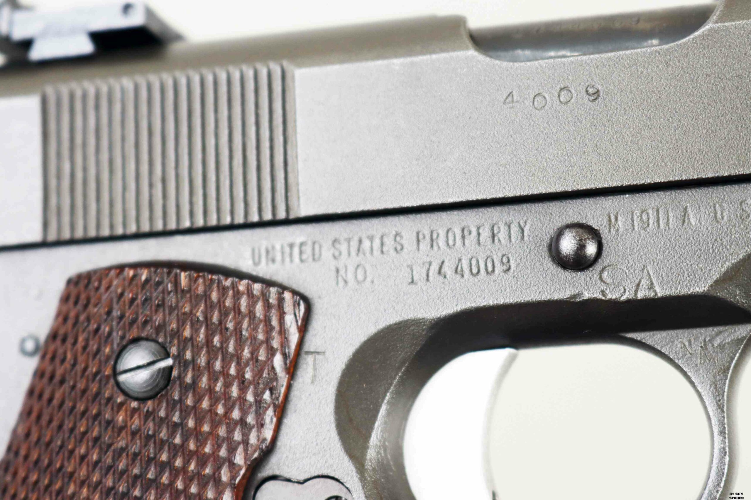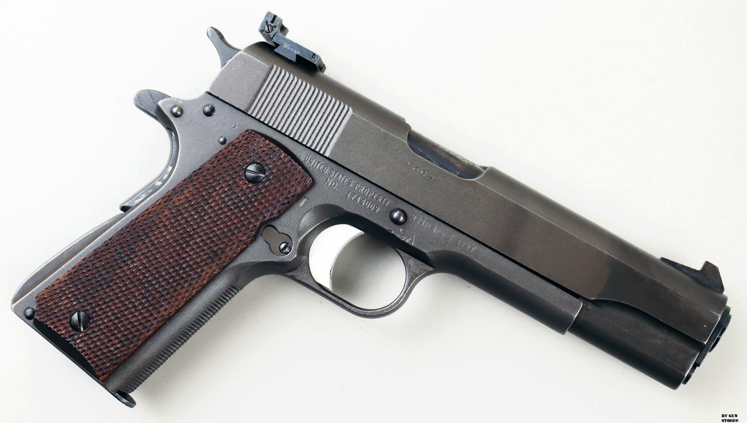 Le prime pistole di servizio da competizione, prodotte dall’Army Ordnance Corps per l’uso nelle National Matches, furono distribuite in occasione delle National Matches del 1955 ai concorrenti e nella Scuola di Tiro con Armi Leggere. Quella prima pistola da competizione National era identica nell’aspetto a una normale pistola di servizio 1911A1, fatta eccezione per la sostituzione delle guancette in plastica standard con quelle in noce zigrinato. Internamente, la precisione della pistola National Match del 1955, fu migliorata grazie alla sostituzione della canna di servizio con una canna National Match, della boccola della canna d’Ordinanza con una boccola National Match e del collegamento della canna con un collegamento speciale. La boccola e il collegamento di ricambio servivano a riportare la canna, dopo il rinculo, in una posizione più precisa rispetto al carrello e alle mire per ogni colpo. Ogni anno successivo, la pistola National Match ha subito ulteriori miglioramenti e modifiche. Nel 1956, ad esempio, il mirino di servizio fu sostituito con uno largo 1/8″ e la tacca di mira posteriore fu ridotta a 1/8″. Le mire del 1957 erano più alte (0,395 per la tacca posteriore e 0,295 per il mirino anteriore) e quelle del 1958, a 0,458 e 0,358, erano ancora più alte. Nel 1961 fu introdotto il mirino posteriore regolabile di tipo commerciale, il Micro Sight, che venne poi sostituito nel 1963 dal mirino posteriore di tipo Elliason. Mentre alcune pistole National Match venivano vendute ogni anno ai partecipanti al National Match e ad altri acquirenti autorizzati dal Direttore del Tiro Civile, quelle che rimanevano sotto il controllo governativo venivano generalmente restituite ogni anno alla Springfield Armory per essere ricostruite secondo le nuove specifiche. I tiratori che acquistavano queste pistole, in molti casi, le facevano modificare per incorporare i miglioramenti più recenti. Pertanto, le prime pistole National Match nella loro configurazione originale sono relativamente rare. La pistola National Match qui esposta presenta la zigrinatura a croce fresata sulla parte anteriore dell’impugnatura, introdotta nel 1959, il grilletto in alluminio risalente al 1961, la canna è marcata NM 7790313, il mirino posteriore è ancora del tipo Micro Sight punzonato con i cannoni incrociati dell’Ordnance Department. Il bushing anch’esso originale è marcato NM 7267718 (tutti i modelli NM utilizzavano la stessa boccola della canna con questa matricolazione). Le caratteristiche di quest’arma la riporta come produzione del 1961 (972 pezzi prodotti di cui 137 rivenduti su autorizzazione del Direttore del Tiro Civile), anche perchè, nel 1962, la SA smise di stampare le ultime 4 cifre del numero di serie sul lato destro del carrello (su questa è presente il numero 4009 – a partire dal 1963 o 1964, iniziò a stampare le ultime 4 cifre del numero di serie del fusto sul carrello, sotto il fermo del percussore). Tutti i modelli National Match utilizzavano la stessa boccola della canna rullati NM7267718. L’arma di partenza è una Remington Rand prodotta tra il 1944 e 1945 (lotti da 1.610,000 a 1.655,000 & da 1.750,000 a 1.790,000 & 1.816,691 a 1.869,313), con la fosfatazione corretta. Il fusto indica che l’arma è stata ispezionata e accettata sotto la supervisione del Colonnello Frank J. Atwood (FJA – ufficiale dell’Ordnance Department dell’Esercito statunitense, responsabile del distretto di Rochester – New York – tra il 1942 e il 1946, che controllava la produzione bellica). Da notare anche il punzone SA sempre sul fusto che indica il passaggio all’Arsenale di Springfield e che fusto, canna e carrello presentano tutti la stessa matricola. Canna (originariamente Colt militare), meccanica e azione sono ottime. Vero e raro pezzo, in calibro .45 Acp, da VERA collezione vista la rarità, che gode di classificazione ad uso sportivo 18_00275cs1.