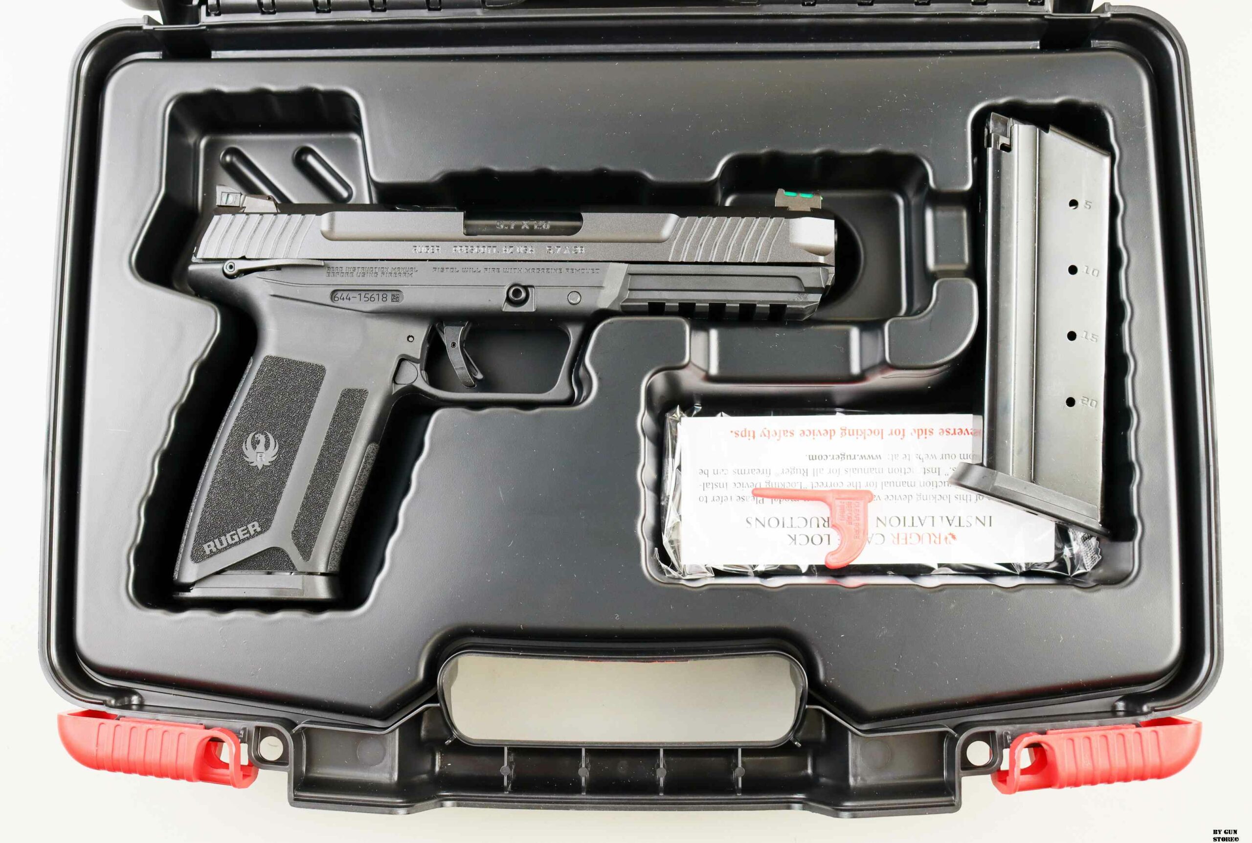 Estremamente ergonomica data dalla posizione del grilletto, dalla sicura manuale ambidestra in stile 1911, dalla robusta leva di chiusura del carrello e dallo sgancio del caricatore reversibile. Carrello in acciaio temprato con intagli laterali per una presa più salda e alleggerimento nella parte superiore. Tacca di mira regolabile e mirino con fibra ottica. La canna in acciaio presenta un trattamento al nitruro nero per una migliore resistenza all’usura. I caricatori in acciaio sono bifilari. Lo scatto Secure Action ™ combina il cane interno affidabile e collaudato di Ruger con un grilletto corto e preciso. Smontaggio facile e sicuro senza attrezzi. Sul fusto c’è una guida Picatinny per montare accessori.