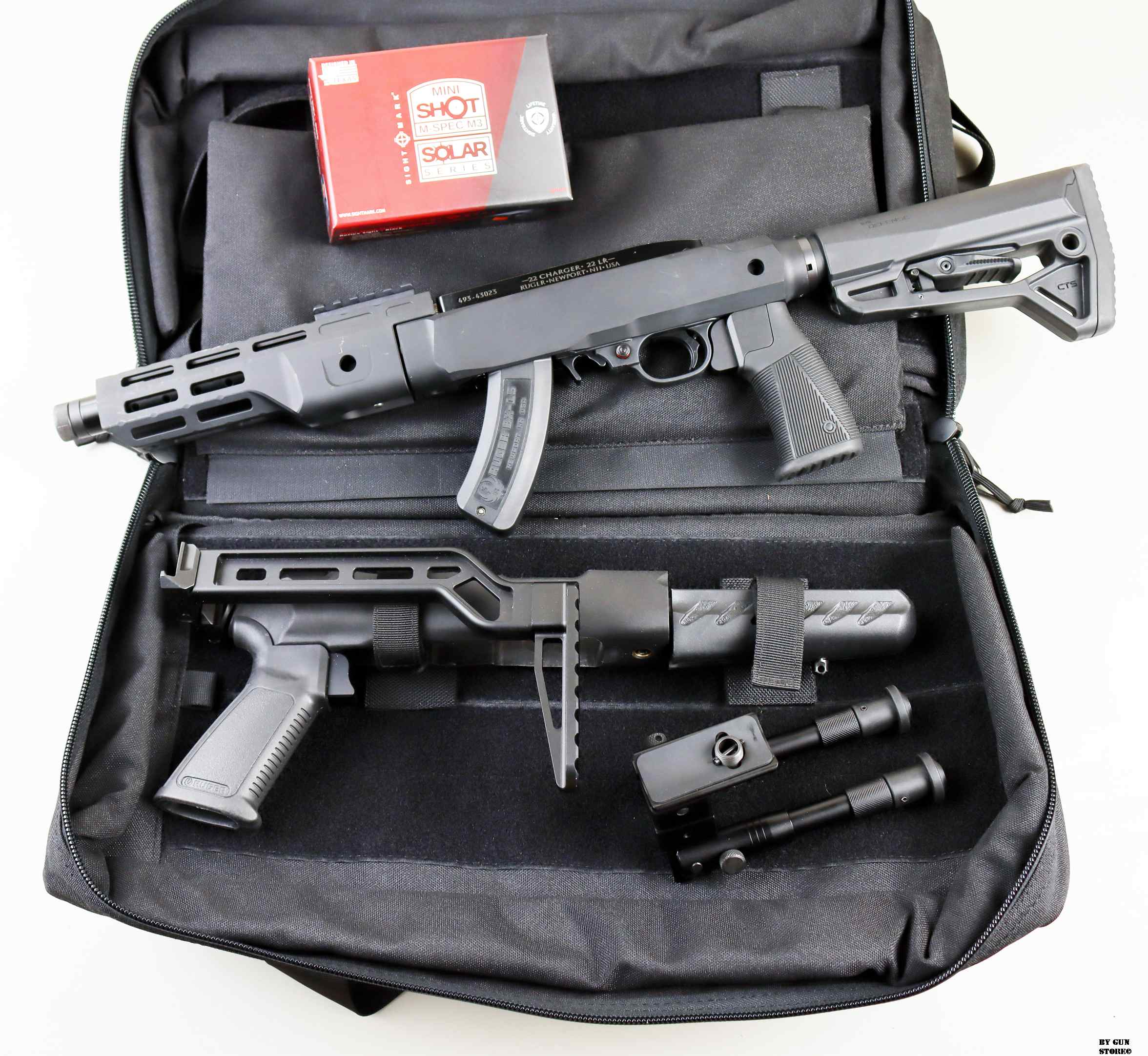 Una pistola Ruger modello Charger Takedown in condizioni ottime. Un set interessante. Alla versione base prodotta da Ruger è stato applicato un bipiede all’astina anteriore, mentre allo “chassis” un calciolo after market, con chiusura a stampella, in alluminio. L’upgrade vero e proprio che rende ancor più accattivante quest’arme è un set made in USA della Midwest Industries composto da un M-Lock Nero da 8″ e un Chassis in alluminio fresato dal pieno. In ultimo il tubo in alluminio con calciolo della IMI Defense. E’ presente anche un punto rosso Sightmark Mini Shot M-SPEC M3 Solar Series e la borsa originale Ruger. Tutti questi pezzi hanno un costo importante data la qualità. Canna, meccanica e azione sono ottime. L’arma è divertentissima e pronta per un nuovo ciclo di divertimento, ovviamente gode di classificazione ad uso sportivo.