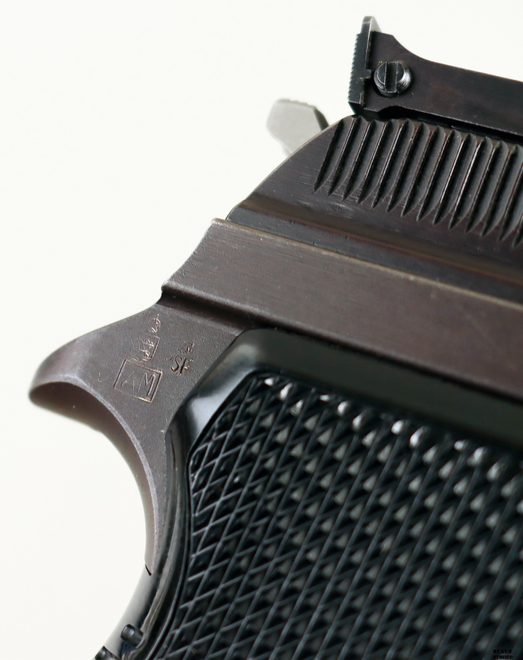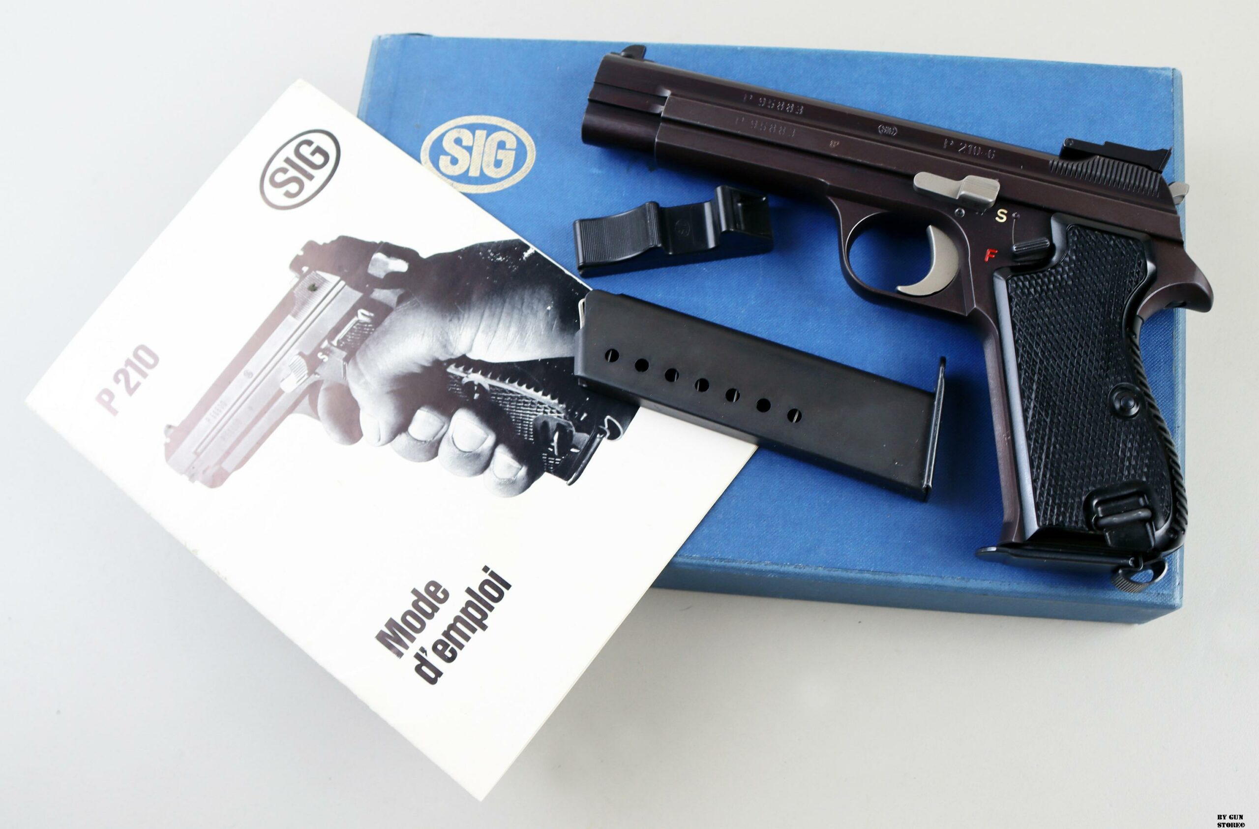 Anno 1984 di bancatura presso il BNP di Gardone Valtrompia (AM). Una non comune pistola Sig modello P210-6 in calibro 7,65 parabellum. La penultrima variante tra le P210, identica al primo modello ma dotata di una differente tacca di mira fissa e del grilletto “target” della 210-5 (cinquanta esemplari furono realizzati con fusto appesantito, metà calibro 9 e metà calibro 7,65, su richiesta dell’armeria Hofman und Reinhart di Zurigo. Sono numerate da 79.101 a 79.150). Questa ancora con matricola a 5 numeri è completa di scatola matricolata, libretto, secondo caricatore e carichino. Canna, meccanica e azione sono perfette. Arma proveniente da collezione. Guancette in plastica nera, mira regolabile micrometricamente e brunitura originale. Arma sportiva alla classificazione 19_00281s1