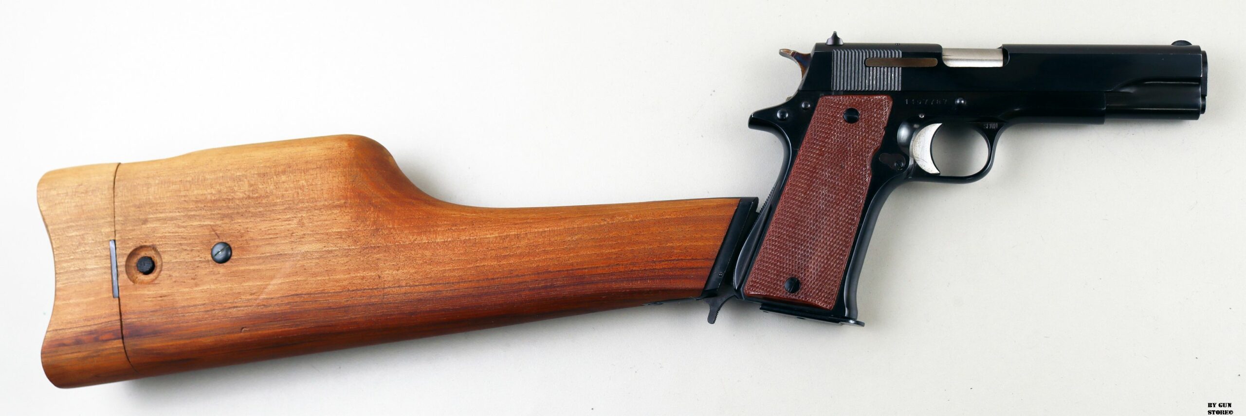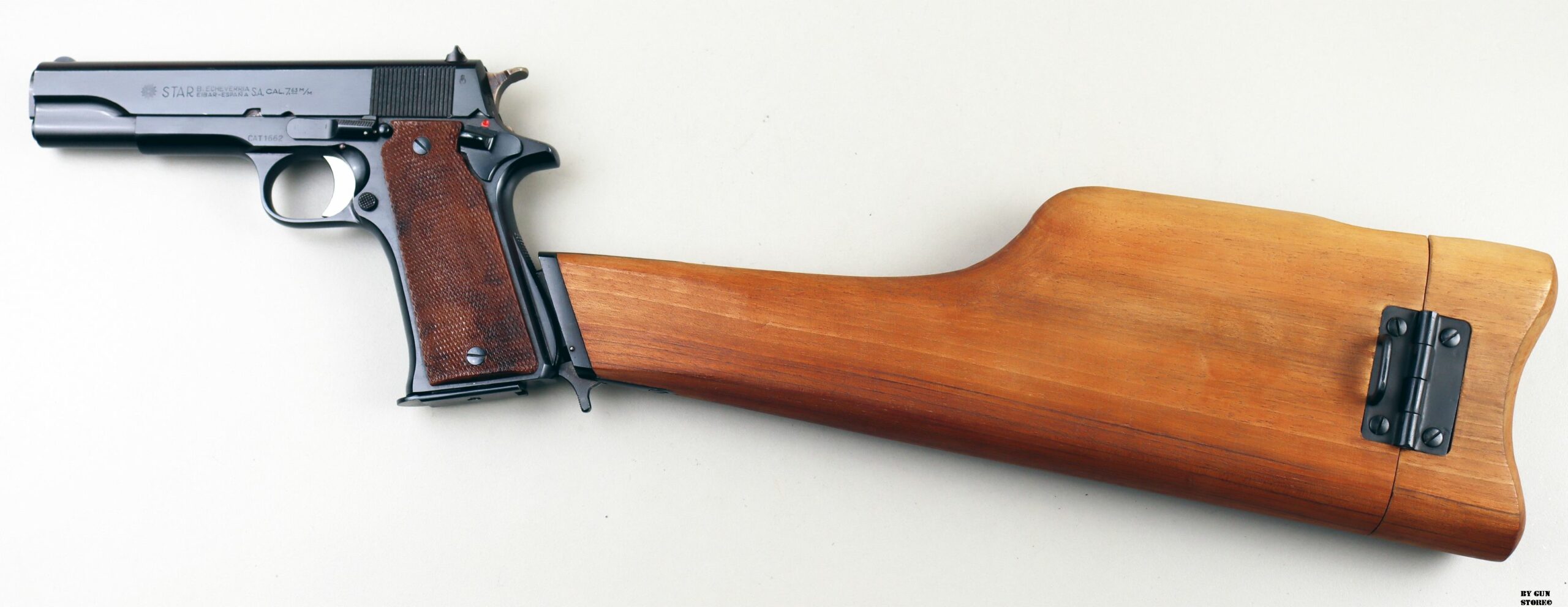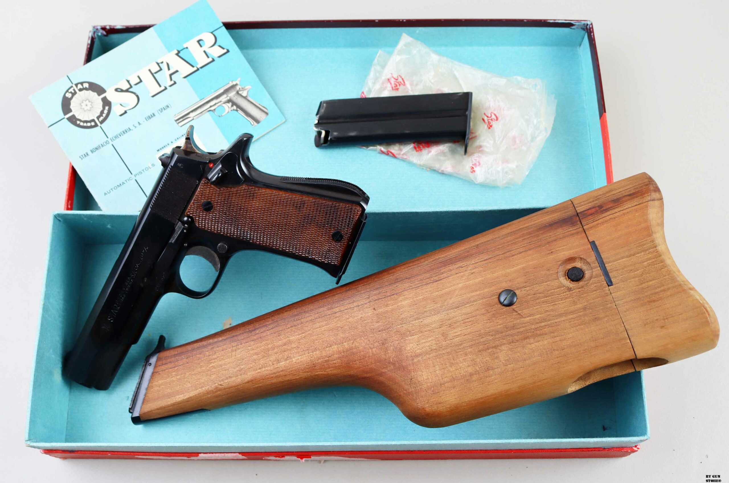 Splendida pistola Star B. Echeverria di Eibar in Spagna nel modello MMS in calibro 7,63 Mauser. Proveniente da collezione ha la brunitura originale ed è completa del calciolo fondina in legno. Un set interessante, compensivo di scatola, doppio caricatore e libretto, pronto per inserirlo nella prossima collezione o per divertimento al poligono. Canna, meccanica e azione sono ottime. Arma comune.