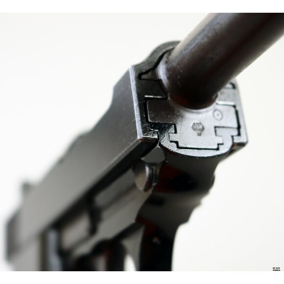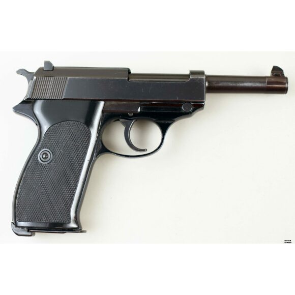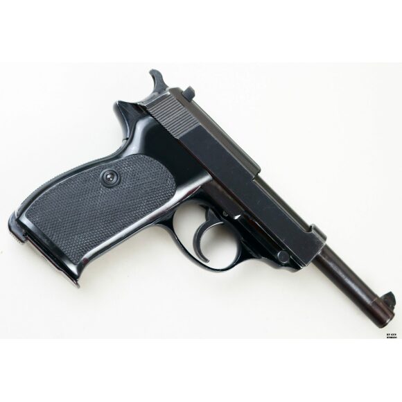 Condizioni ottime per questa pistola Walther modello P38 prodotta e bancata a Ulm. Nel maggio 1957 nel nuovo stabilimento Walther a Ulm fu ripresa la produzione della P38 con alcune modifiche. Il fusto della pistola era ora in alluminio. La sua superficie era anodizzata nera, con una finitura semi-opaca. Le guancette erano ora in plastica nera zigrinata. Il carrello e la canna erano fosfatati. Alla ripartenza della produzione la canna non era più costruita in un unico pezzo. Quella di nuova generazione consisteva di un tubo interno della canna che comprendeva la rigatura, e una guaina esterna sulla quale erano realizzati per fresatura sia l’alloggiamento per il blocco di chiusura sia il mirino. Condizioni ottime per canna, meccanica e azione. Calibro 9×19 mm. Classificazione Sportiva 22_00013s7