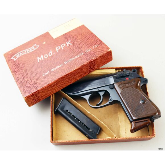 Anno 1967. Condizioni generali ottime per questa pistola Walther modello PPK ormai rara da trovare nel calibro .22 long rifle. Fusto in acciacio. Brunitura ottima e meccanica perfetta, canna a specchio con ottime rigature. Ottima per collezione o ideale per divertimento al poligono, presenta la scatola matricolata originale e il secondo caricatore. Arma Comune.