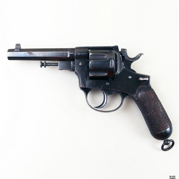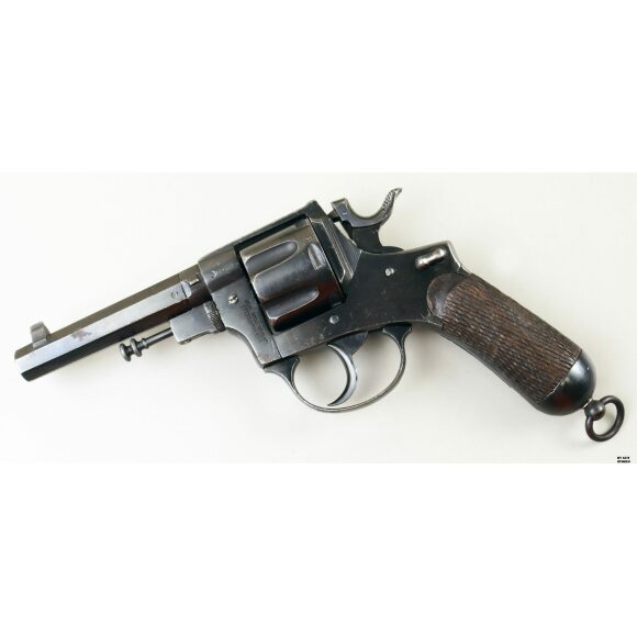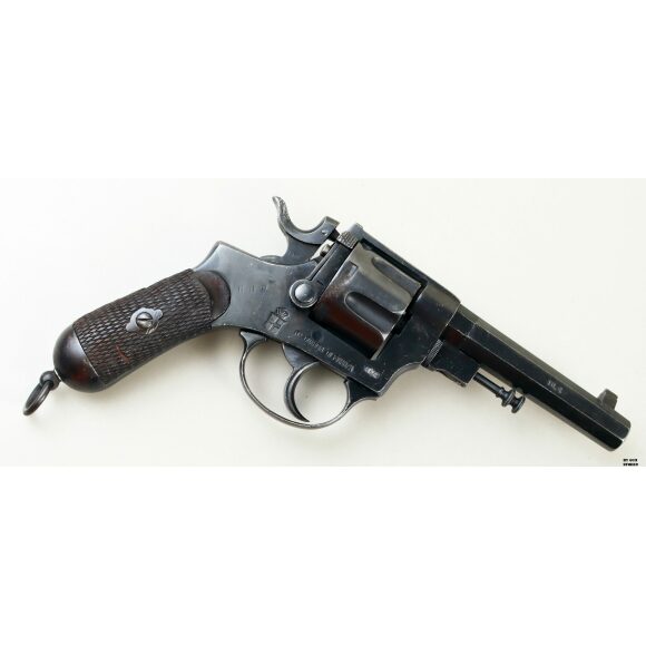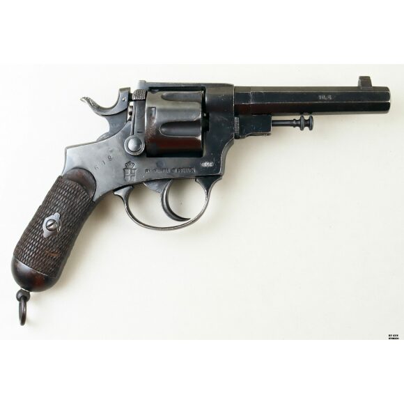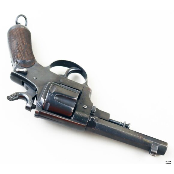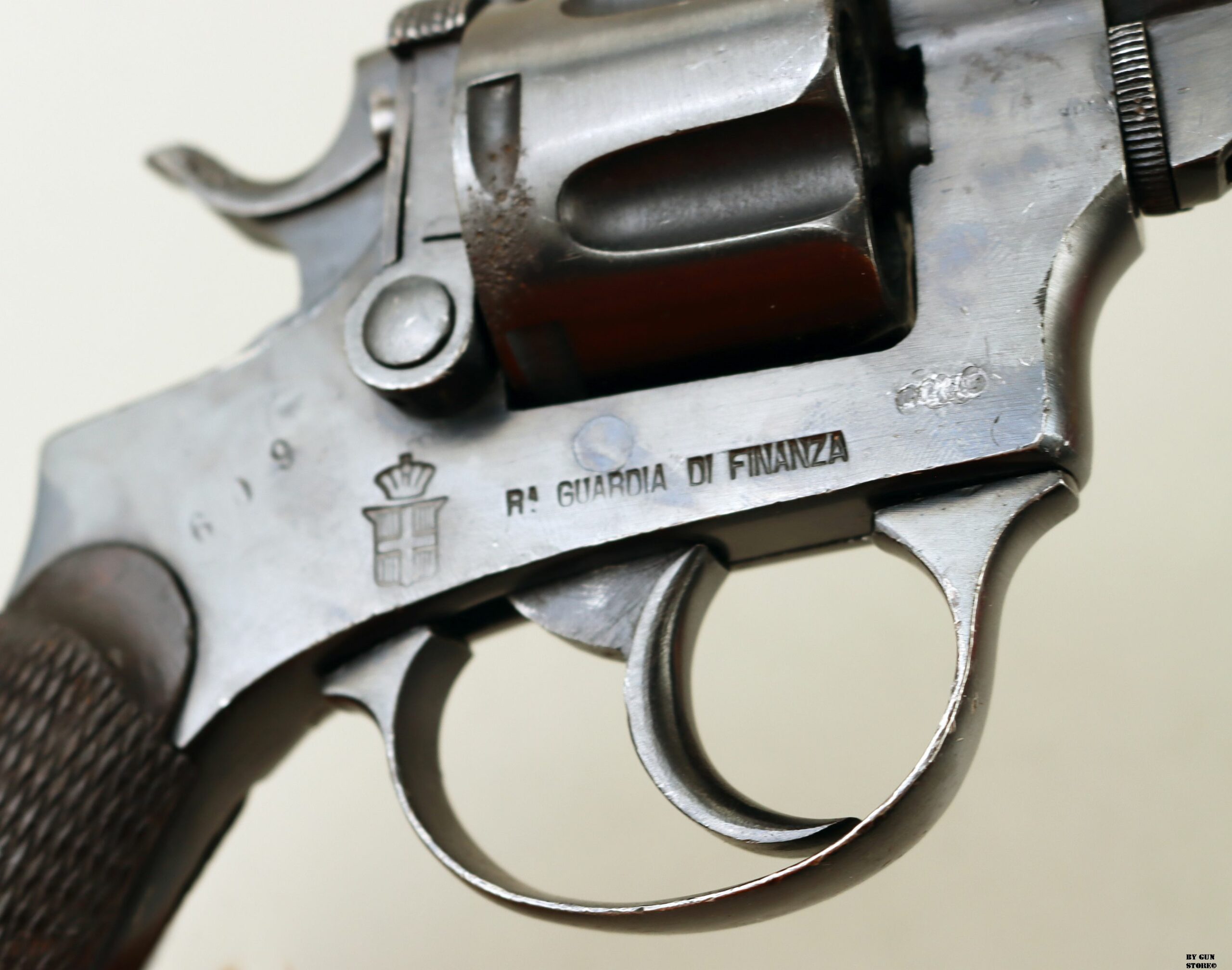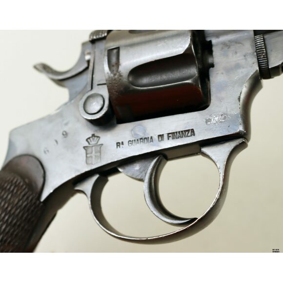 Un revolver Bodeo modello 1889 d’Ordinanza appartenuto alla Regia Guardia di Finanza. Originariamente la Guardia di finanza aveva in servizio un certo quantitativo di cosiddetti “pseudo Bodeo”, cioè revolver all’apparenza identici al Bodeo Tipo B, ma dotati di meccanica interna tipo Chamelot Delvigne. Si riconosceva per la cartella laterale a tre fori, per altrettanti perni e per la bacchetta di estrazione dei bossoli agganciata al telaio per mezzo di un braccetto sul lato destro. Nel 1932 la Vincenzo Bernardelli di Gardone Valtrompia li trasformò a tutti gli effetti in Bodeo tipo B. Anche su questo oltre la rullata con scritto “MODIF. 1932”, si osserva sul lato destro il punzone del produttore di origine Francesco Glisenti, obliterato. Canna e azione sono in ordine, la brunitura è originale e il “pezzo” raro per la sua Storia e per la certa assegnazione alla Regia Guardia di Finanza. Calibro 10,4, arma antica.