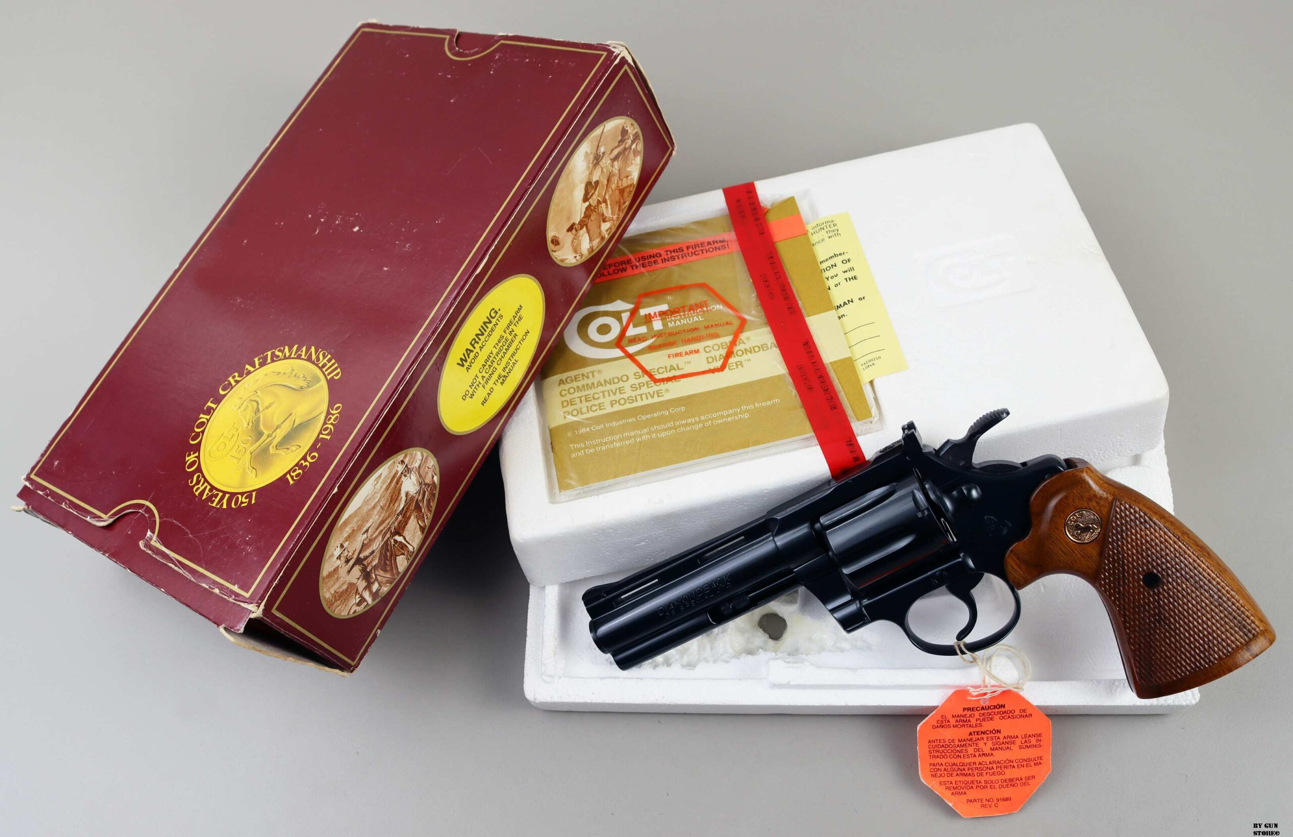 Anno 1986 di bancatura in Germania per questa veramente splendida Colt modello Diamondbach. Arma proveniente da collezione è in condizioni intonse, il tempo sembra veramente essersi fermato. Canna da 4″ perfetta, come la meccanica e timing. Guancette con zigrini ottimi. Completa il tutto la scatola matricolata e i documenti originali. Vero e ottimo pezzo da collezione, arma comune.
