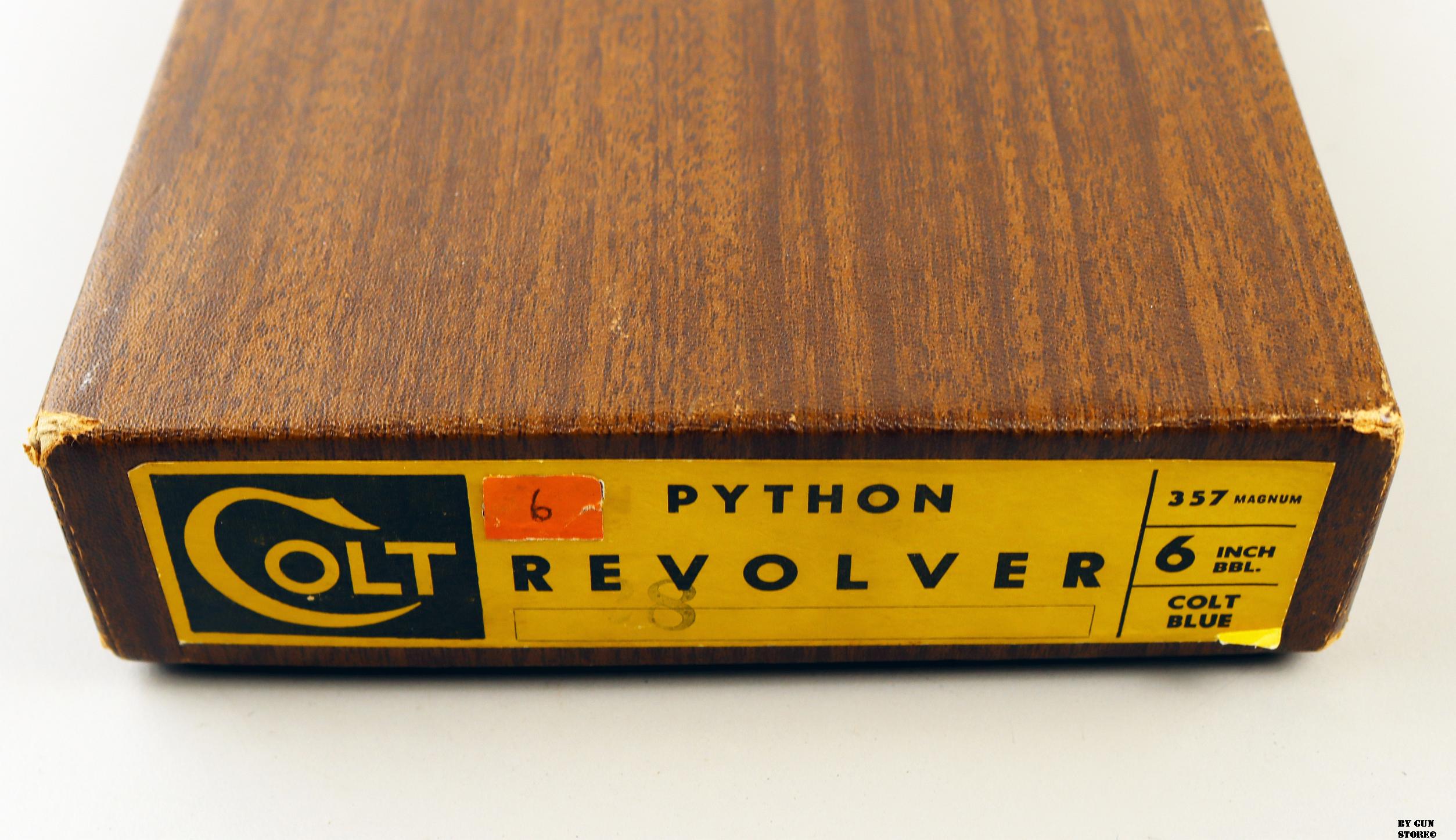 Il Colt Python è un revolver ad azione singola doppia, camerato per la cartuccia .357 Magnum, che fu introdotto per la prima volta nel 1955 dalla Colt’s Manufacturing Company. Sono costruiti sul grande telaio a I della Colt e sono simili per dimensioni e funzione ai modelli Trooper e Lawman. La Colt Python era ed è ancora destinata al segmento di mercato dei revolver di fascia alta, non ebbe un programma di sviluppo intensivo, nacque sostanzialmente da armaioli che in produzione crearono un revolver da competizione, partendo principalmente da pezzi e parti esistenti, arrivando a creare una delle “pistole più belle mai realizzate”. Al De John iniziò a lavorare come armaiolo Colt nel 1946, collaborò con il sovrintendente della fabbrica Al Gunther. De John iniziò a lavorare sul modello .38 Special Officer’s Match rinforzandone il tamburo, il telaio e la bindella superiore a causa di problemi dovuti all’eccessiva pressione del calibro .357 Magnum. si deve ad Al Gunther di suggerire l’iconica nervatura di ventilazione attraverso la canna. Colt mantenne la denominazone dei revolver con la serie dei rettili. Il primo fu il .38 Special “Cobra” nel 1950 cui seguì, appunto, quello del Python. Fu introdotto per la prima volta nel 1955 come modello di punta, originariamente destinato a essere un .38 Special con telaio grande. Altra caratteristica il tamburo che ruota in senso orario rispetto ai classici Smith & Wesson o Ruger. Il Python fu il primo modello in cui Colt usò la finitura Royal Blue, derivante da una lucidatura molto elevata sulla pistola e poi dalla brunitura. Inizialmente, solo gli armaioli Colt Al De John e Don Bedford furono autorizzati a lavorare sui Python. Questa lavorazione includeva un complesso montaggio e lucidatura a mano e ogni revolver avrebbe richiesto un po’ più di tempo; circa 20 minuti di lavoro, rispetto ai 15 minuti (4 pistole all’ora) di altri modelli. Il Python aveva inizialmente un prezzo di $ 125,00. Nel 1955 fu costruito un solo Python e poco più di 300 entro l’inizio del 1956. Questo che presentiamo è in condizioni semplicemente impeccabili e con canna da 6″. La matricola 81737 rientra tra quelle prodotte nel 1968 nello stabilimento di Hartford (da 73800 a 89999 per un totale di 15.200 pezzi). Fu importata in Italia nel 1968 dove fu bancato presso il BNP di Gardone Valtrompia (XXIV). Brunitura splendida completa e priva di effettivi segni di utilizzo. Canna, meccanica e azione sono perfette. Le guancette sono del secondo tipo e in uso dal 1961 al 1970 (si nota l’incavo “poggia-pollice” solo sul lato sinistro e il bordo zigrinato semicircolare sotto i medaglioni; alcuni le ritengono le impugnature Colt Target più belle). Una vera “chicca” per il collezionista e un Vero pezzo da collezione o un purosangue da uso al poligono. Completa il tutto la scatola coeva, in ottime condizioni, libretto e depliants. Calibro .357 Magnum e arma che gode di classificazione sportiva.