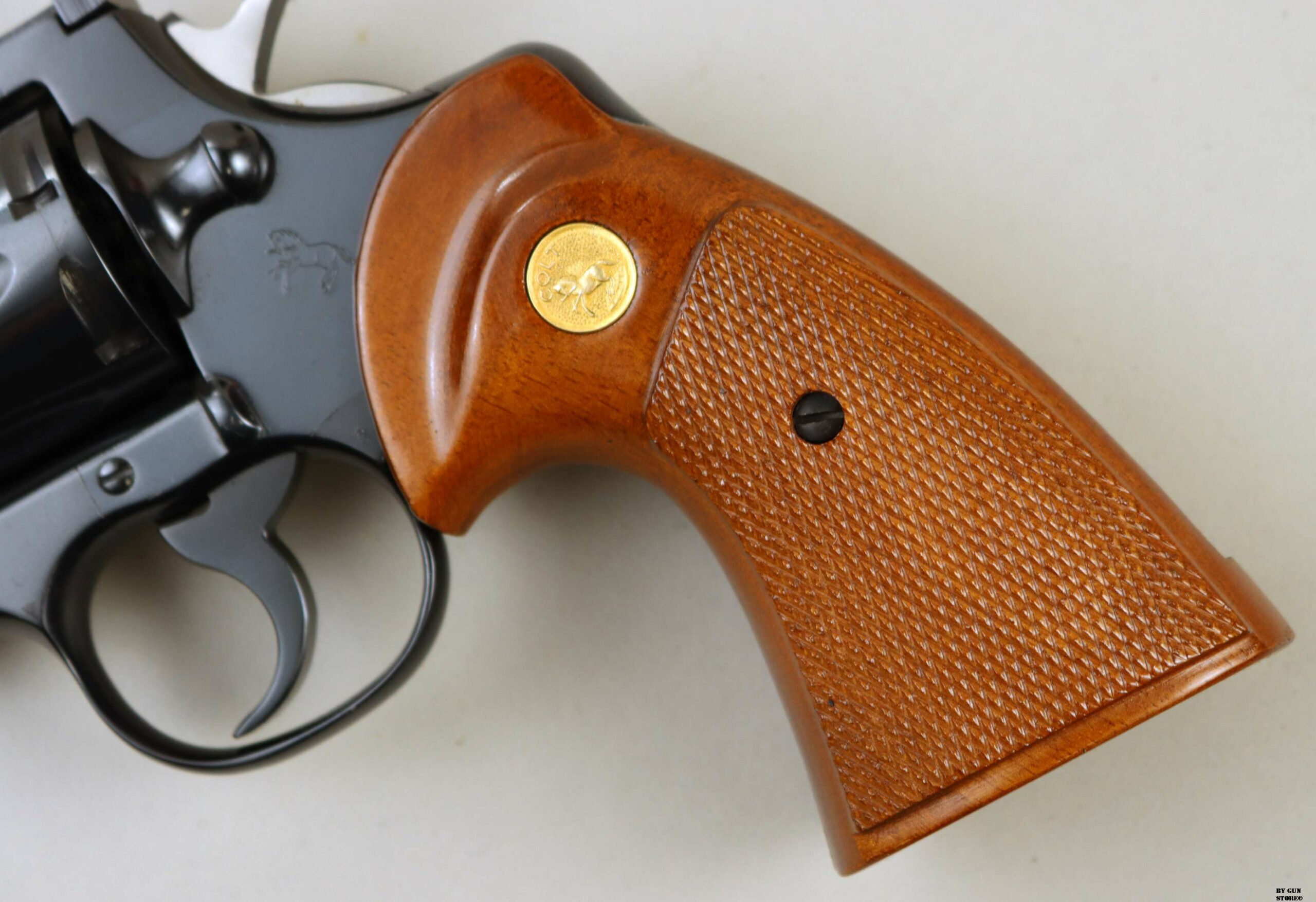 Splendido revolver Colt modello Python prodotto nello stabilimento di Hartford in Connecticut nel 1975. Importata e bancata a Gardone Valtrompia nello stesso anno (AA). Arma con una splendida brunitura “Royal Blue”, canna, meccanica, azione e timing perfette. Un classico pezzo da collezione con la canna da 6″. Guancette originali, coeve, con zigrini ottimi. Calibro. 357 Magnum. Arma che gode di classificazione ad uso sportivo.