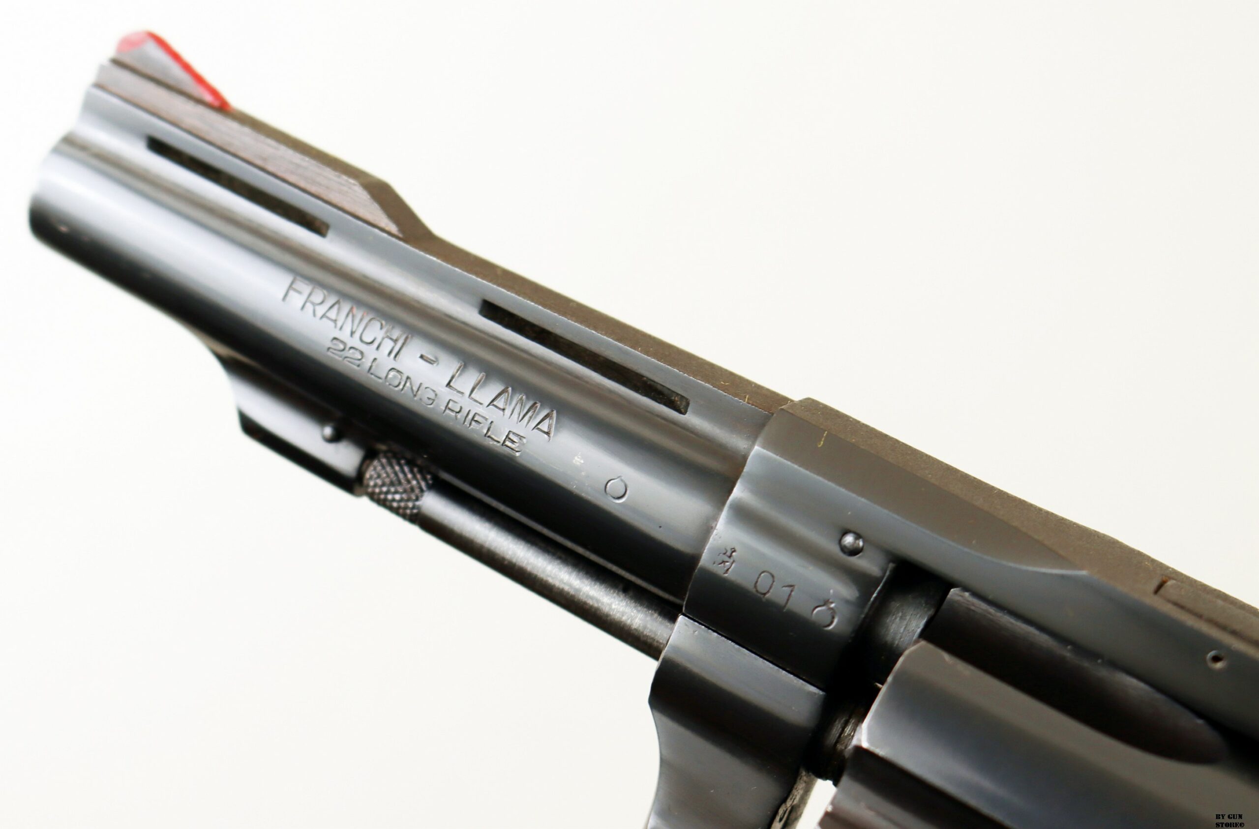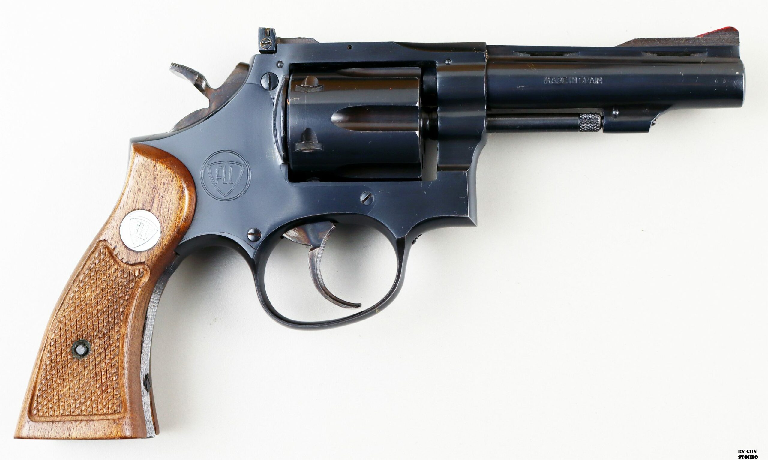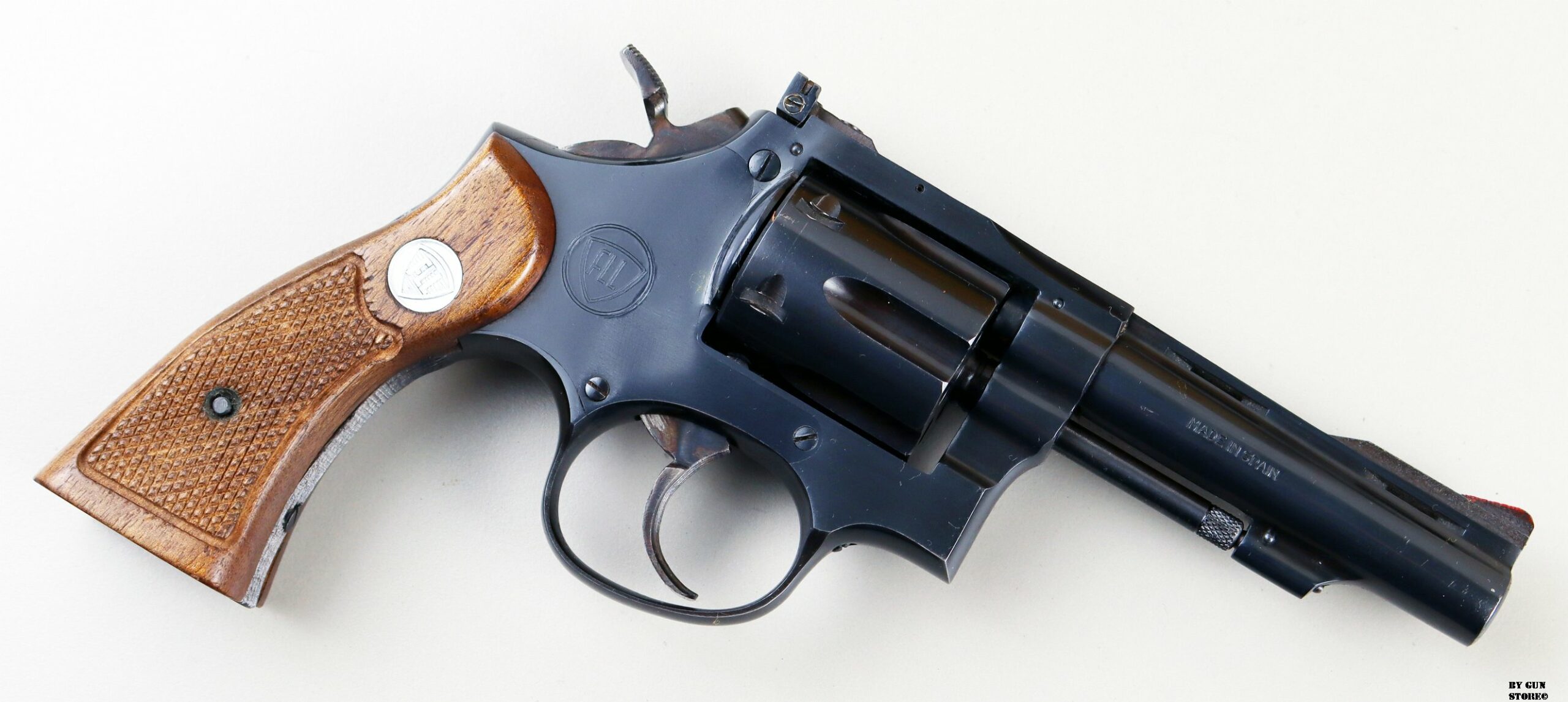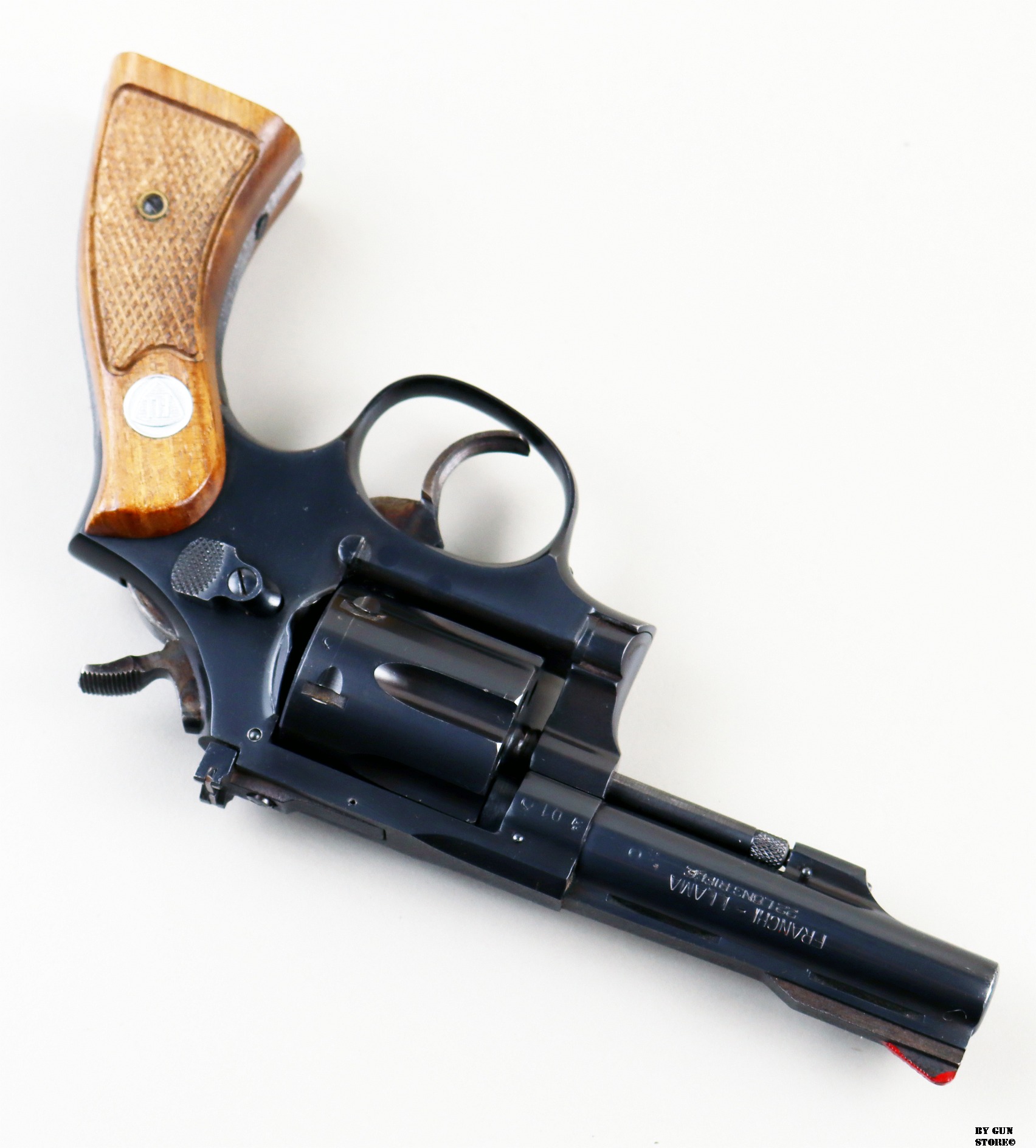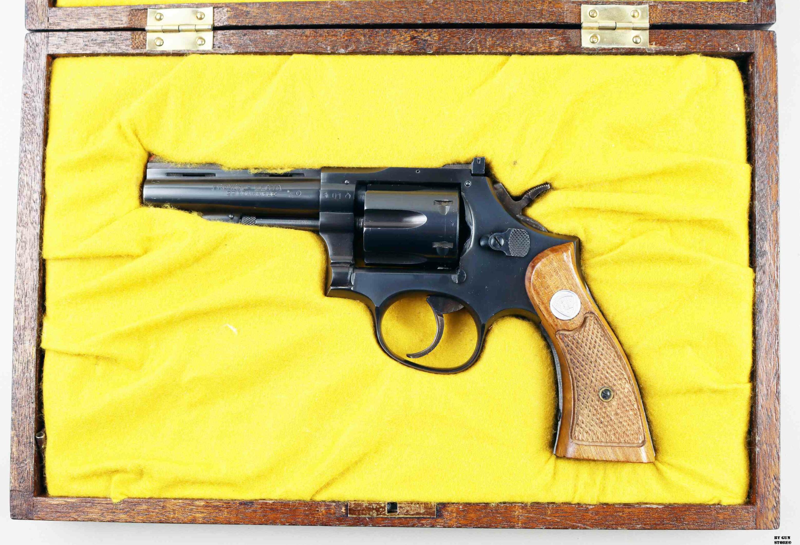 Ottimo e non comune revolver Franchi Llama in calibro .22 long rifle. Canna da 4″ con meccanica ottima. Versione tipo S&W con 5 viti, canna spinata e bindella forata con guancette square. Ottima per divertimento al poligono o difesa. Arma comune.