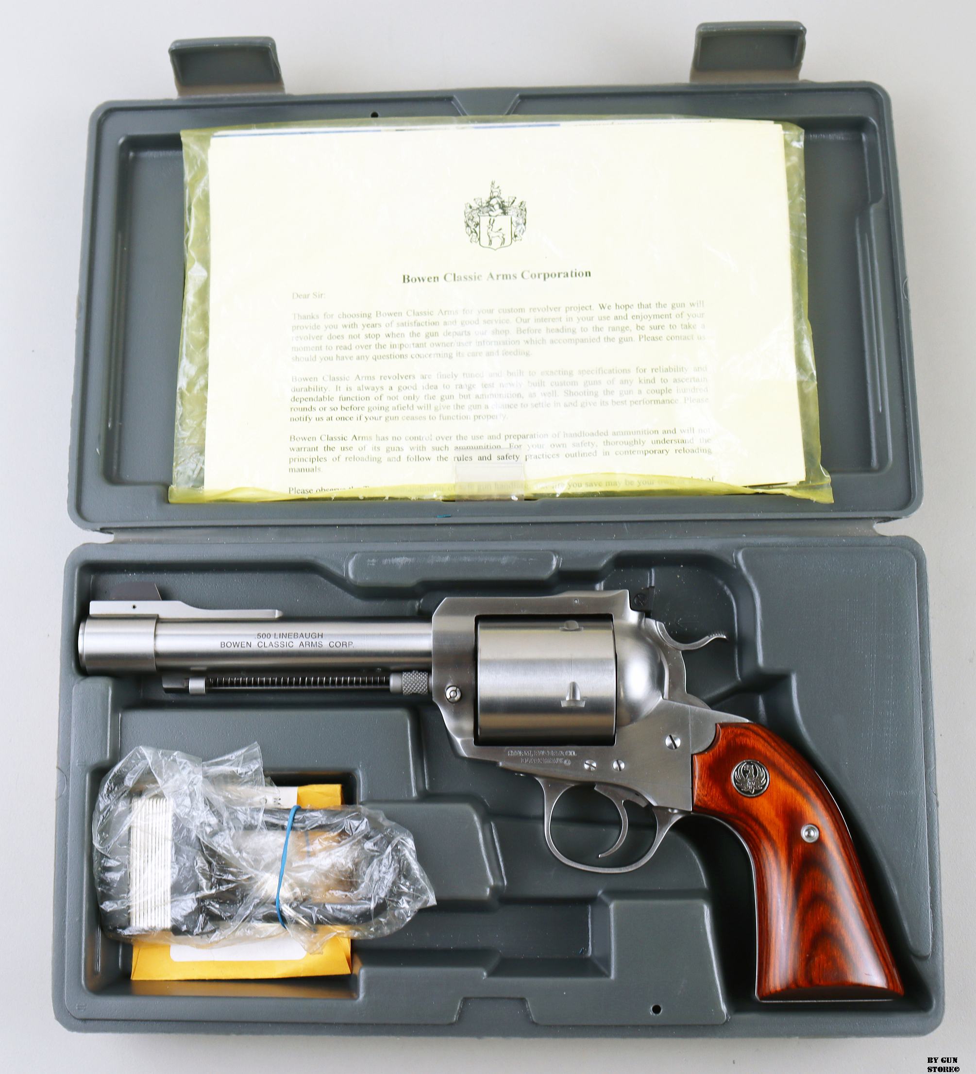 Una vera chimera per appassionati questo revolver Bowen Classic Arms in calibro .500 Linebaugh. Azienda che traspira un dna esageratamente a stelle e striscie; fondata nel 1980 da Hamilton S. Bowen, si è sempre contraddistinta prima per la customizzazione e poi per la realizzazione di revolver di grosso calibro. Le armi realizzate da Mr. Bowen sono una commistione di parti già esistenti (es. produzioni Colt e Ruger) con componenti realizzati al proprio interno come i famosi tamburi a 5 colpi utilizzati per gestire i calibri più esuberanti. Quello che proponiamo è proprio una “Model 7″ con canna da 5” 1/2 che monta uno dei famosi tamburi custom su di castello Ruger (da sempre famosa per la leadership nella qualità della microfusione) in condizioni pari al nuovo. Il calibro, anch’esso un’invenzione del sig. Bowen, è il .500 Linebaugh che viene definito “rabbioso” ma secondo John Linebaugh “portabile”. Per la realizzazione di questo revolver il pacchetto di elaborazioni definito “Nimrod Conversion” comprende: