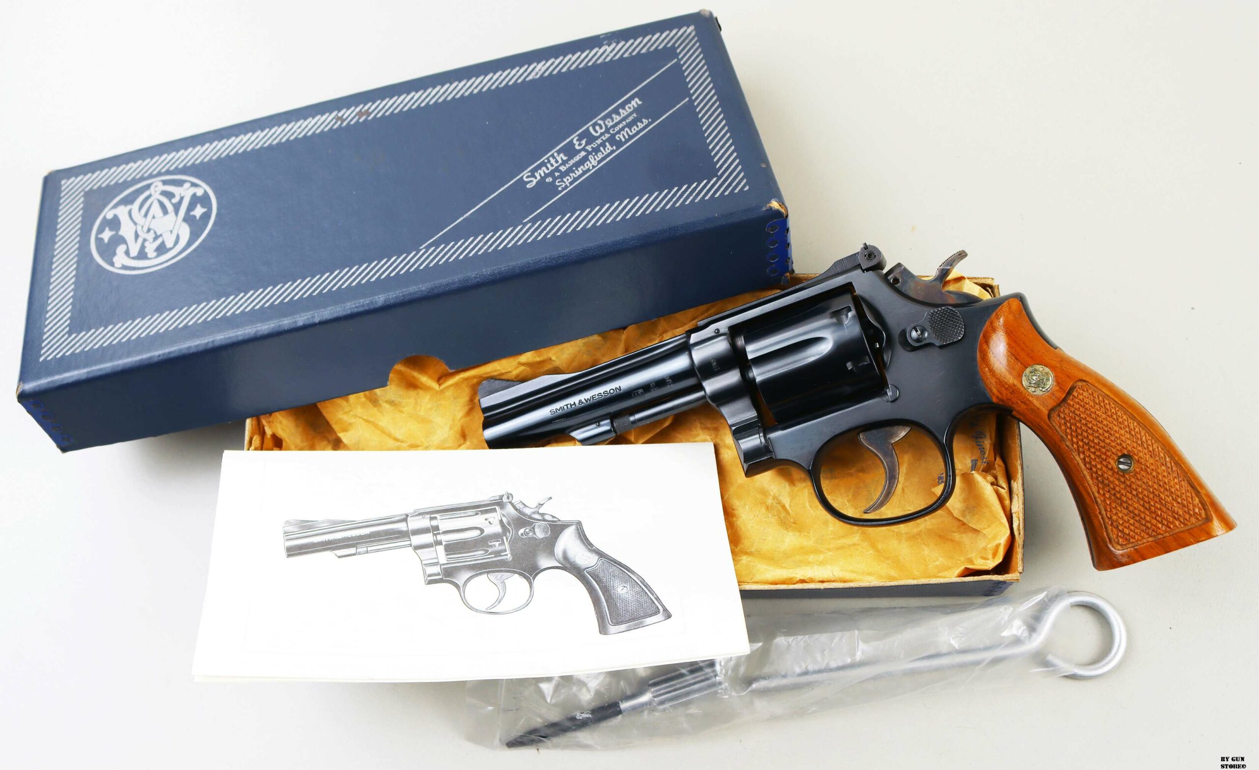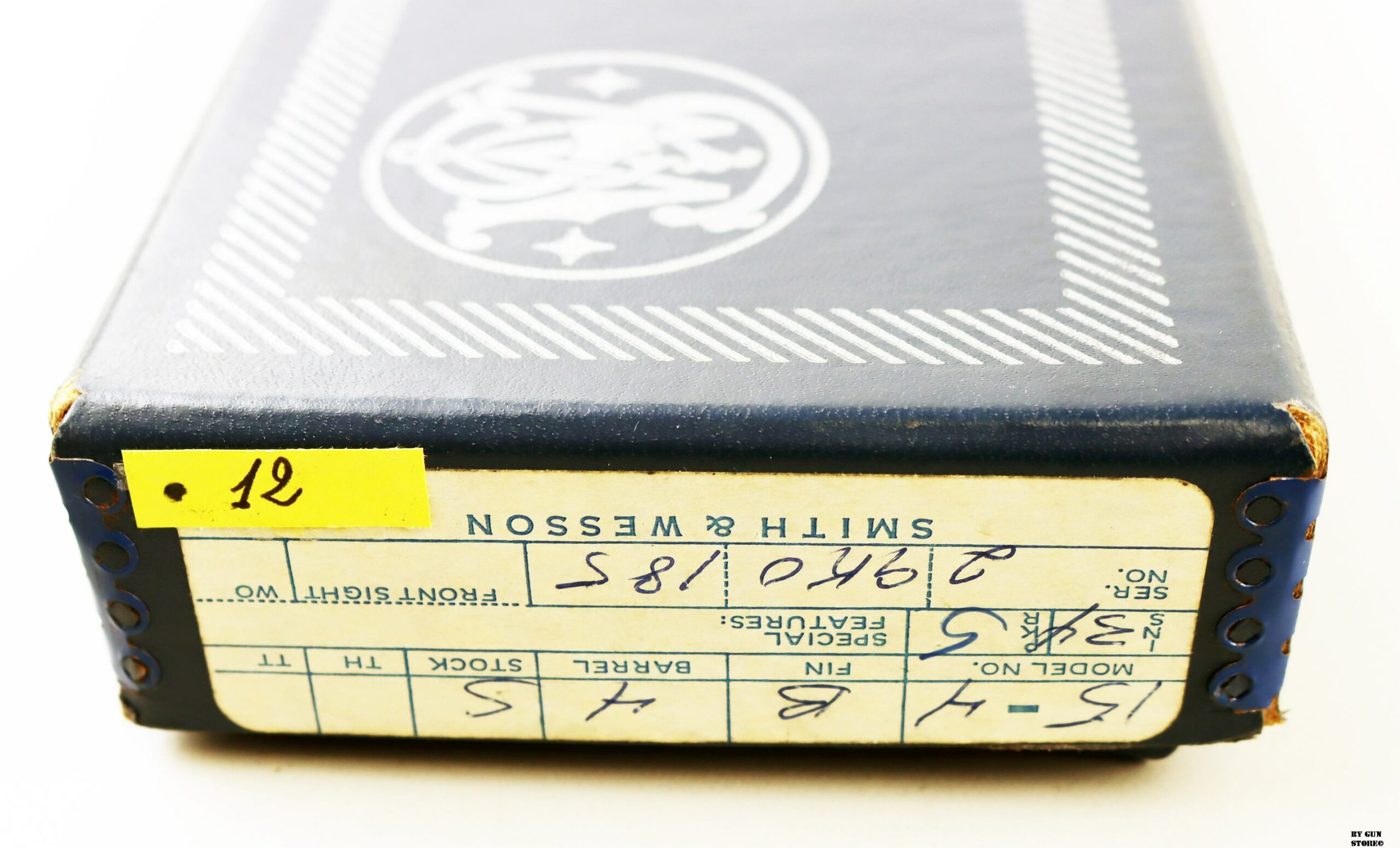 Anno 1979 (AE) per questo splendido revolver Smith & Wesson modello 15-4. Canna meccanica e azione ottime. Brunitura originale, canna spinata. In dotazione la scatola originale e matricolata con i documenti originali e accessori. Ideale per difesa o divertimento al poligono. Calibro .38 Special. Arma Comune,