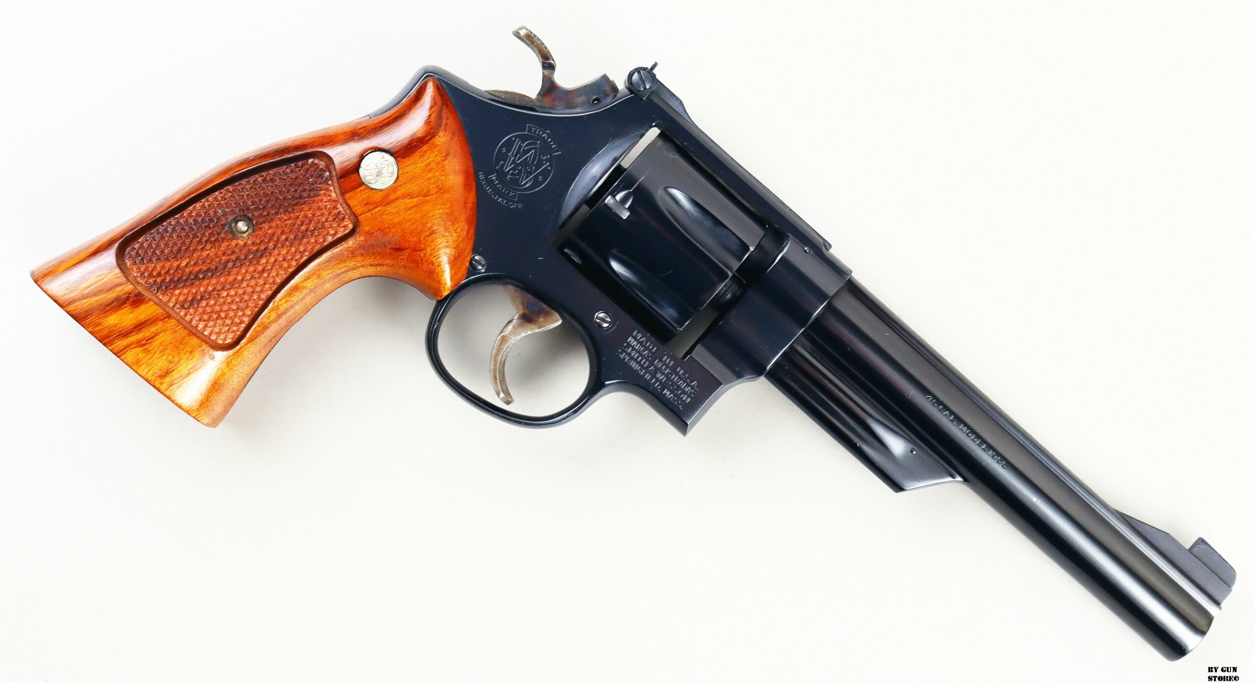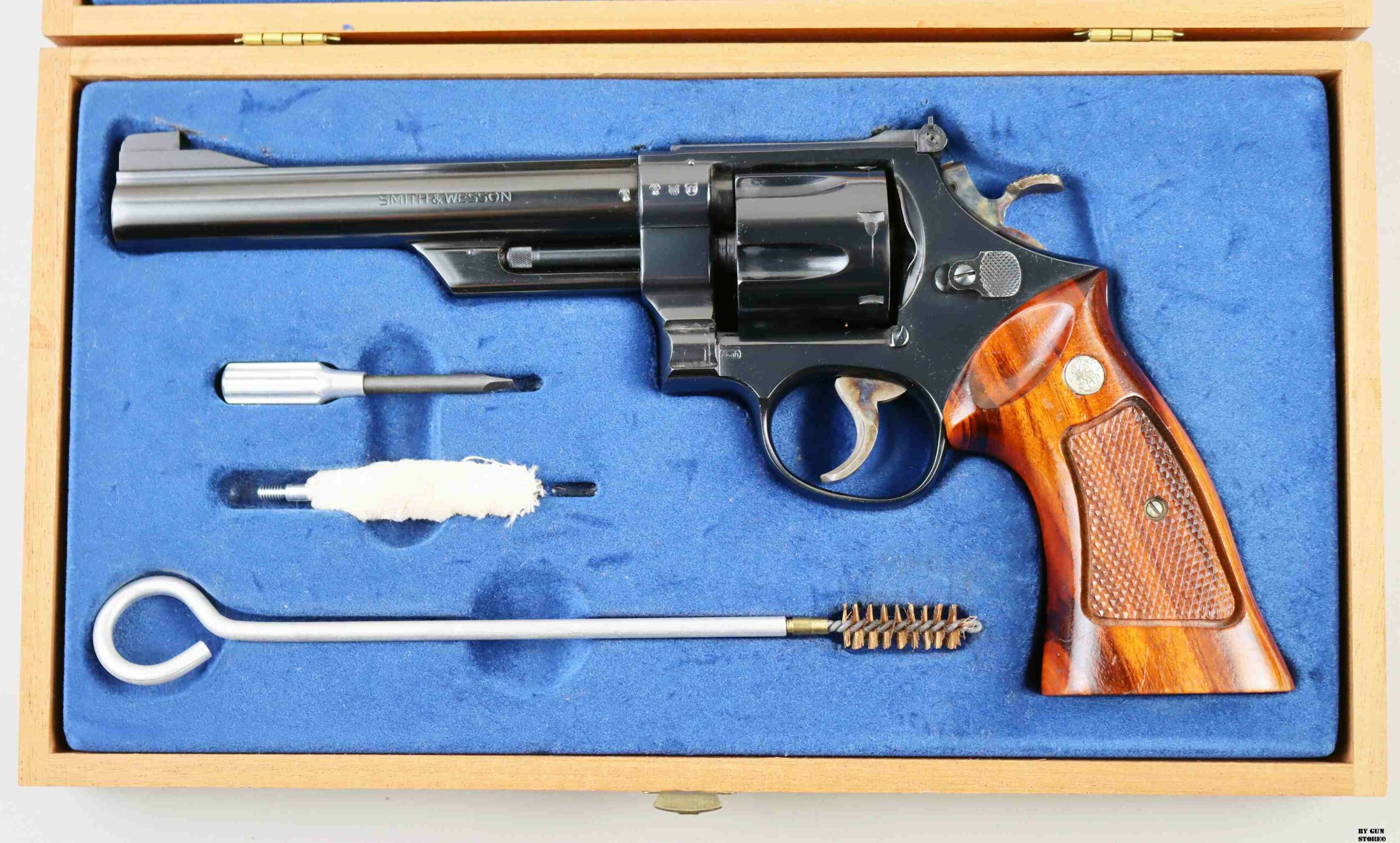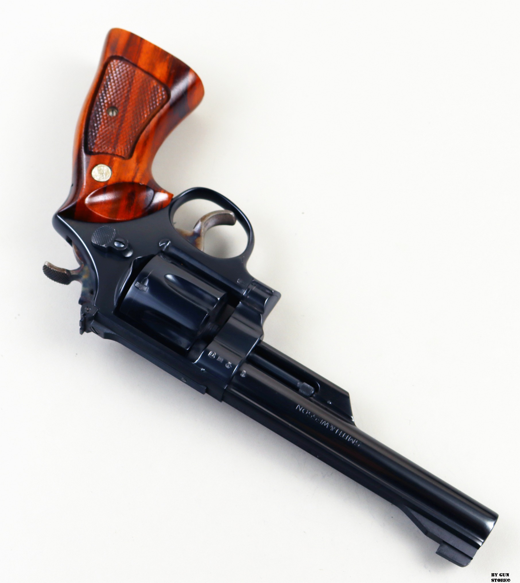 Anno 1977. Splendido revolver S&W mod. 25-2 (1955 .45 Target Revolver) nel non consueto calibro .45 ACP. Condizioni eccellenti, meccanica e timing perfetti, canna spinata da 6″ 1/2 a specchio e con ottime rigature. Arma con brunitura 100%, tacca di mira regolabile, cane e grilletto tartarugati in versione target e guancette in legno di rosa originali ed intonse. In cassetta originale di legno completa di tutta la dotazione di fabbrica.